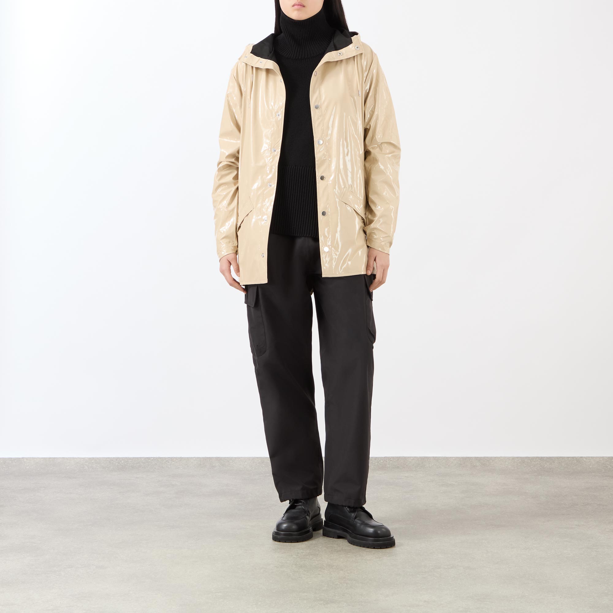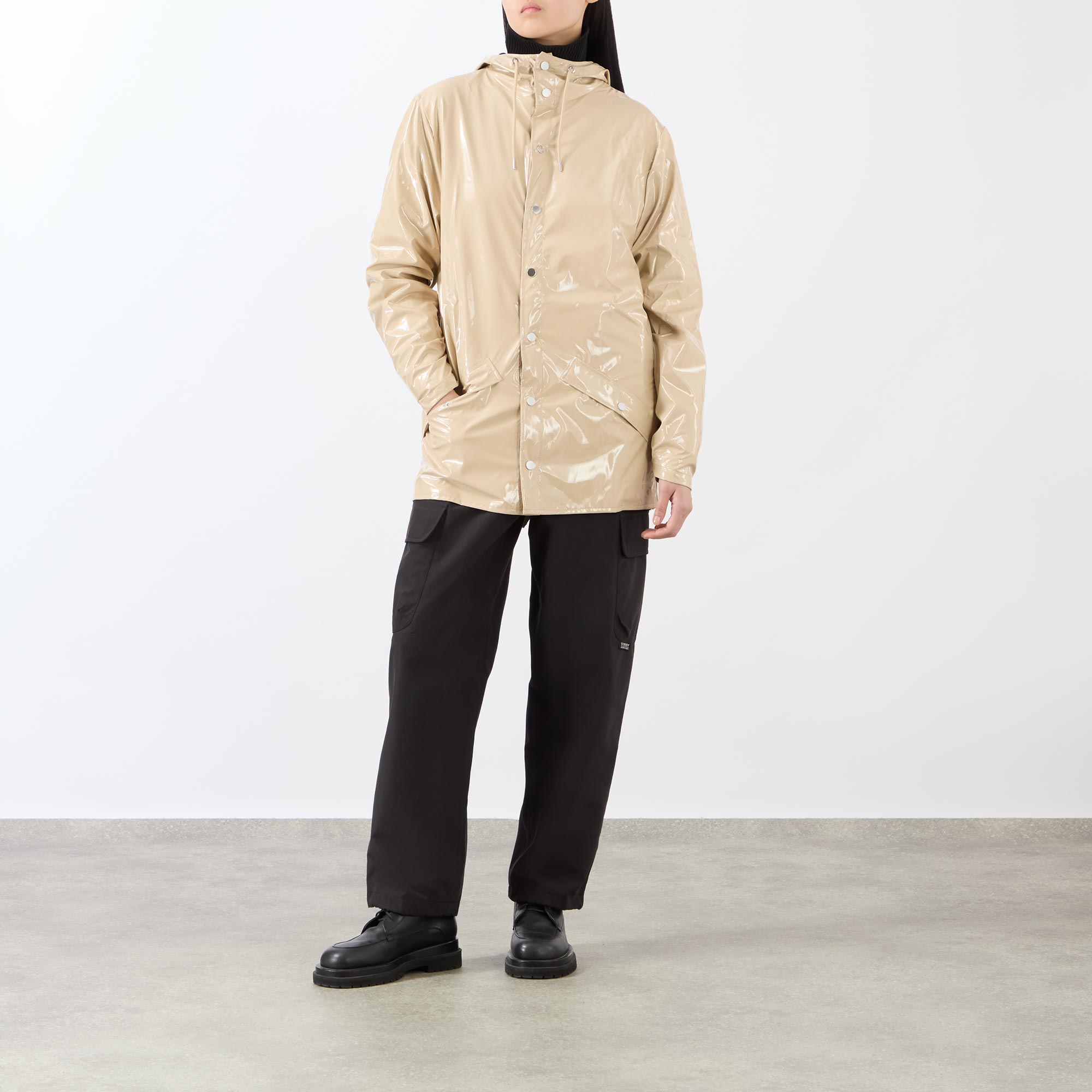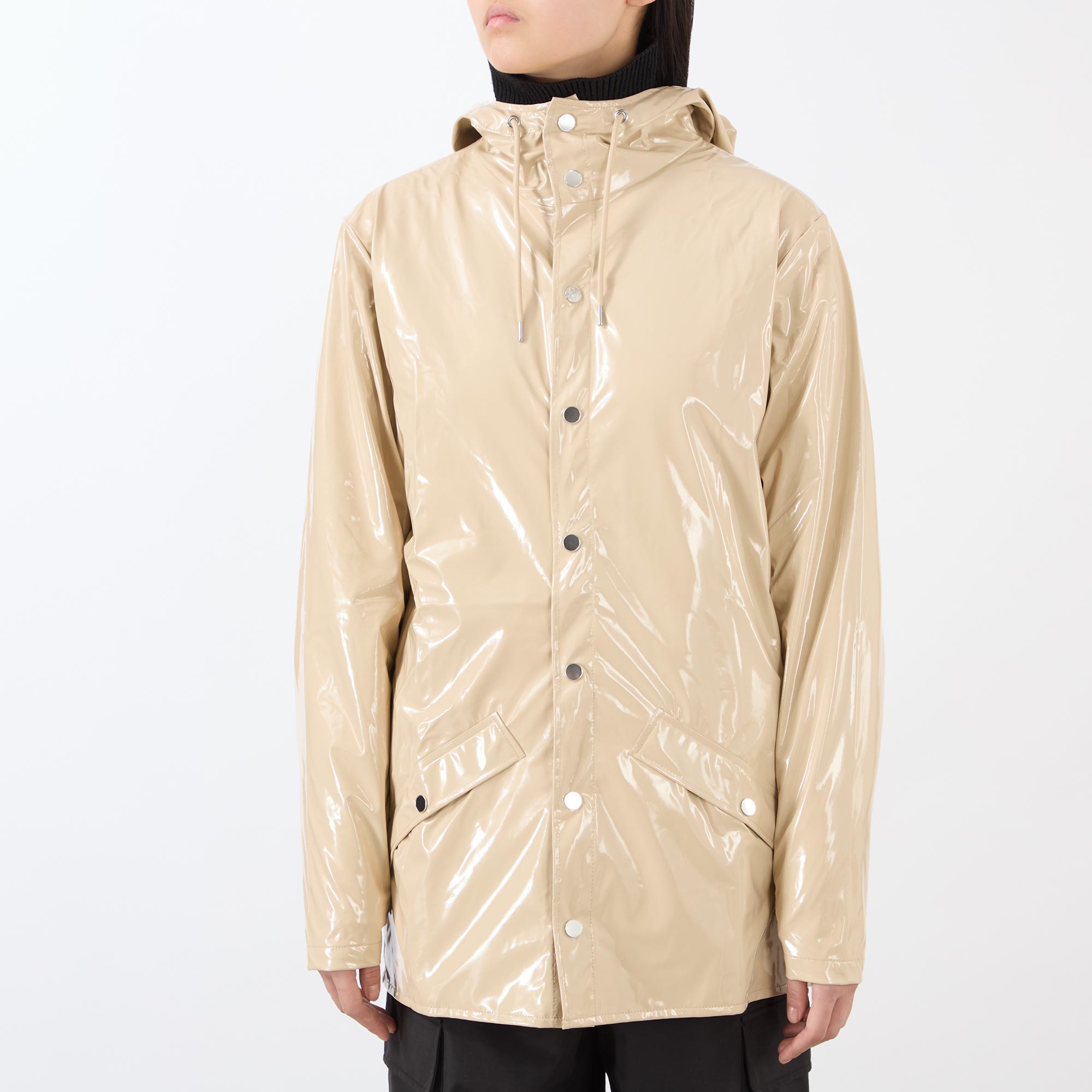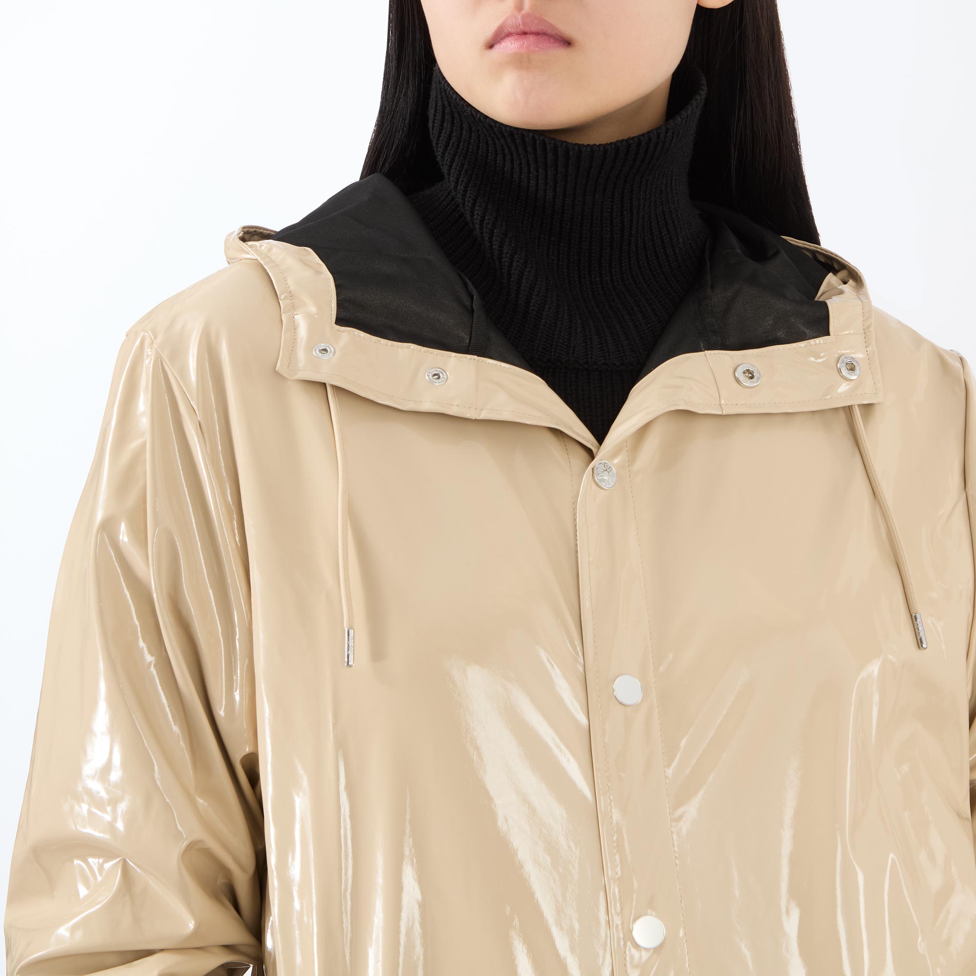 • Hood with adjustable drawstring fastening, built-in cap, long sleeves, front snap button fastening, two side flap pockets with snap button closures, high low hem, storm flap, concealed vents, welded seams, patent finish, lined