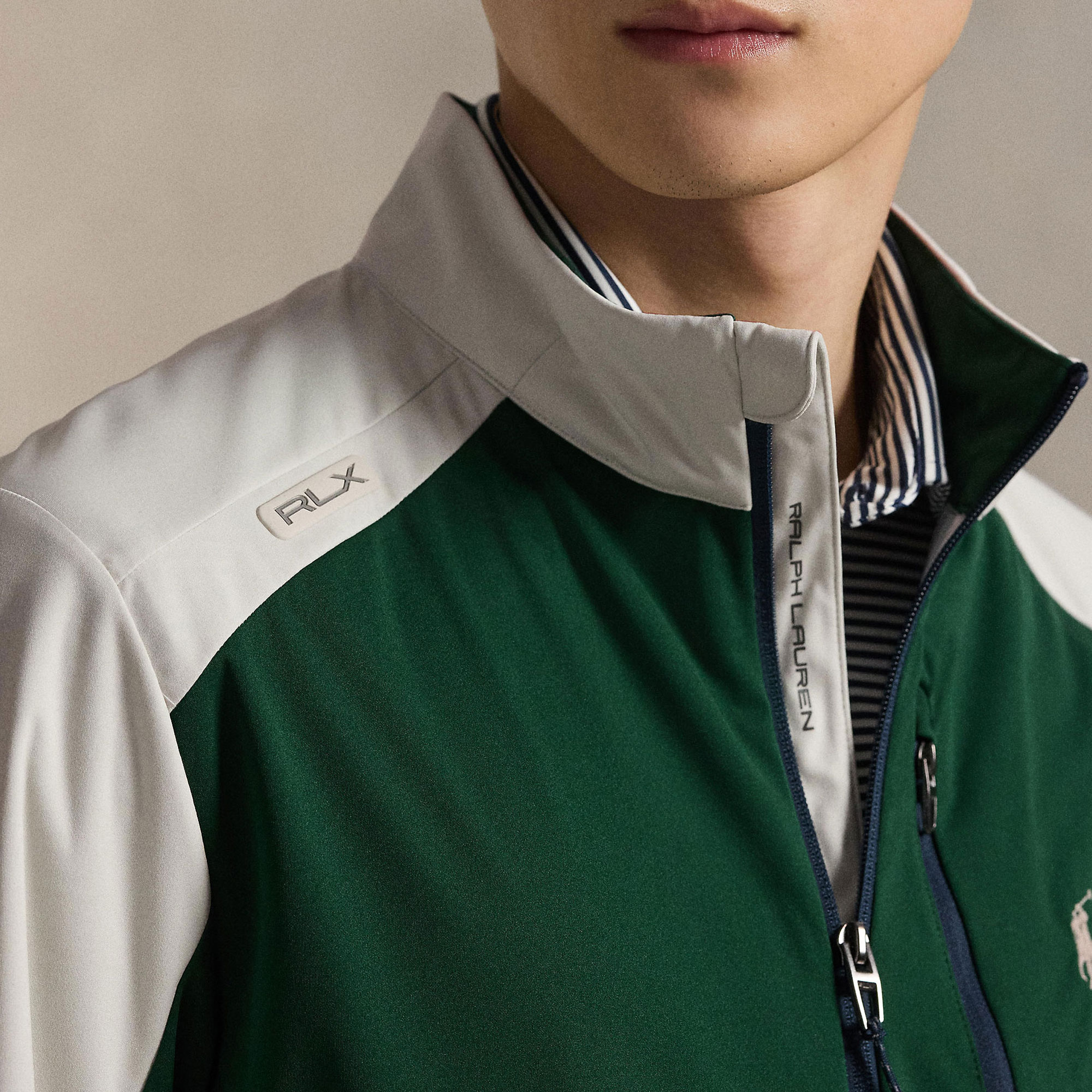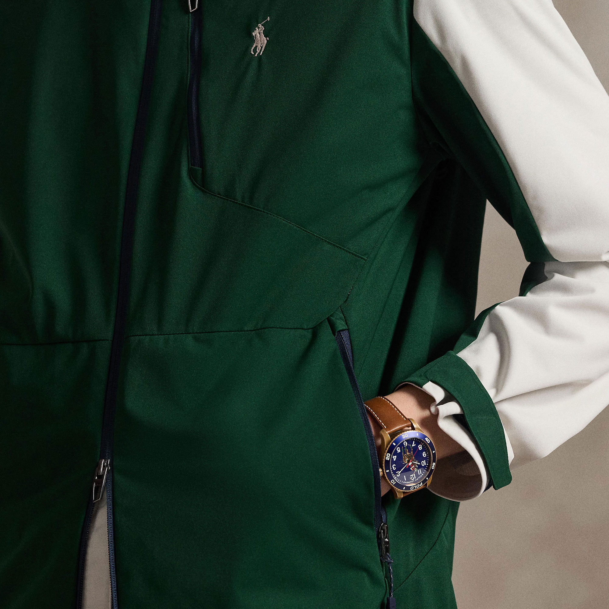 - Mock neckline, two-way full-zip front, front flap to prevent chafing, logo zip tabs, long sleeves, adjustable hook-and-loop cuff tabs, ventilating eyelets at the underarms, left chest zipped pocket, two front waist zipped pockets, internal scorecard pocket, packable, silicone logo tab, logo-printed internal placket, stretch-fused binding, unlined, signature embroidered Pony logo detail
