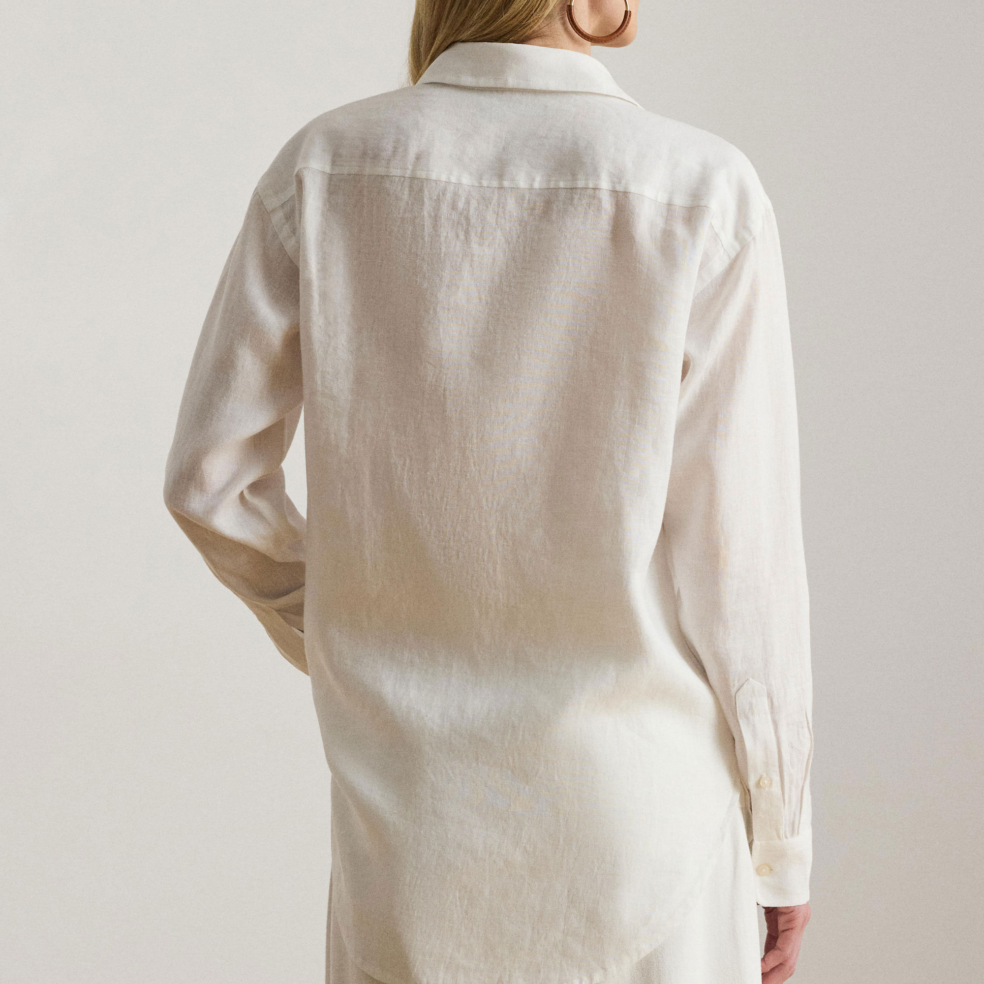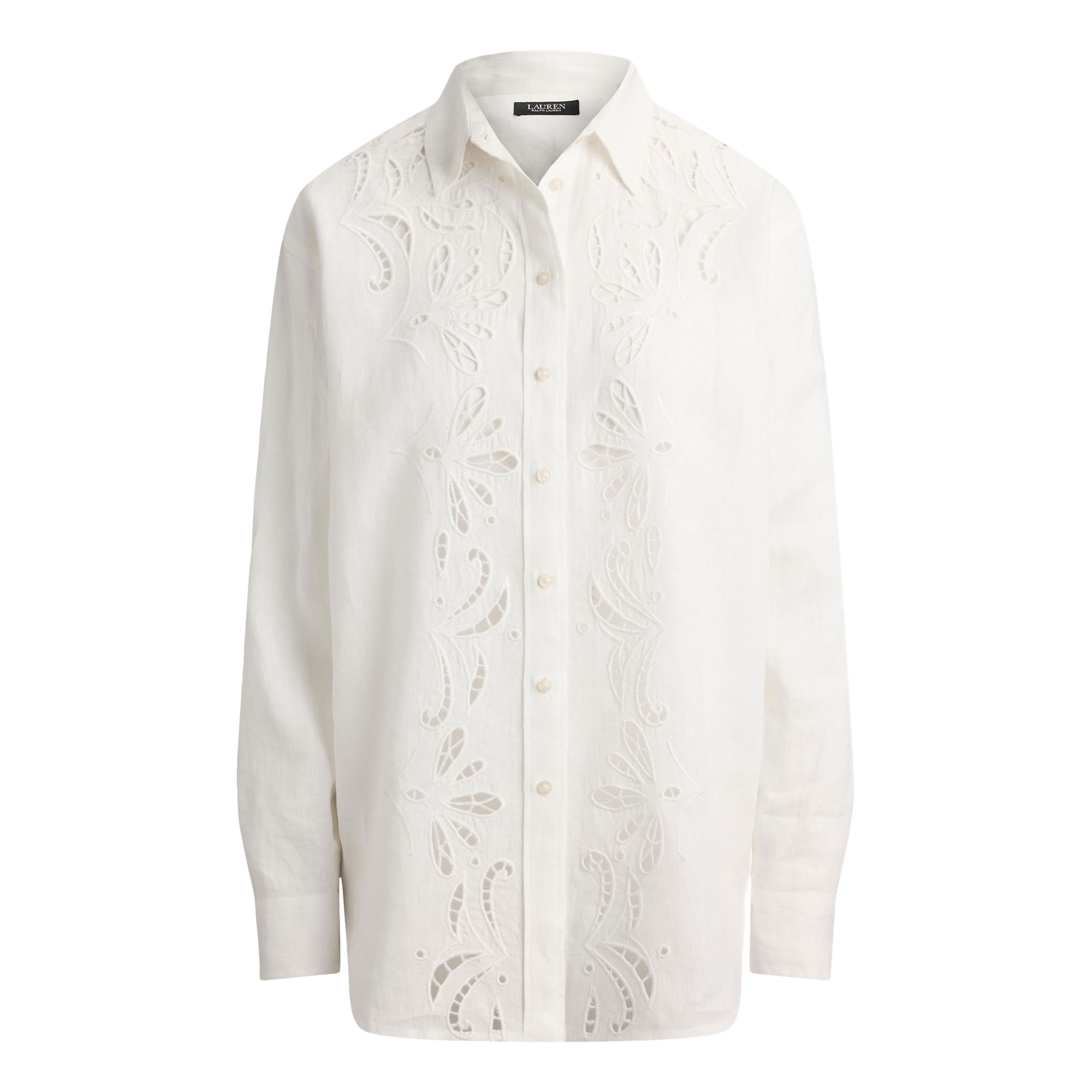 - Long sleeves with buttoned barrel cuffs, dropped shoulders, eyelet embroidery along each side of the placket, curved back yoke, shirttail hem, unlined