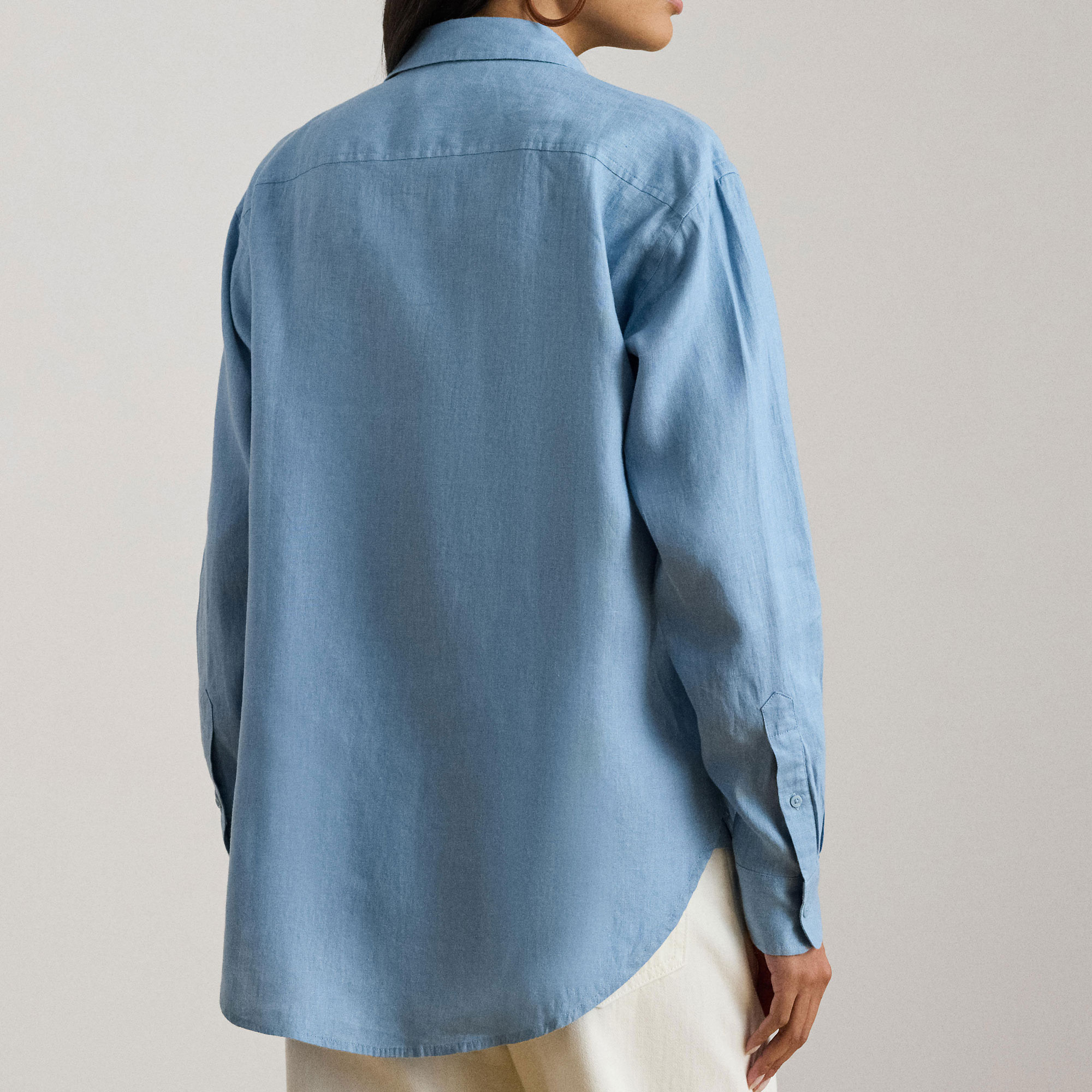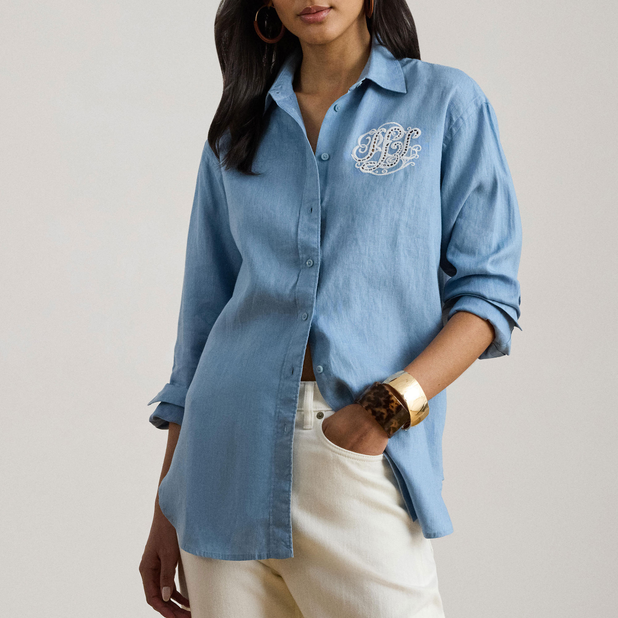 - Long sleeves with buttoned barrel cuffs, dropped shoulders, oversized script eyelet-embroidered logo at the left chest, back yoke, shirttail hem