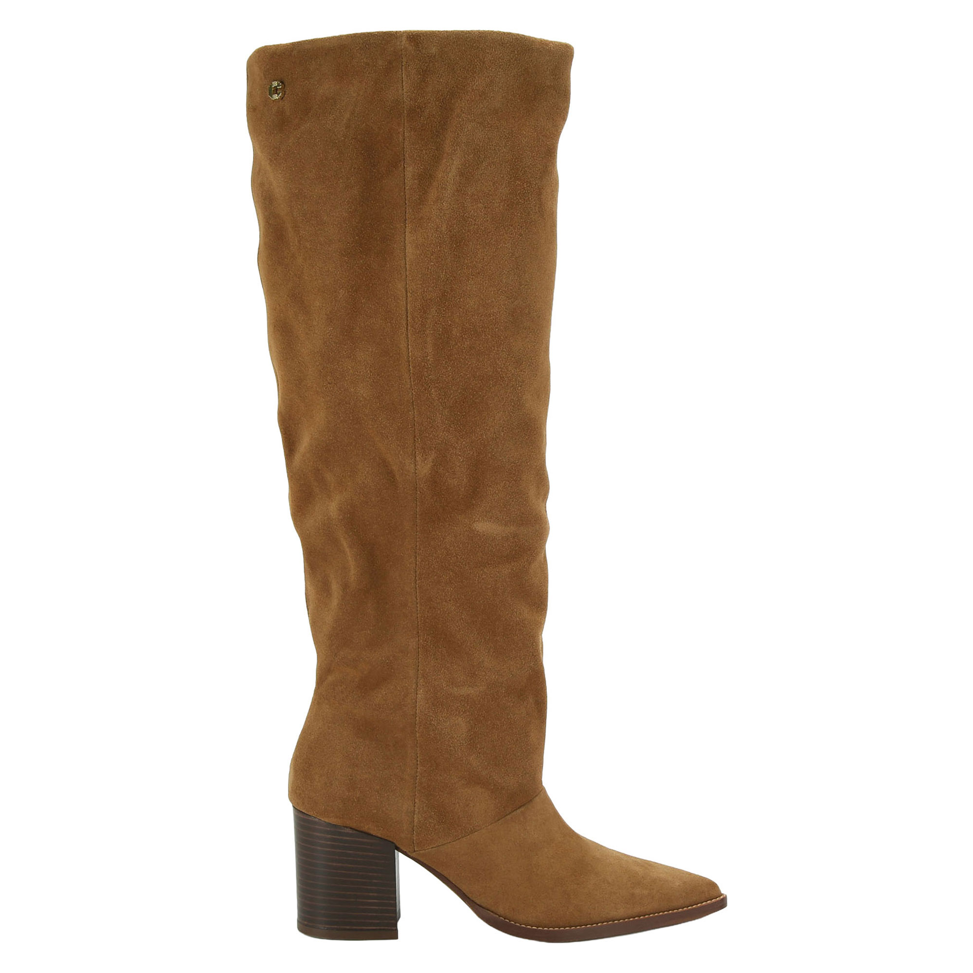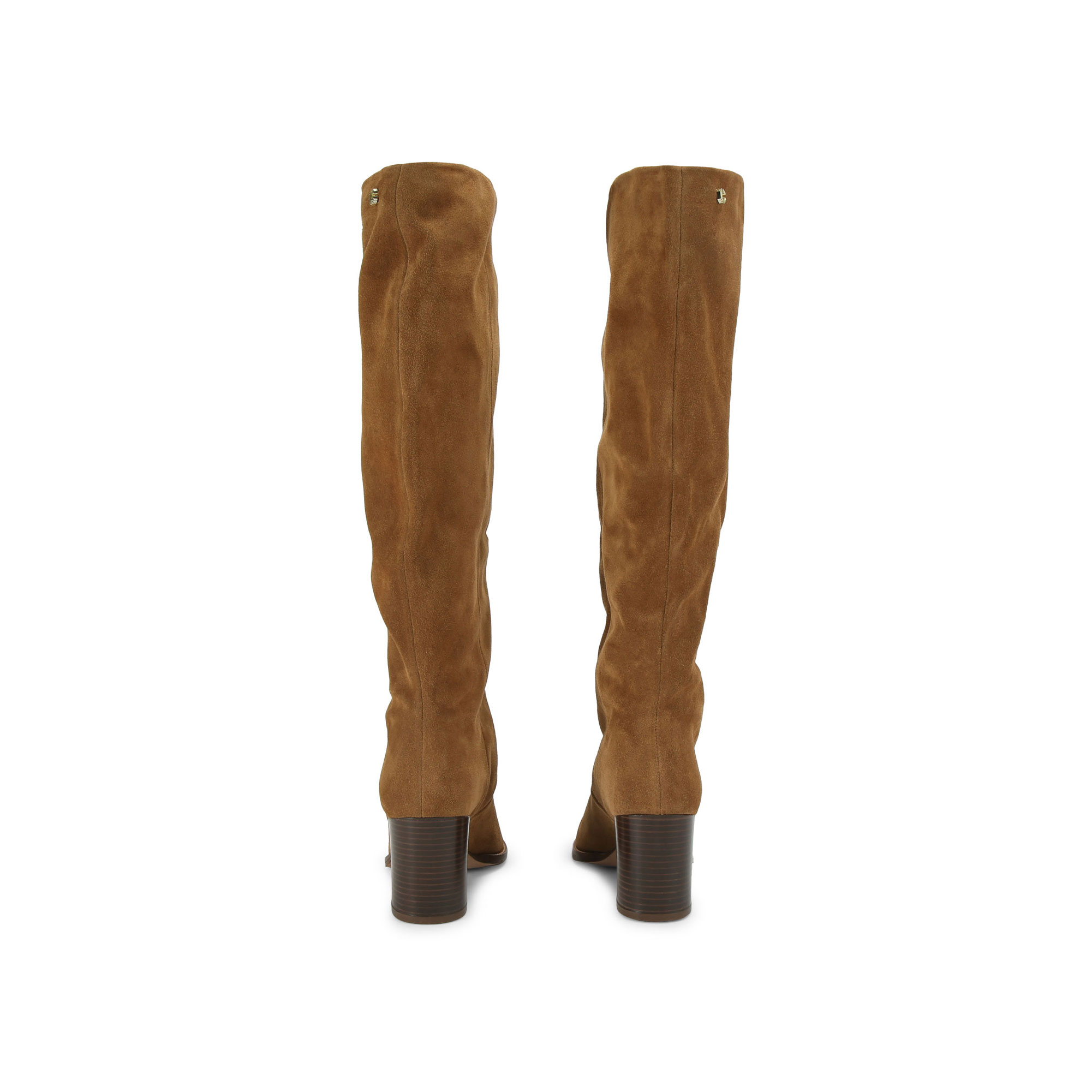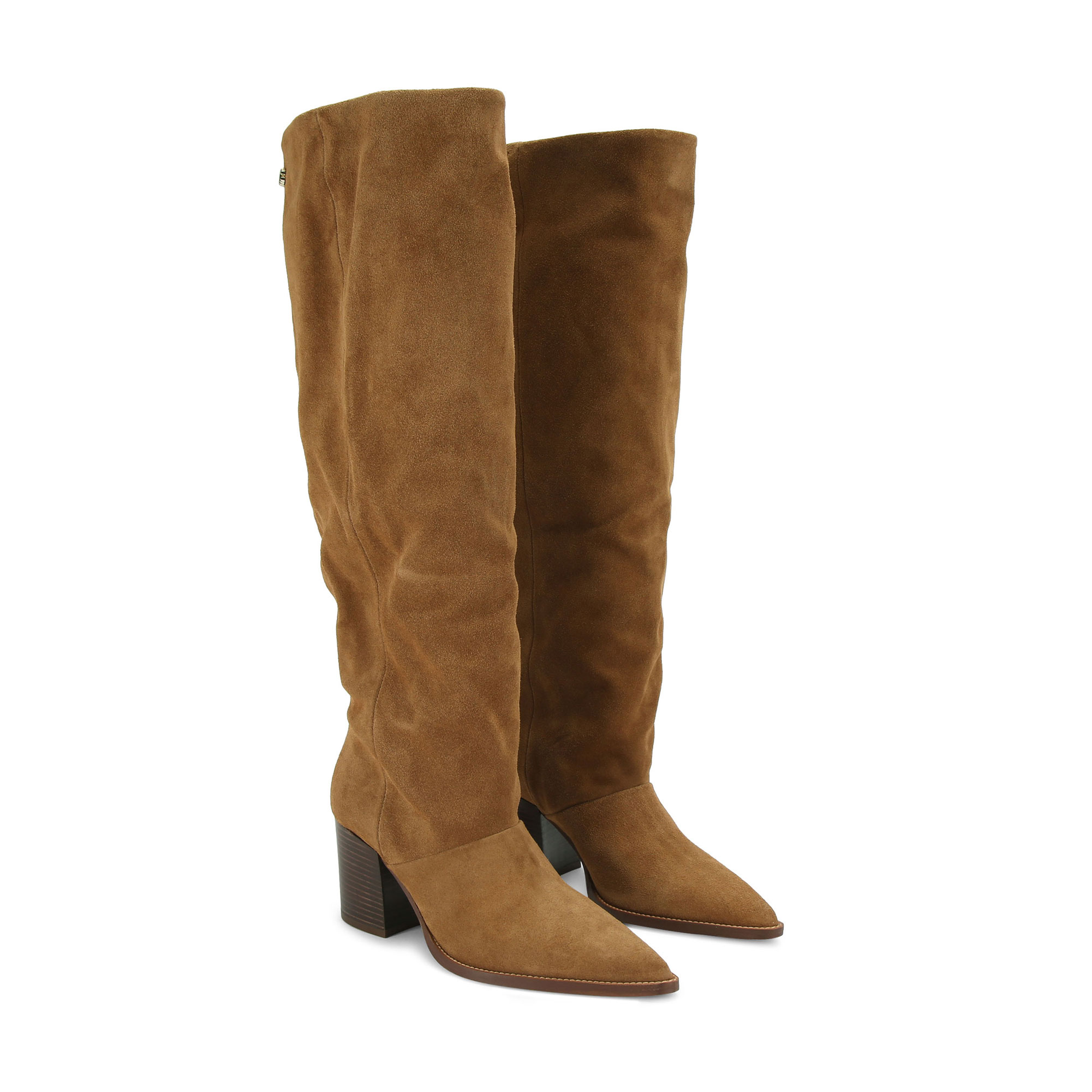- Knee-high style, suede leather, pointed toe, wood-effect heel