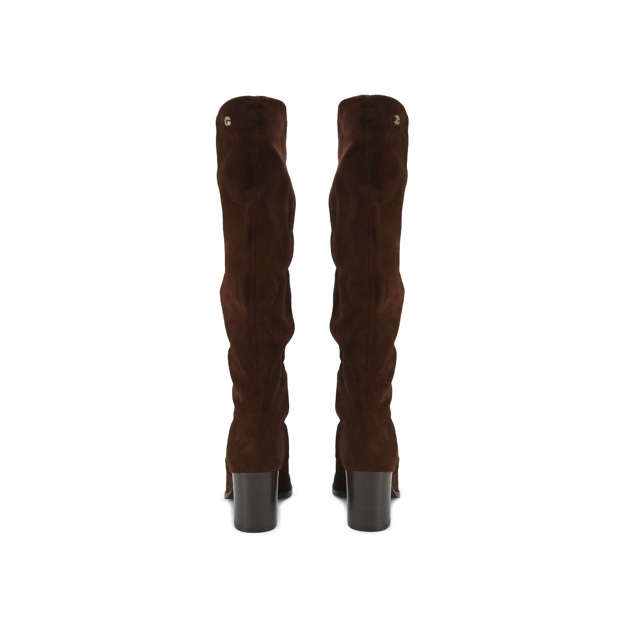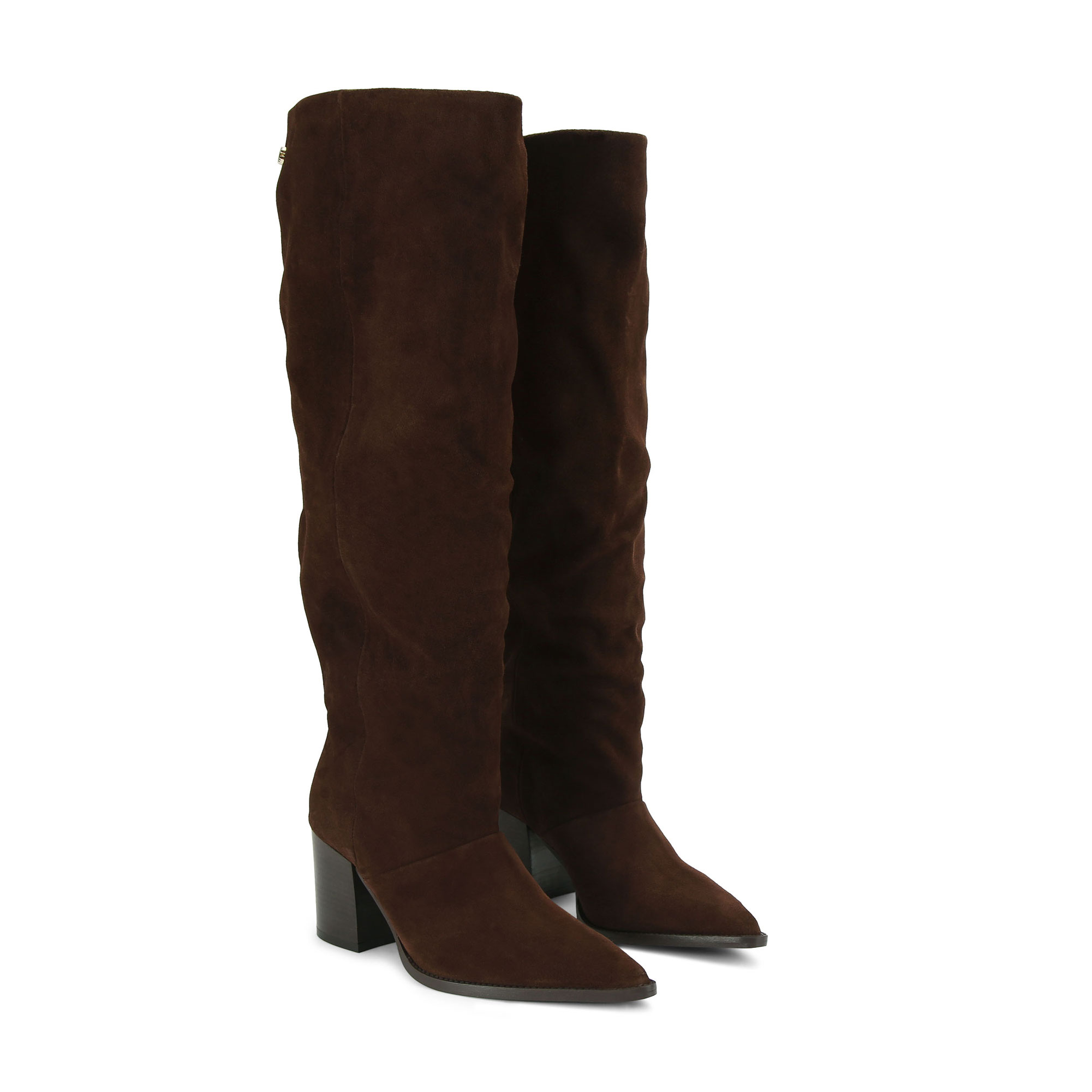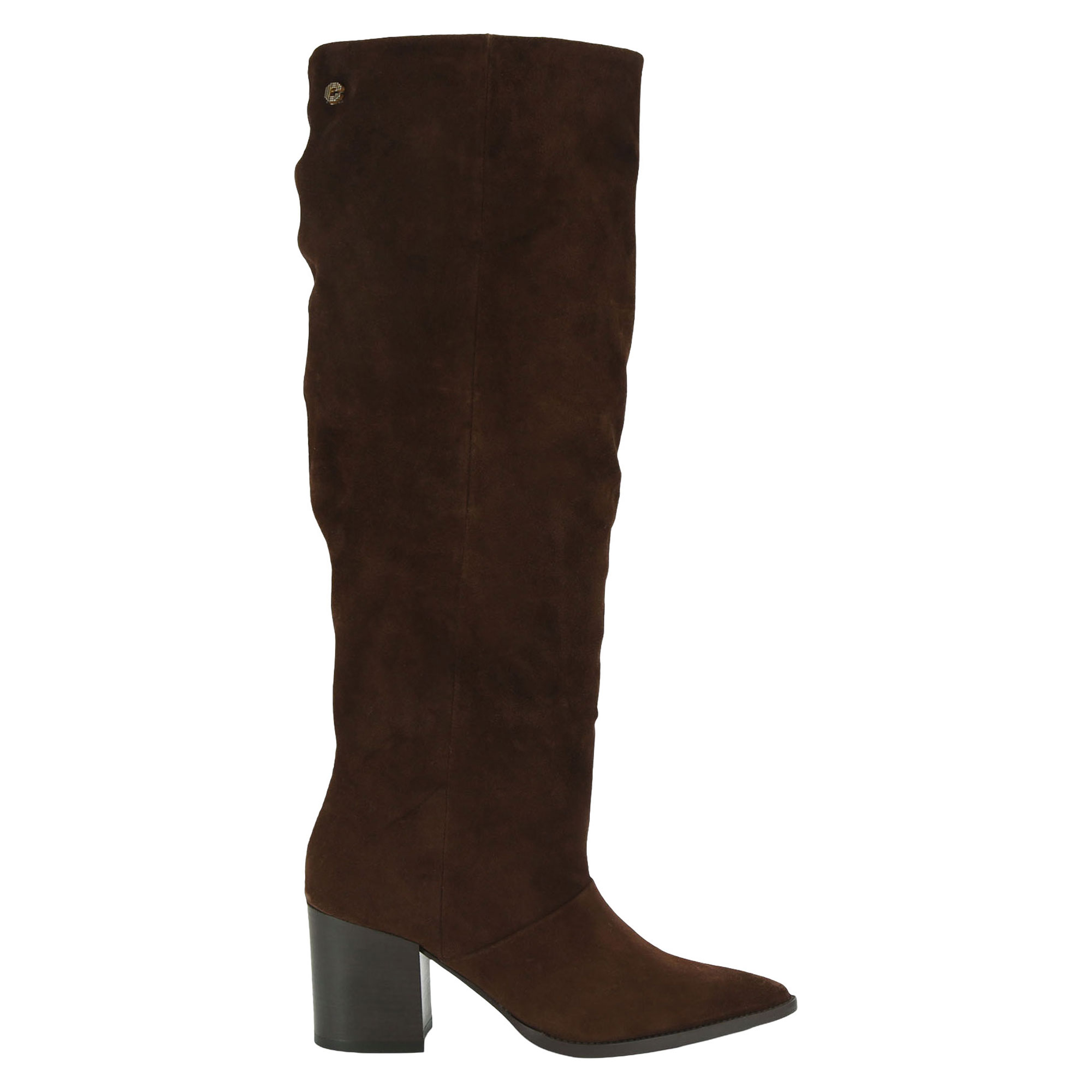 - Knee-high style, suede leather, pointed toe, wood-effect heel