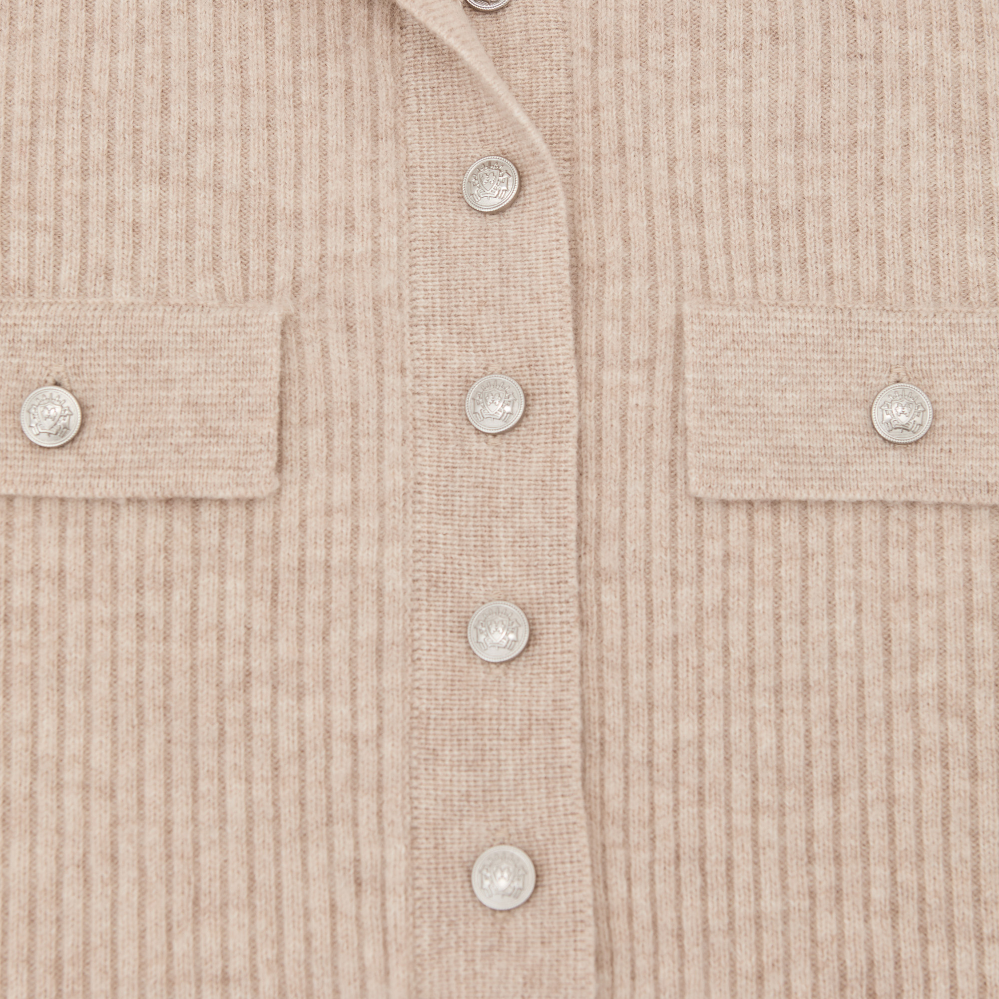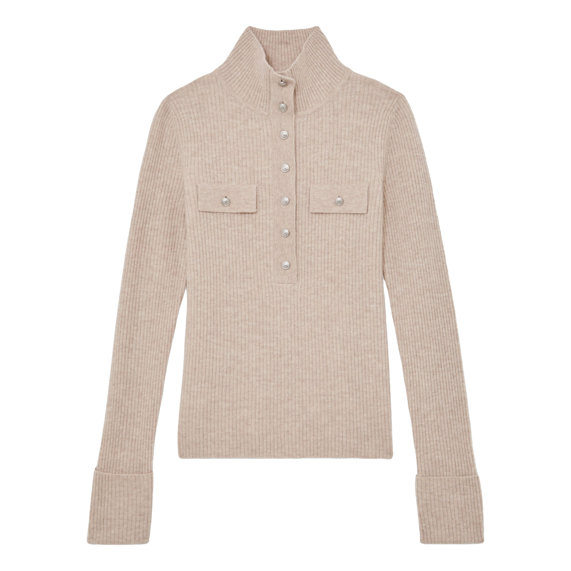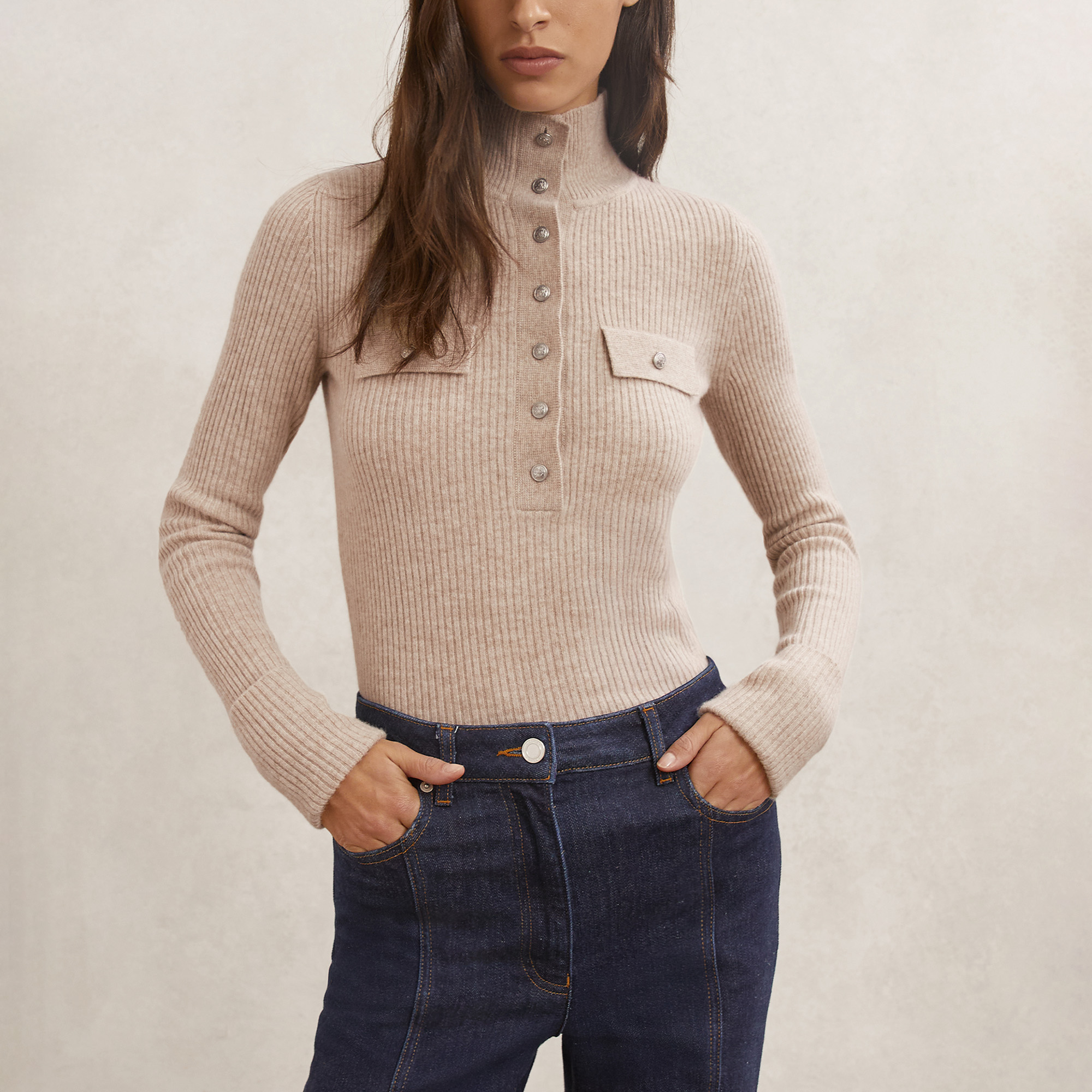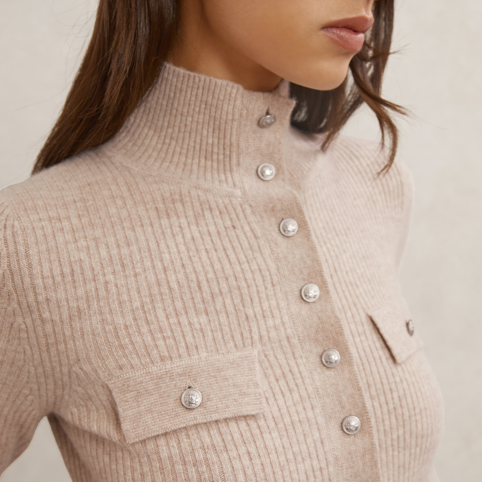 - Rib-knit design, soft feel, wool construction, funnel neckline, turn-up cuffs, crest-embossed buttons, pocket flaps, half-button placket, long sleeves