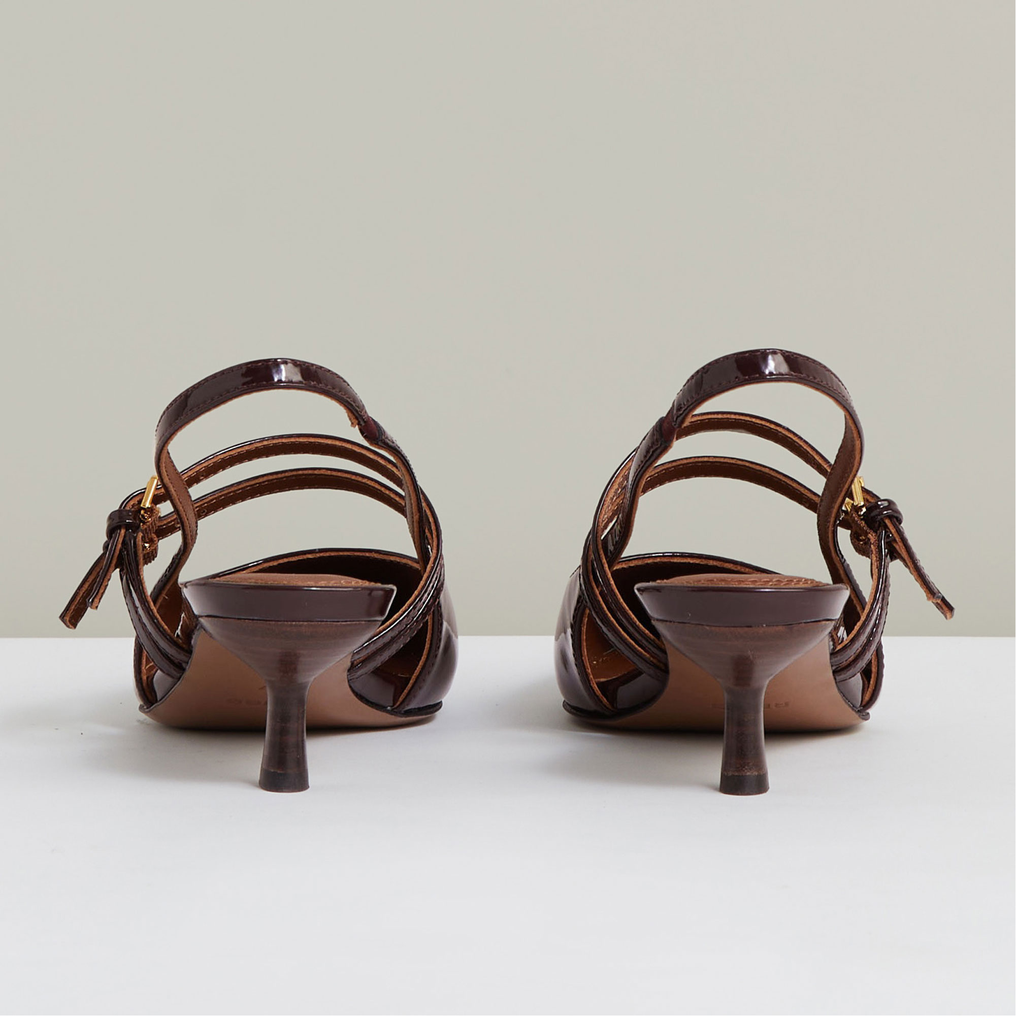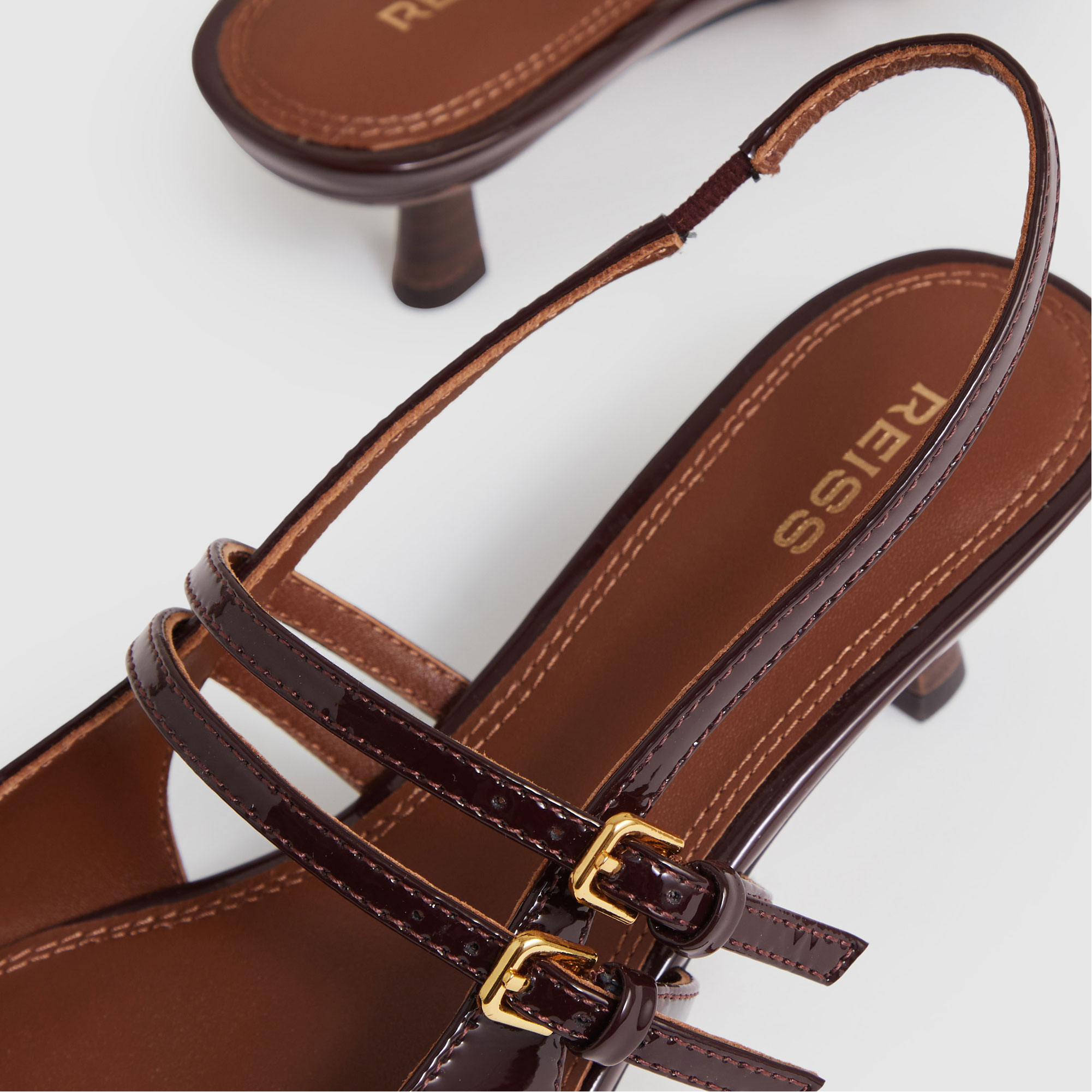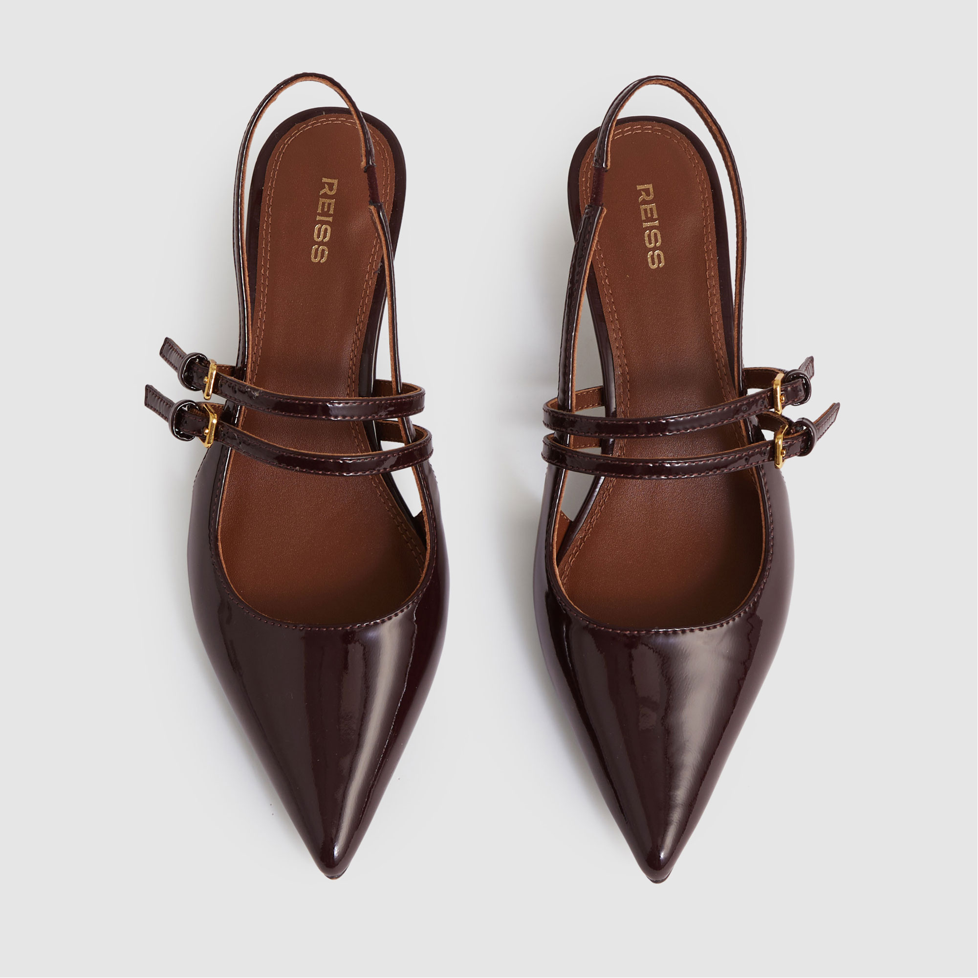 - Slingback strap, double straps across foot, buckle details, pointed toe, kitten heel