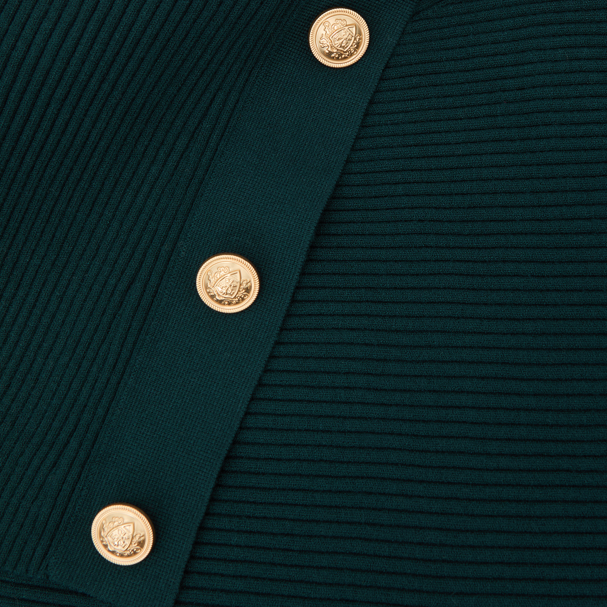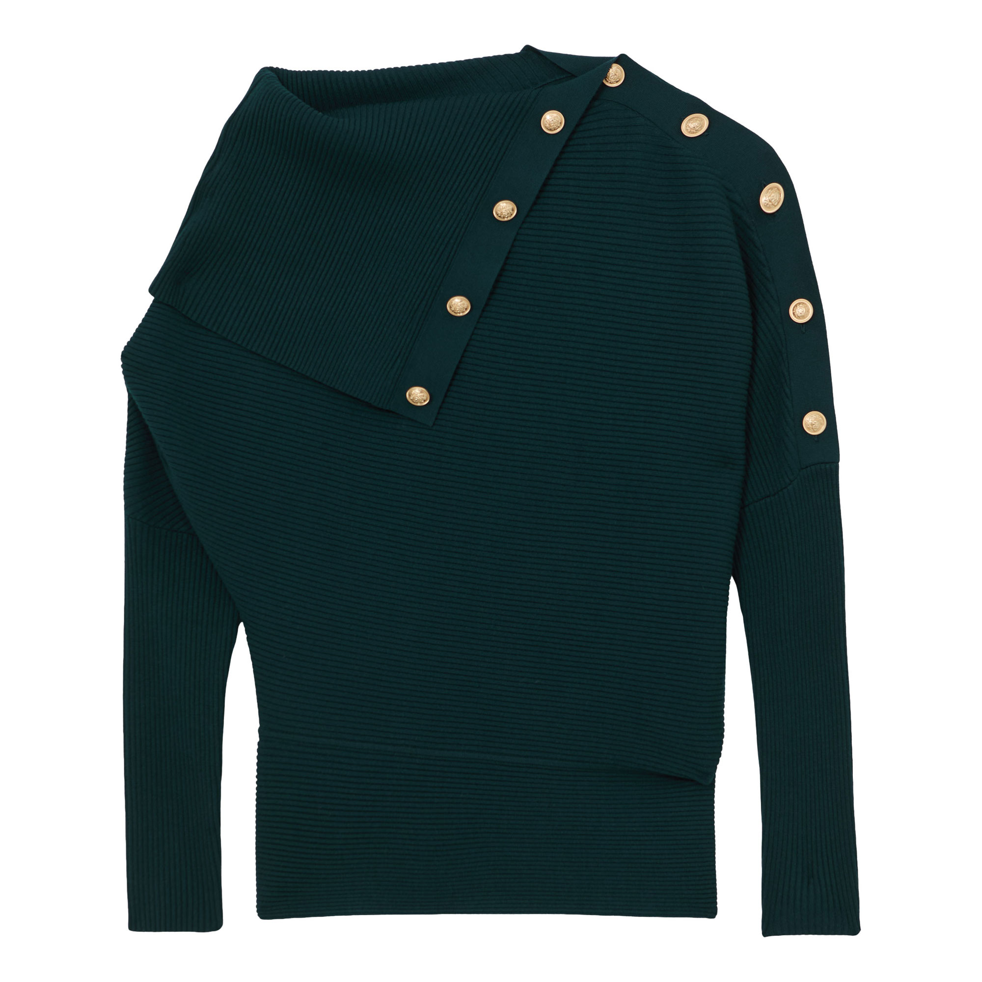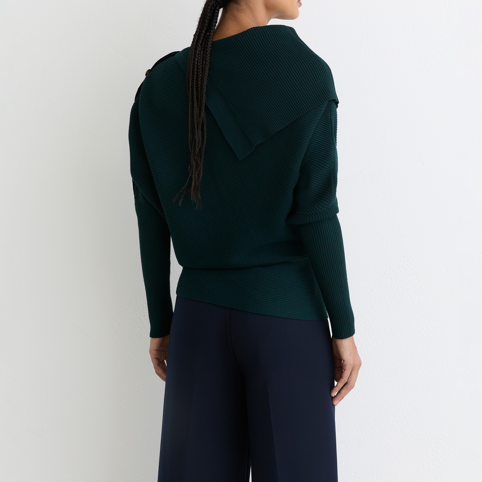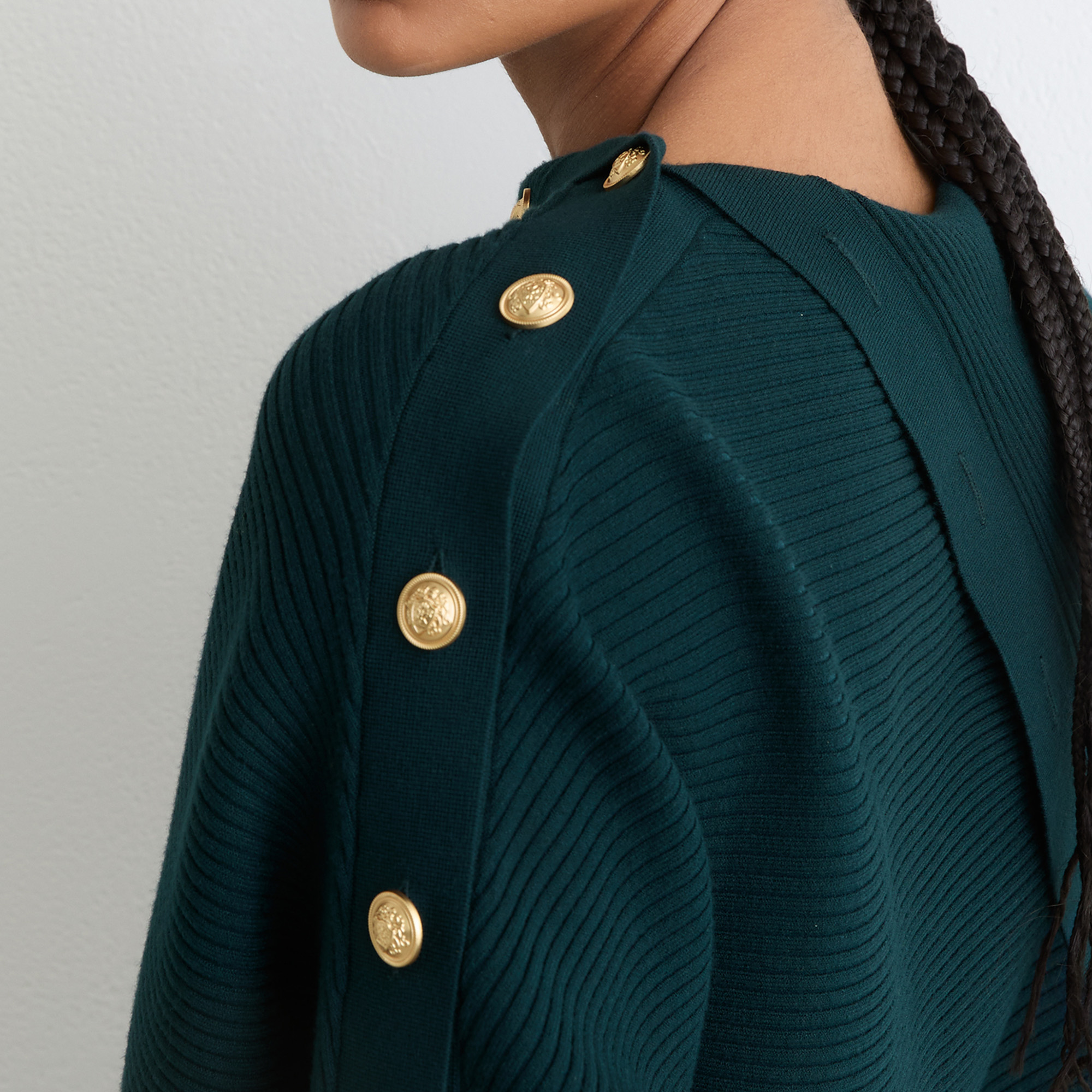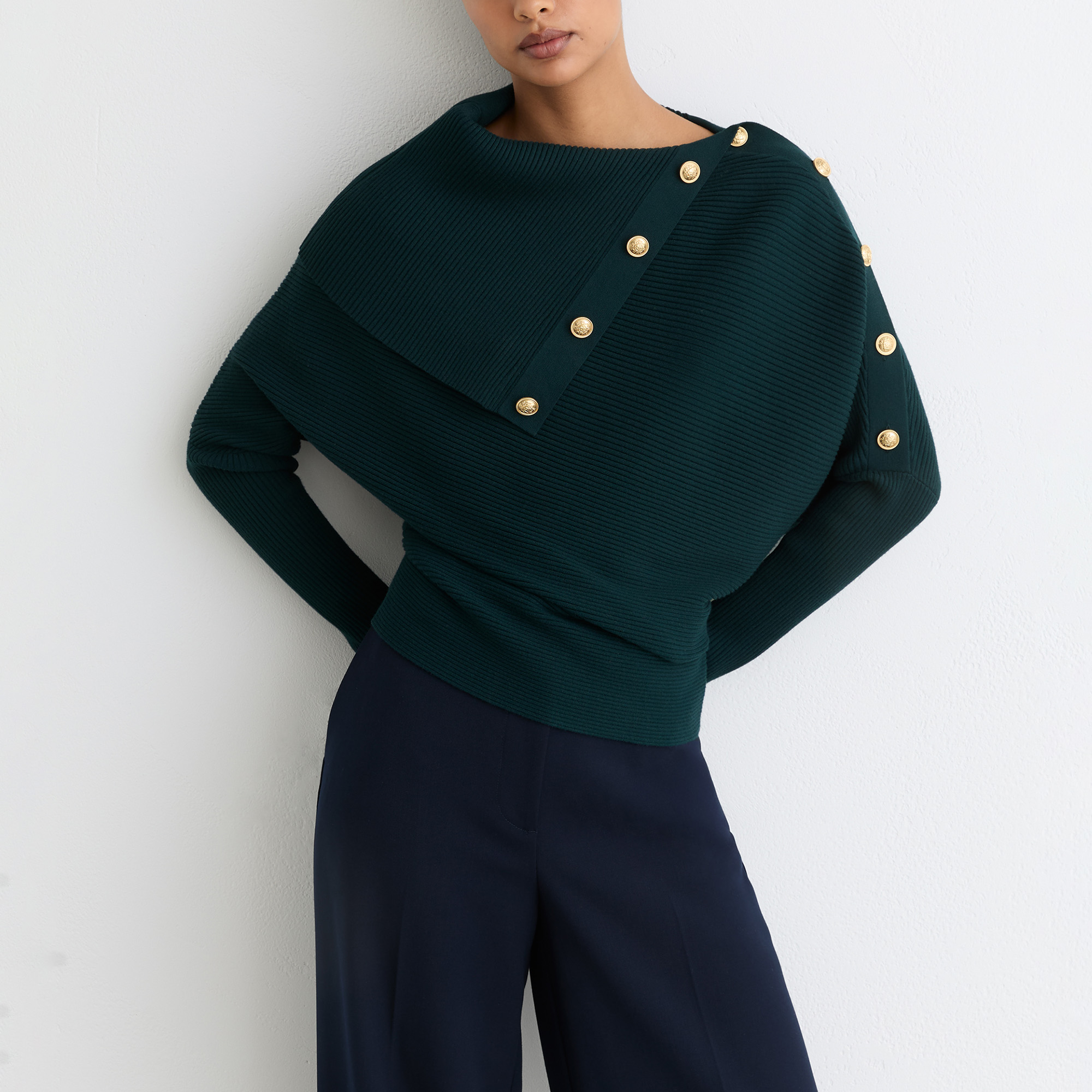 - Ribbed knit, draped, drop shoulders, asymmetric design, crest-embossed buttons, shawl neckline