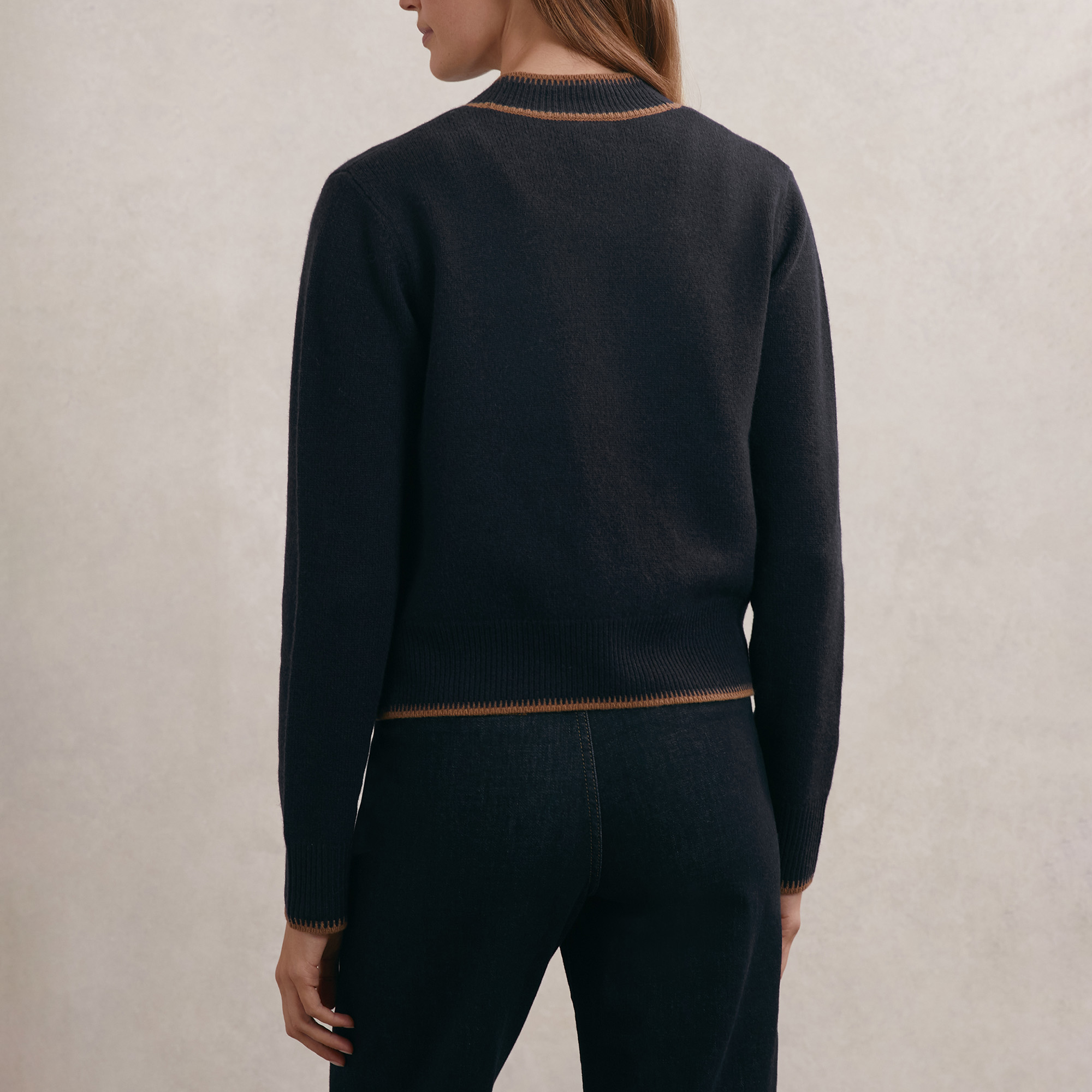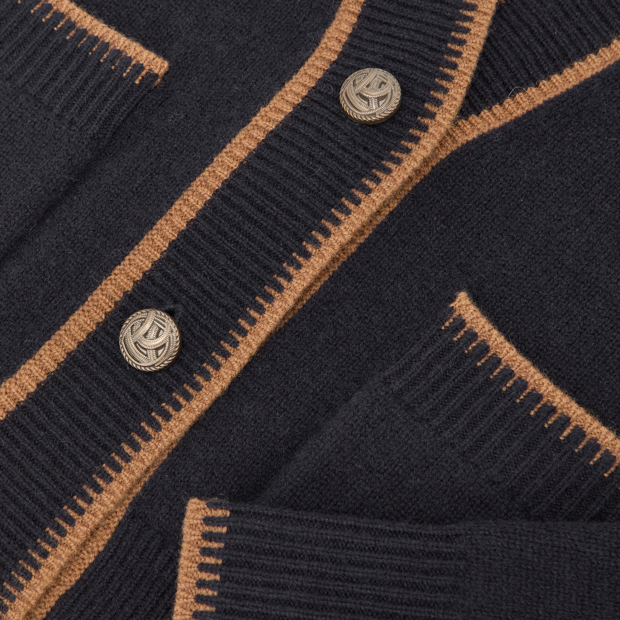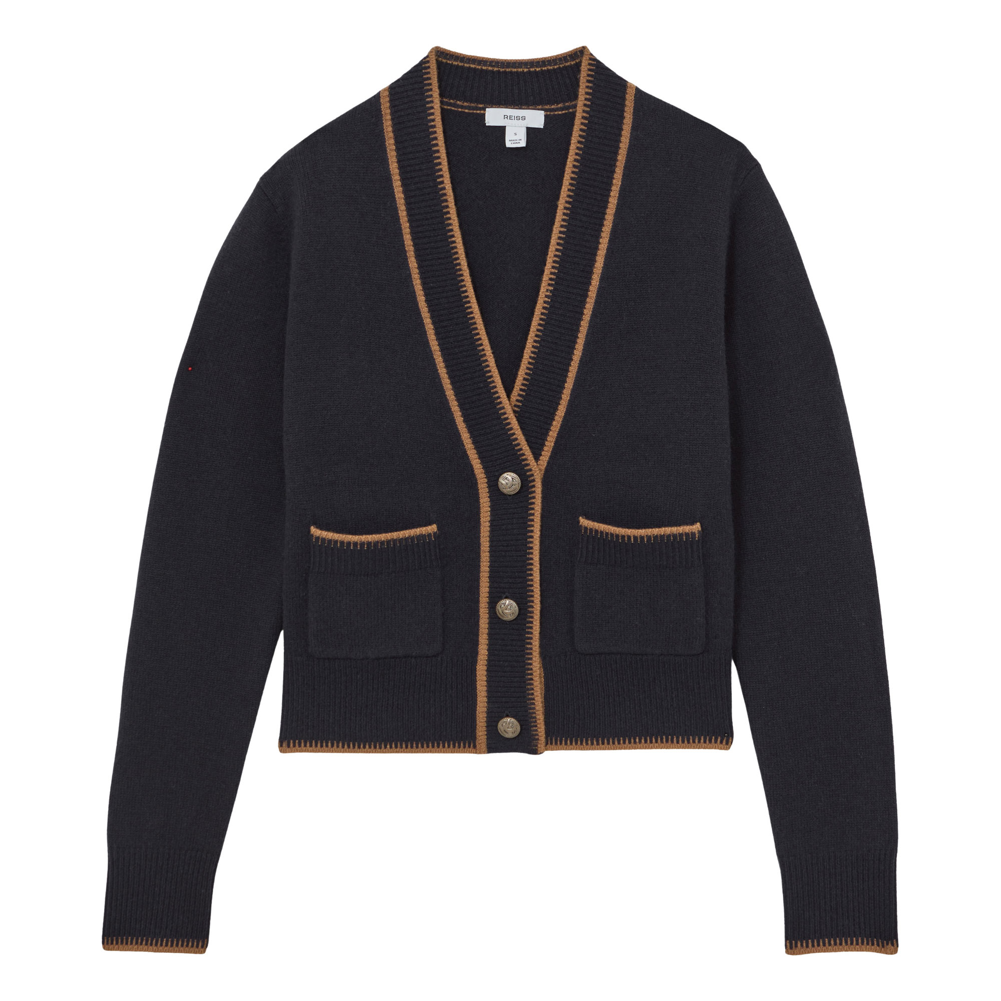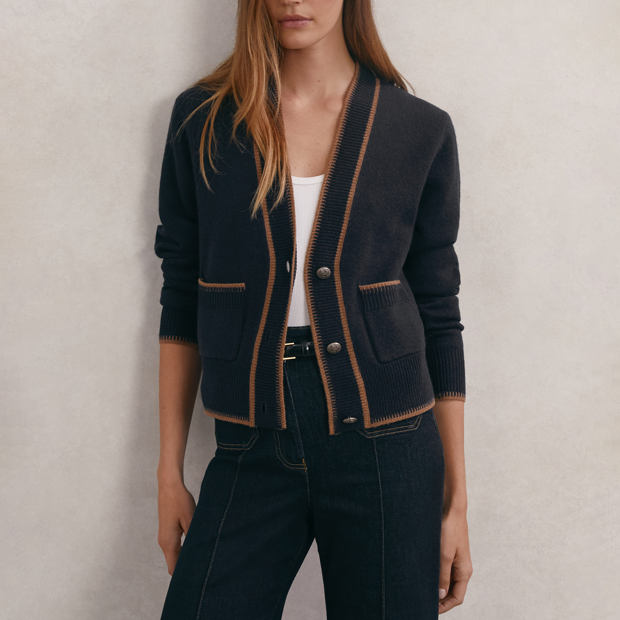 • Knitted, soft feel, contrast tipping, patch pockets, three engraved buttons, V-neckline, ribbed trims