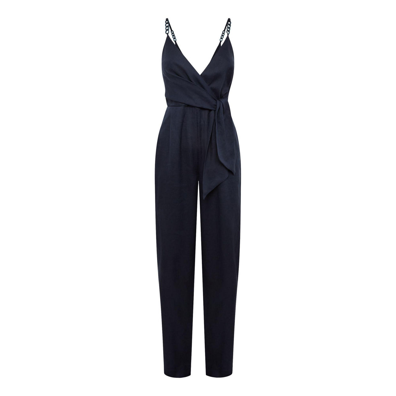 The Emilia Jumpsuit by Reiss combines the practicality of a jumpsuit design, with side slip pockets, and an ultra-feminine silhouette enhanced by the deep V-Neckline. The fashionable tie detail at the waist adds volume to this shapely garment, that is crafted in light linen to let you flow through your daily occurrences with irresistible style.