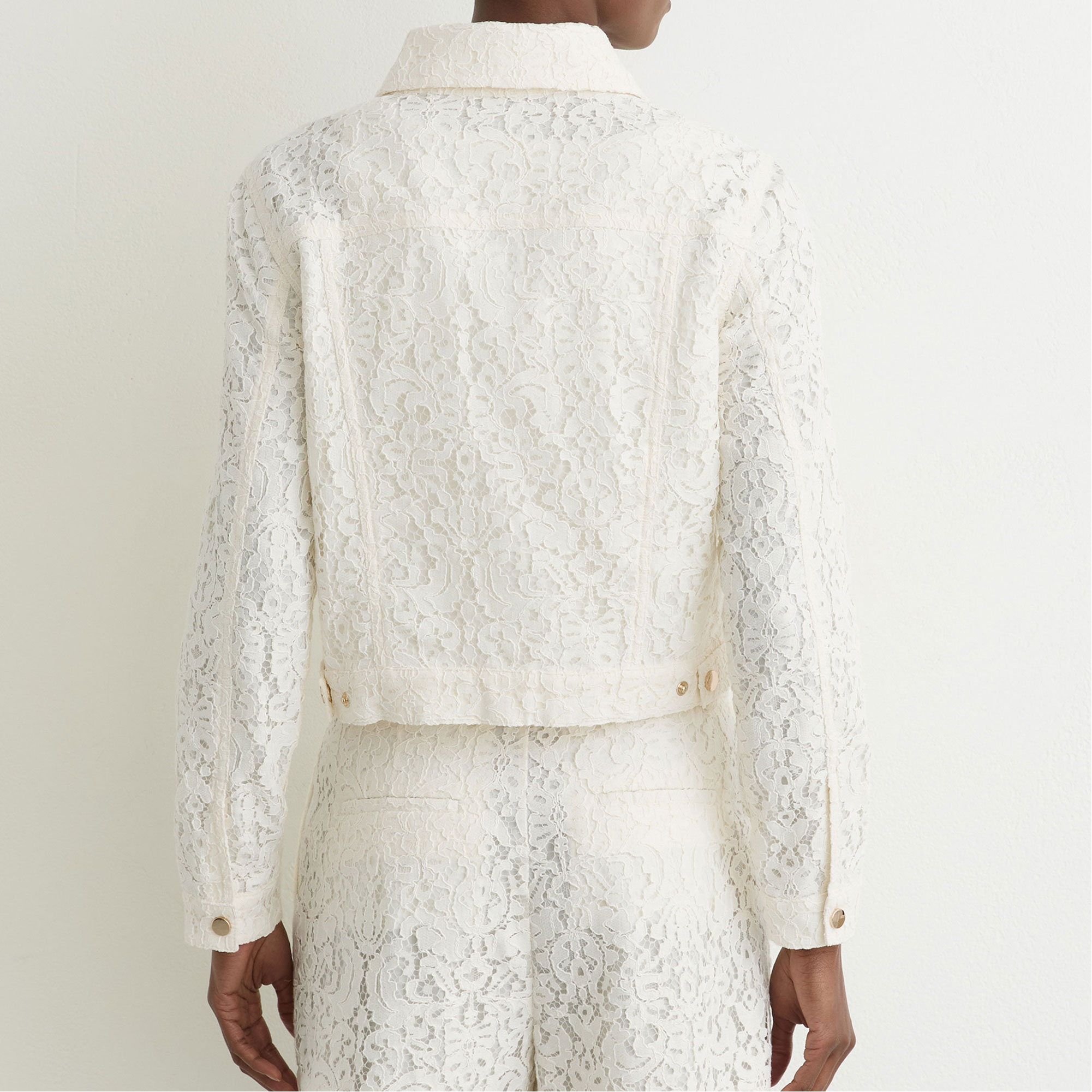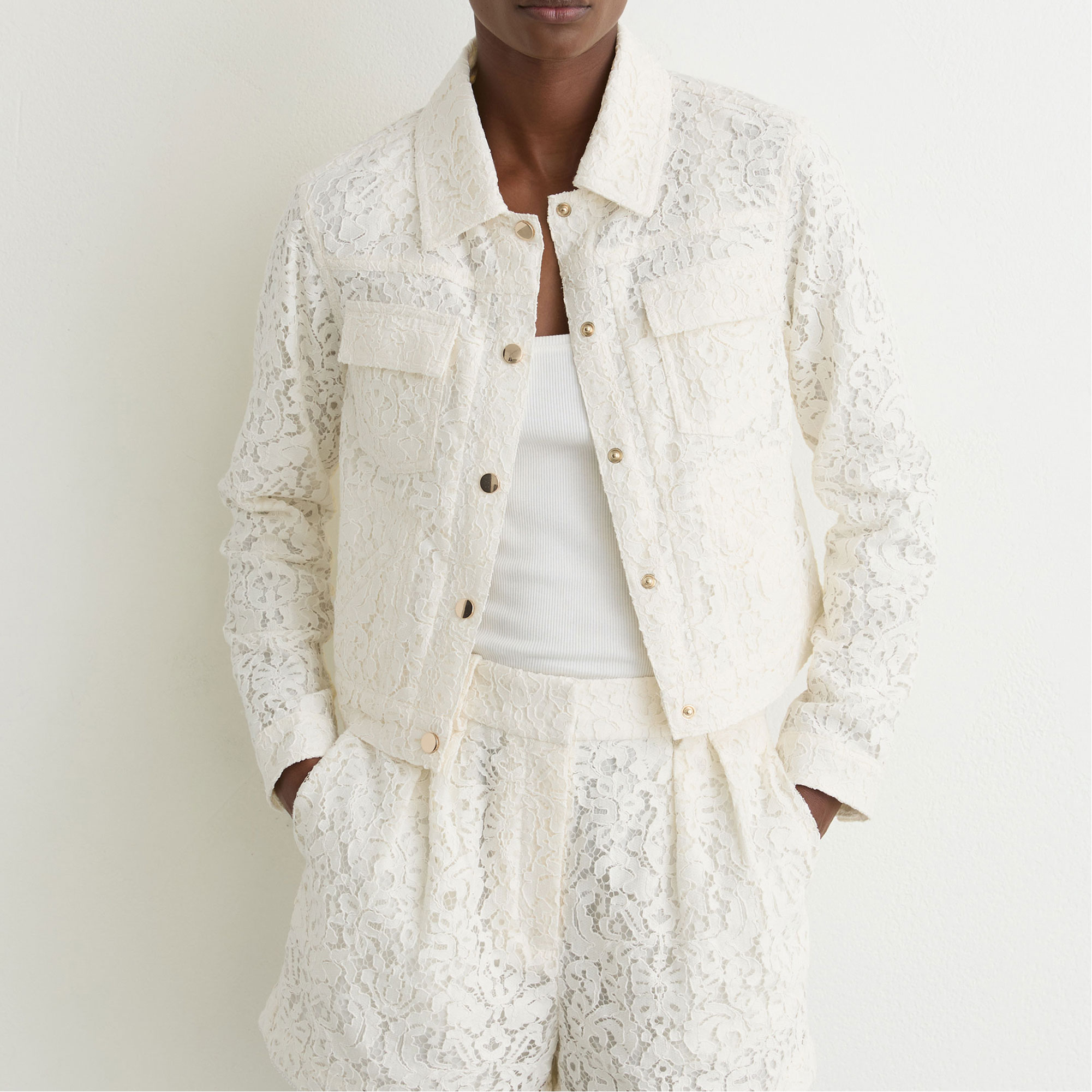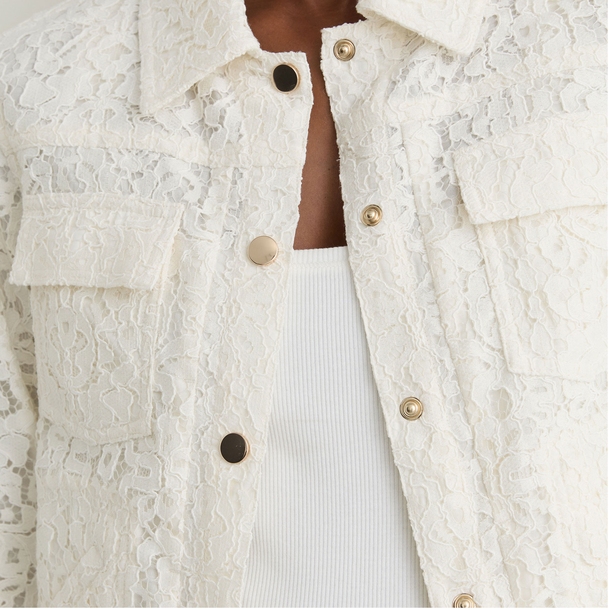 • Floral lace, boxy cut, classic collar, polished press-stud fastenings, flap chest pockets, side welt pockets, lapels, long sleeves