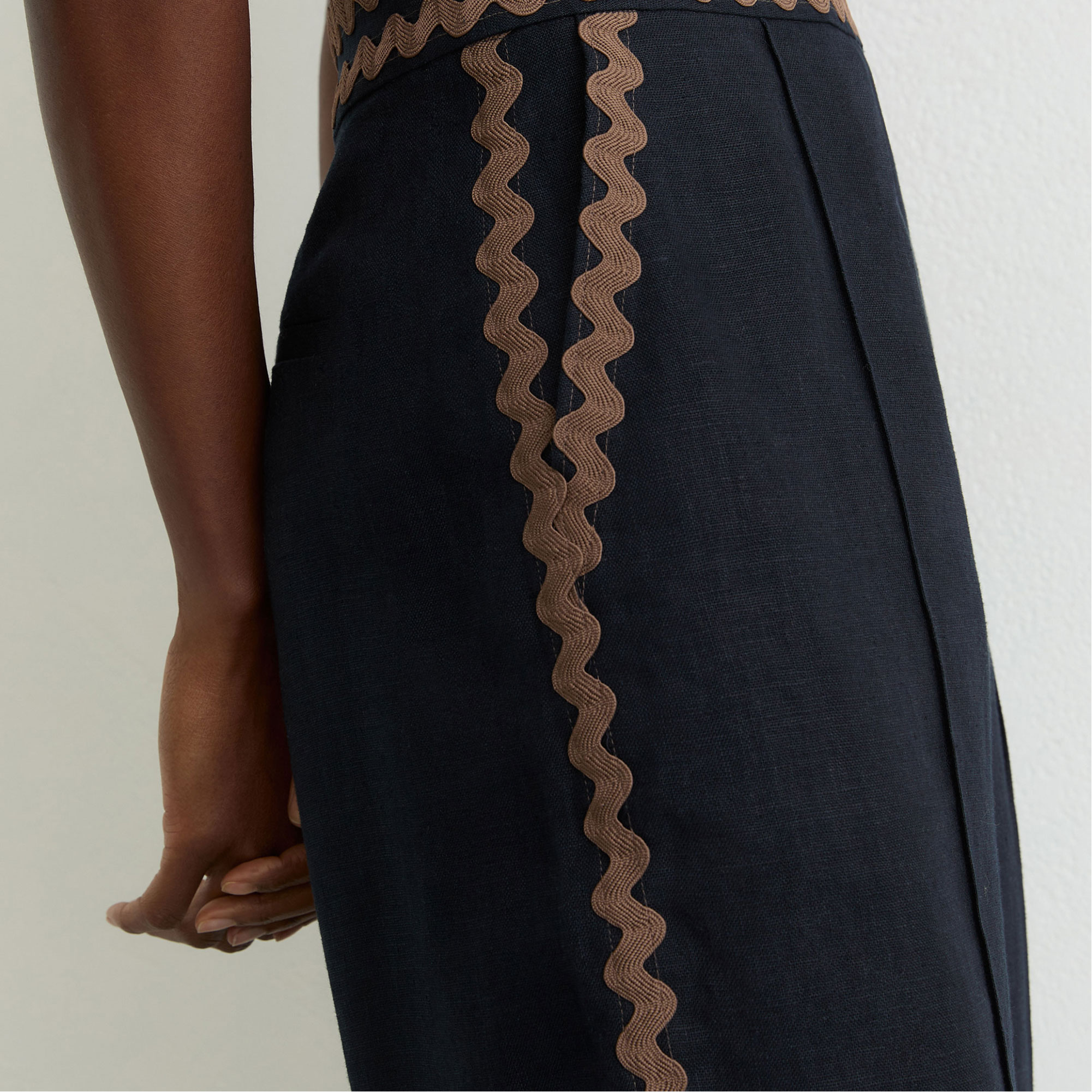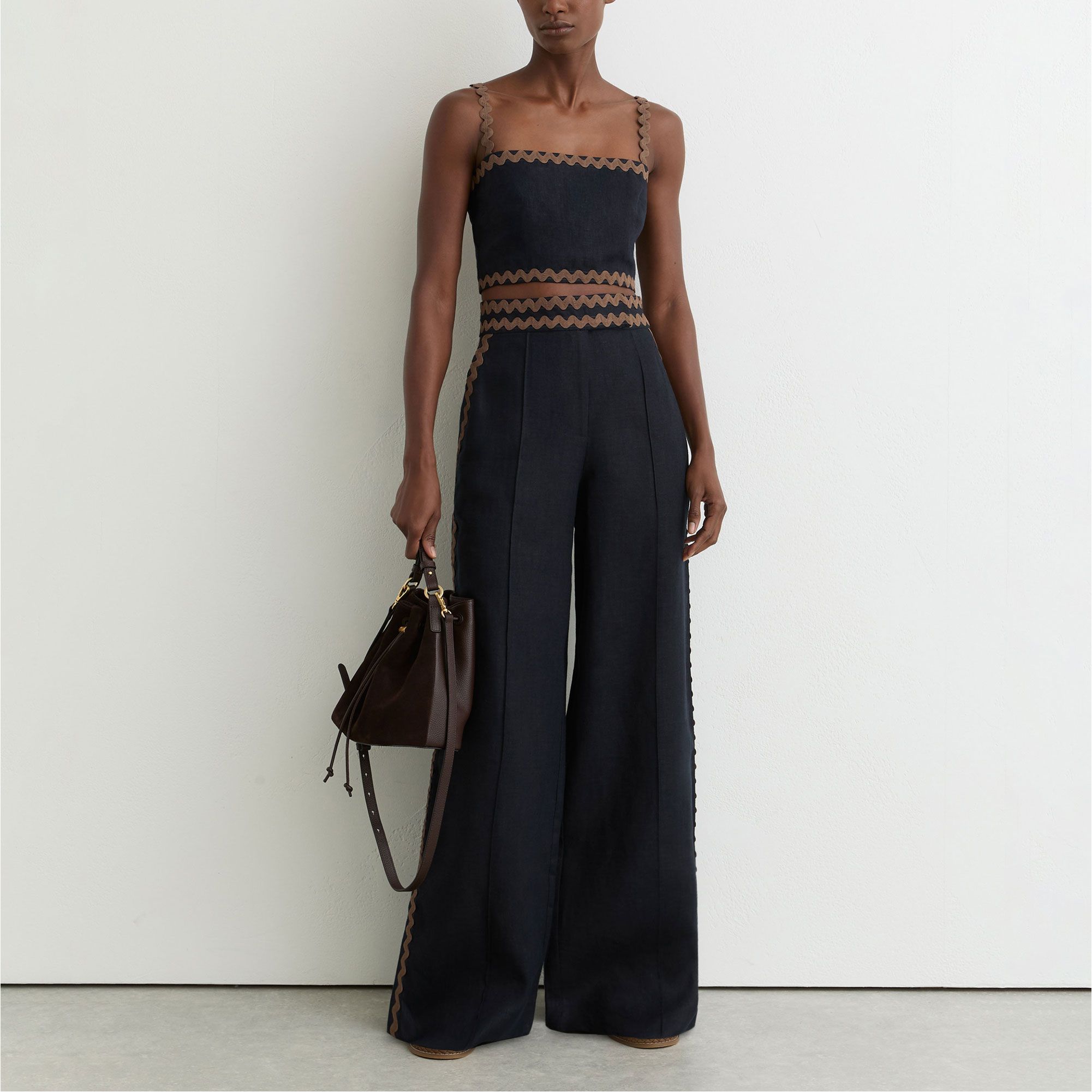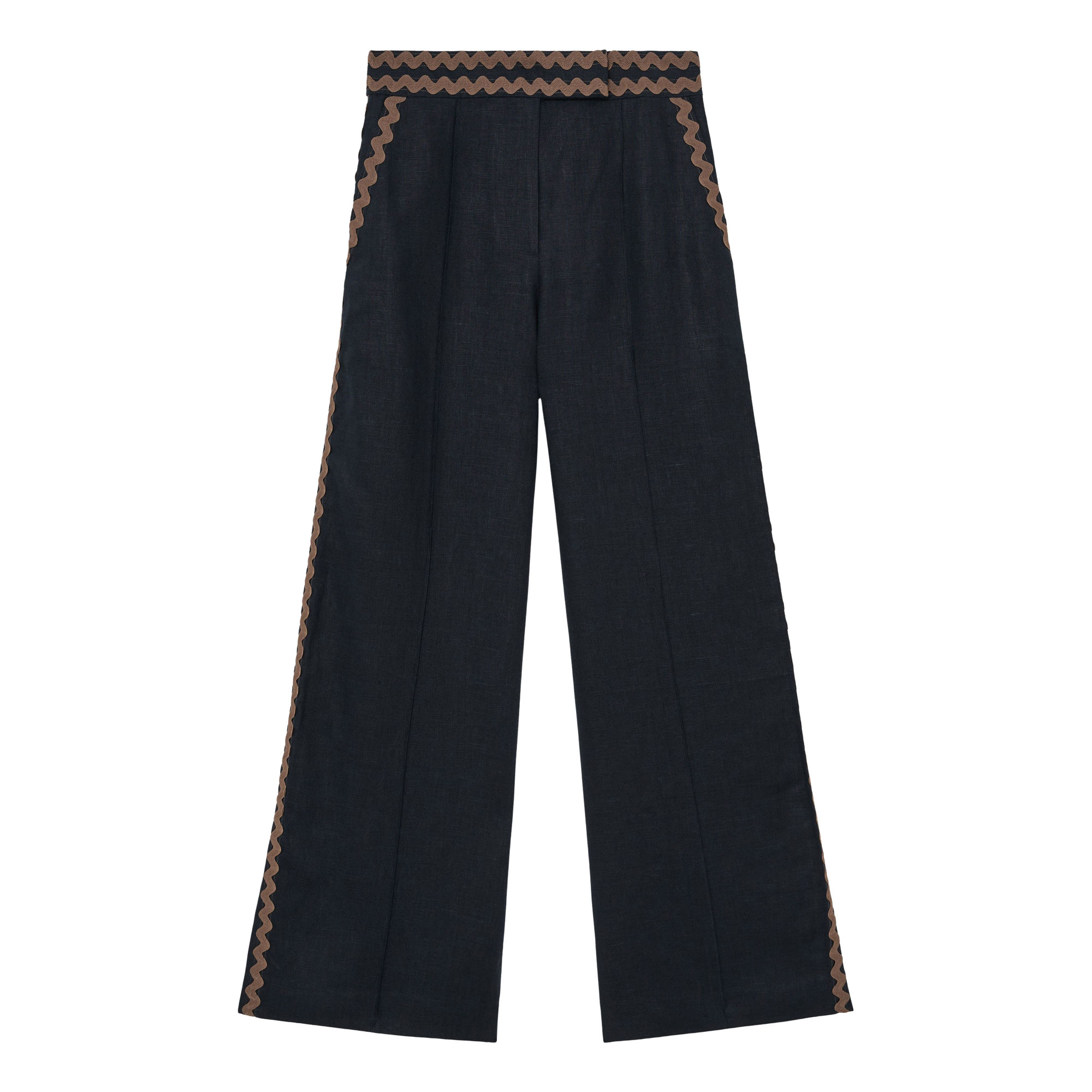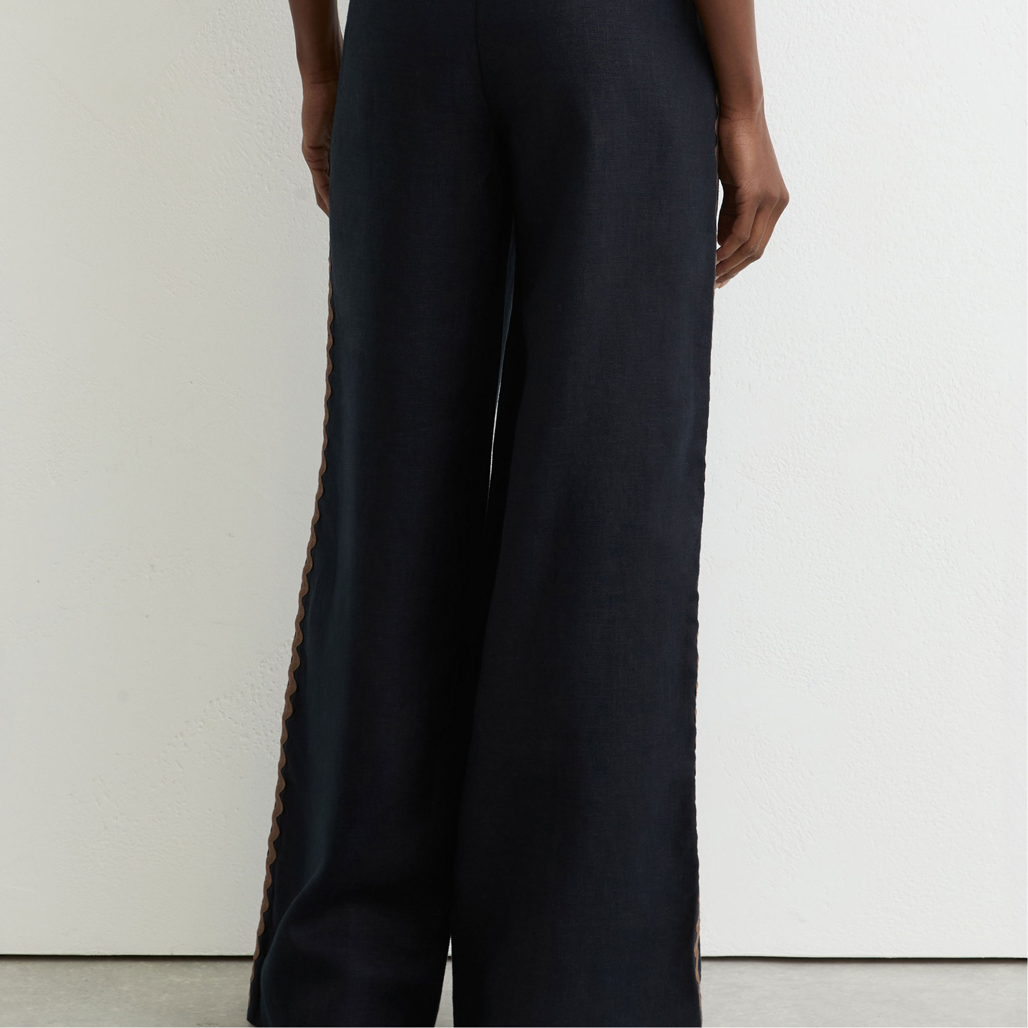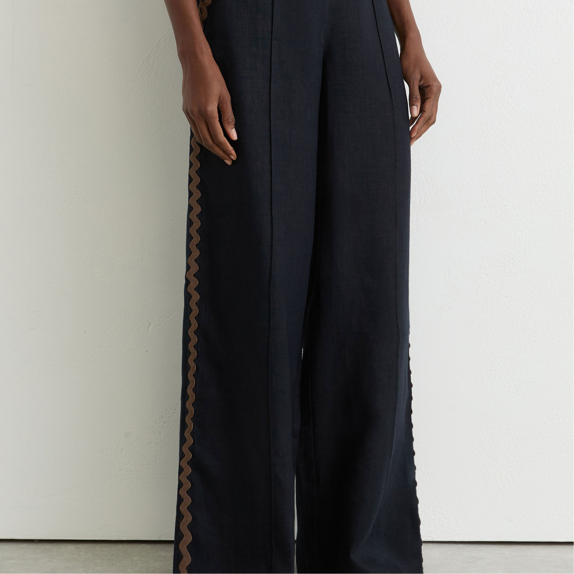 - Wide-leg silhouette, contrast ric-rac trim details, waistband, side seams, front pintucks, angled side pockets, back welt pocket, double hook-and-bar, zip closure