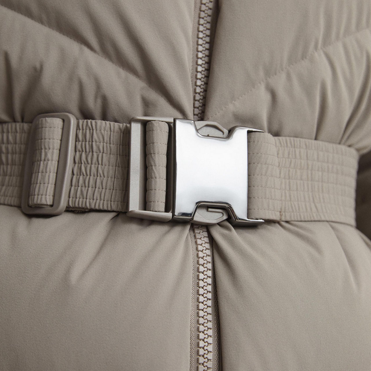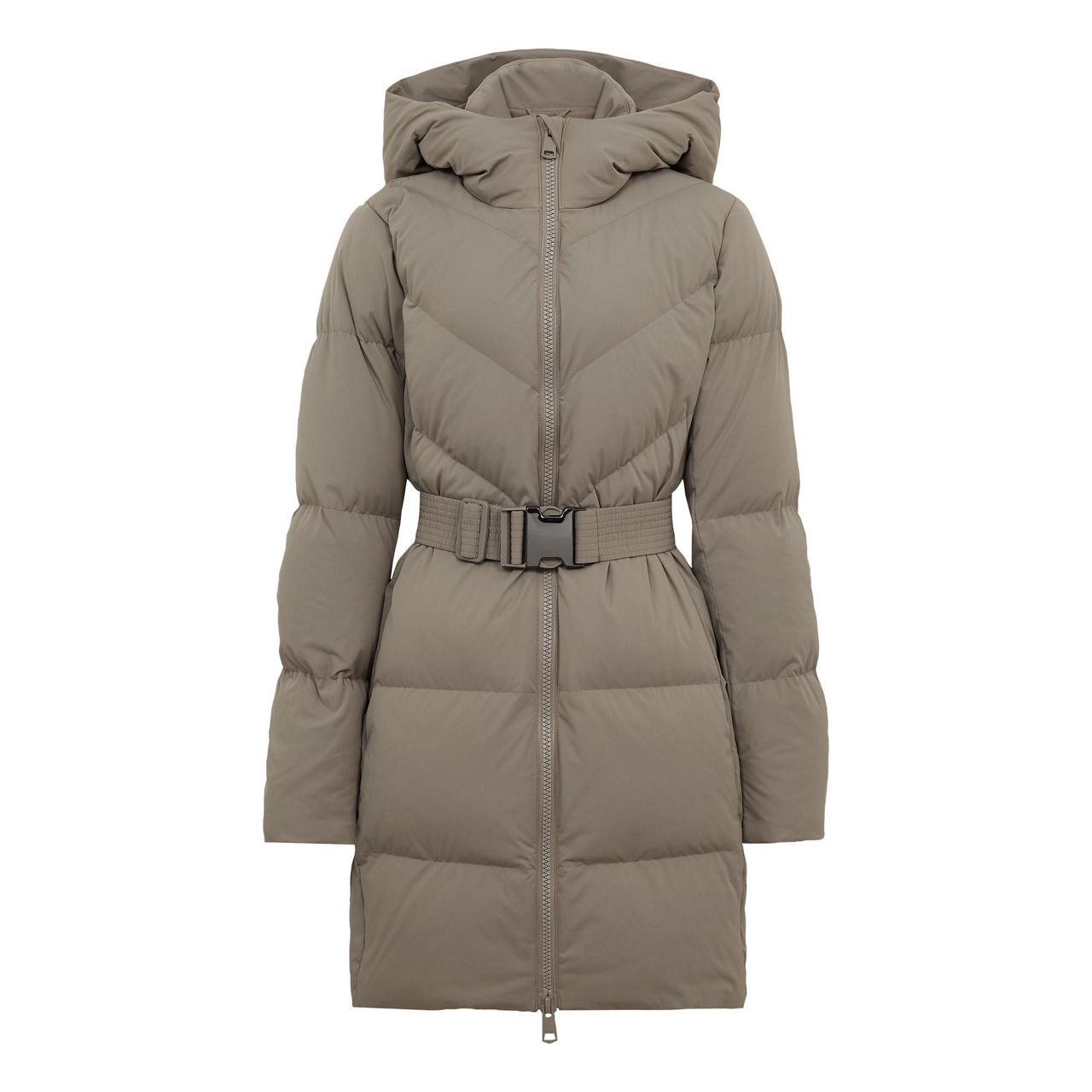 - Quilted, recycled filling, belt, high neck, fleece lined pockets, hood
