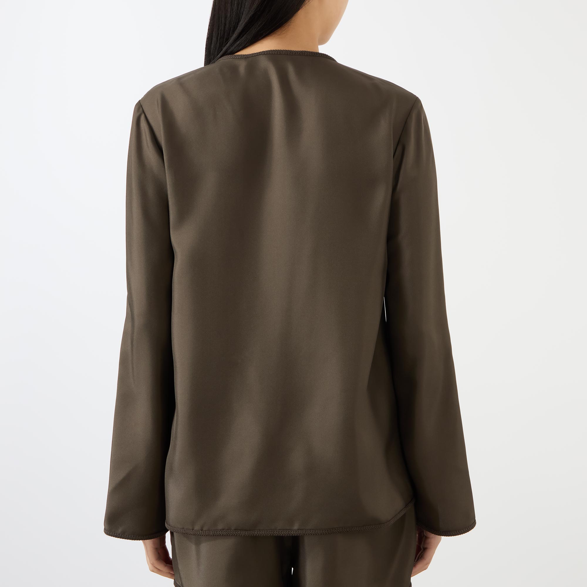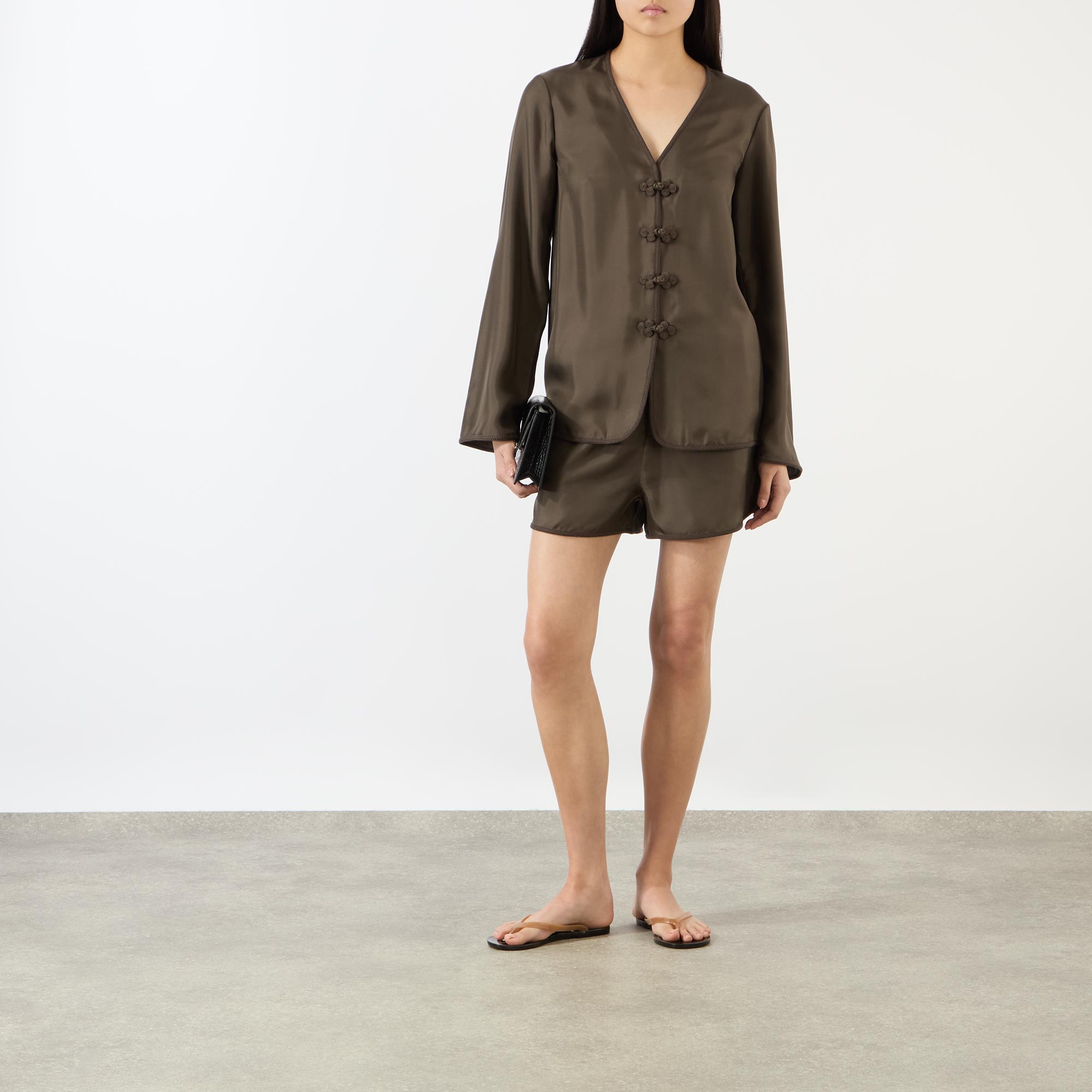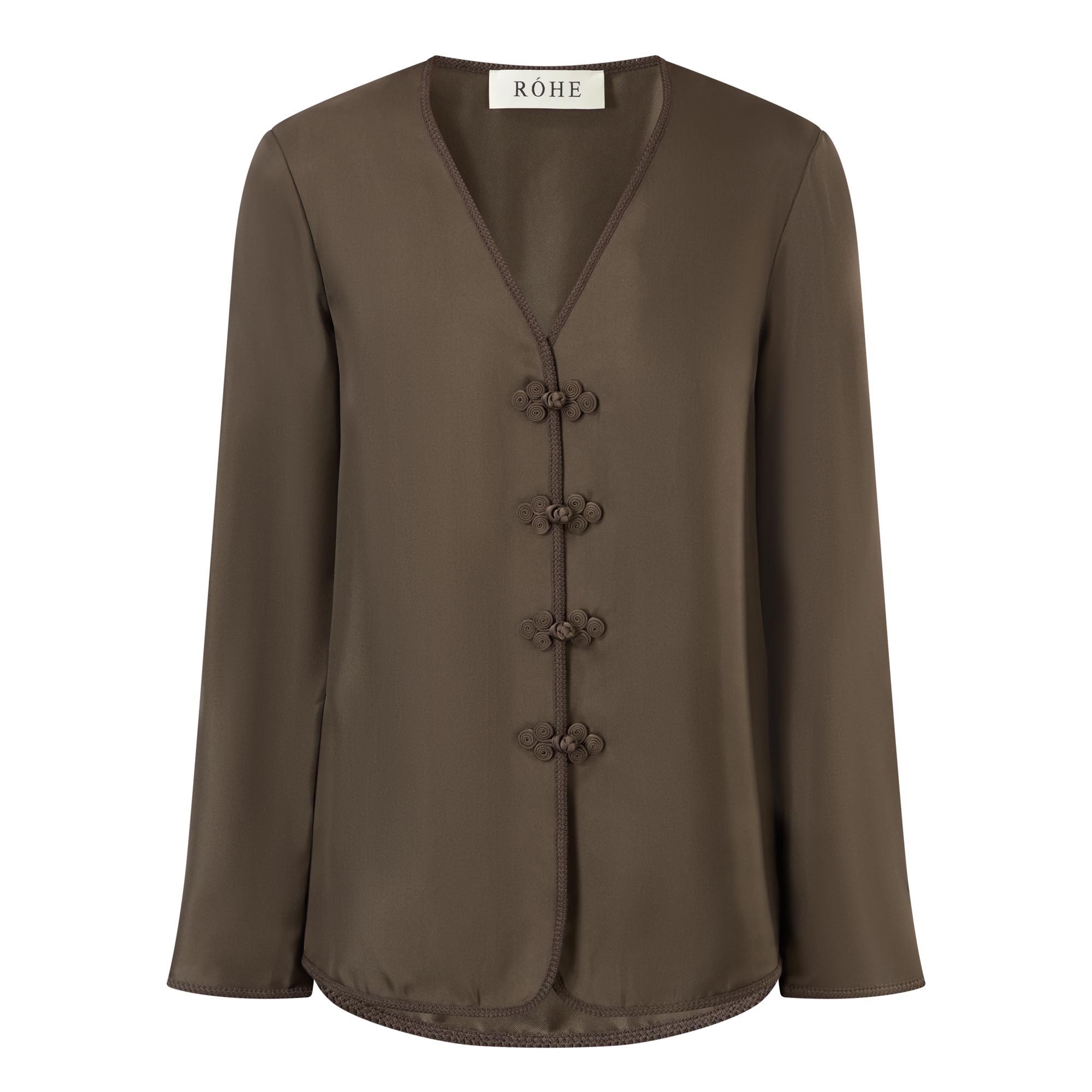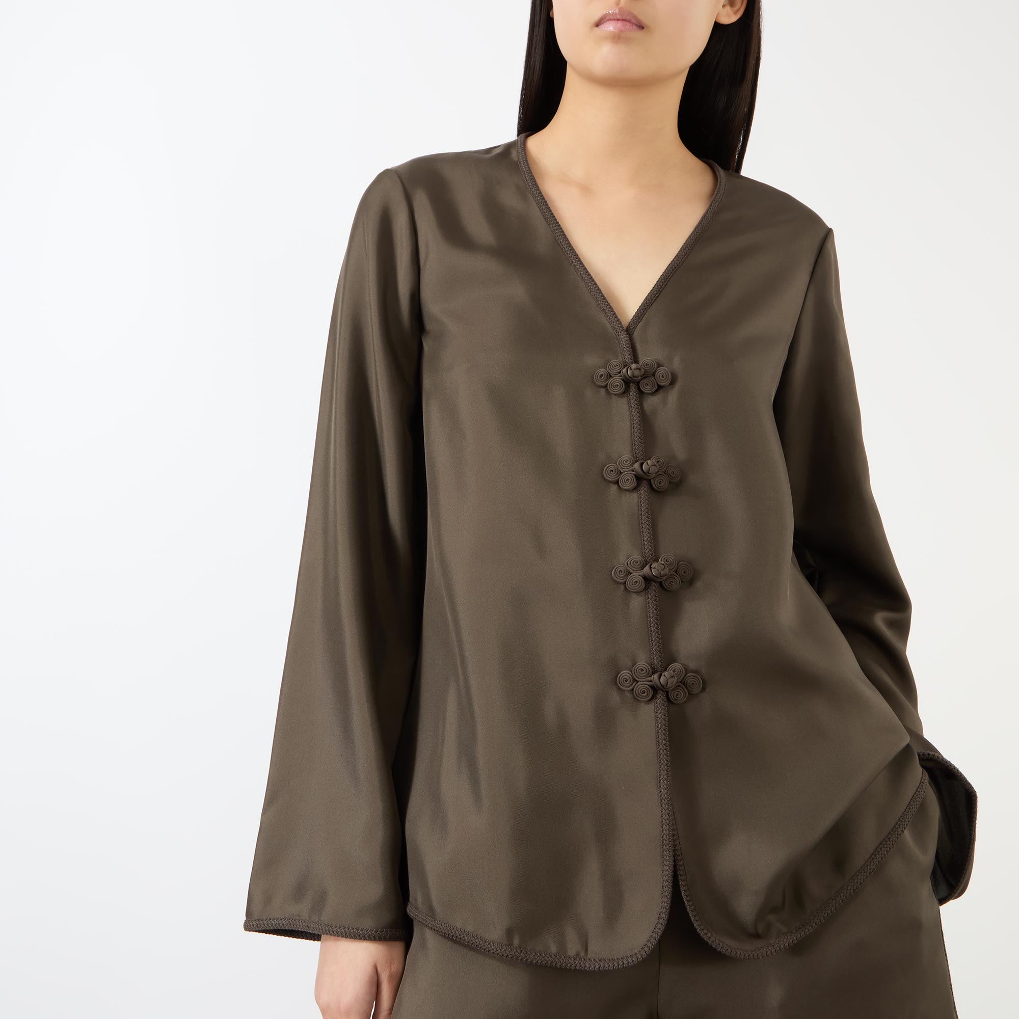 - V-neckline, long sleeves, pankou knot closures, straight hem, embroidered trim detailing, smooth finish