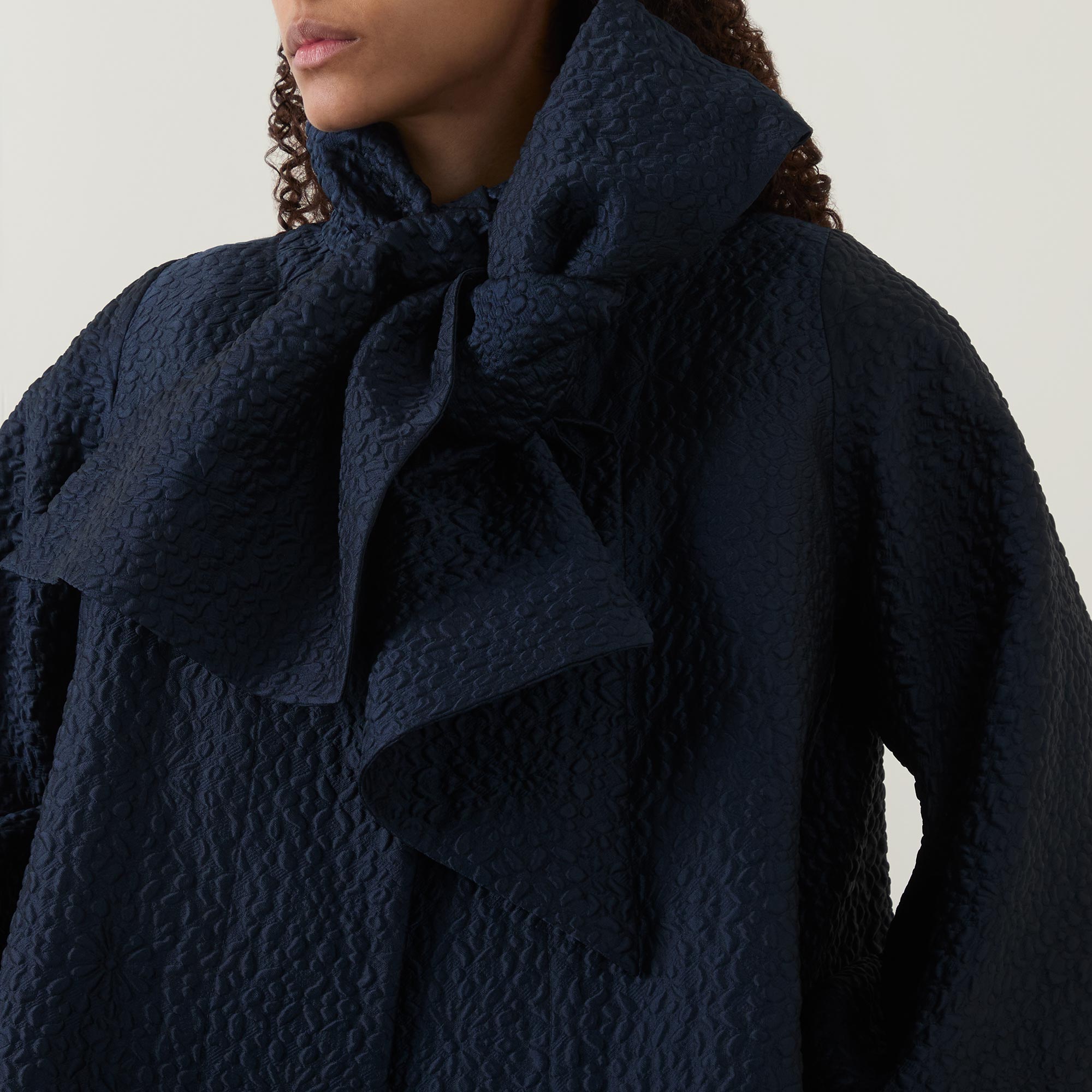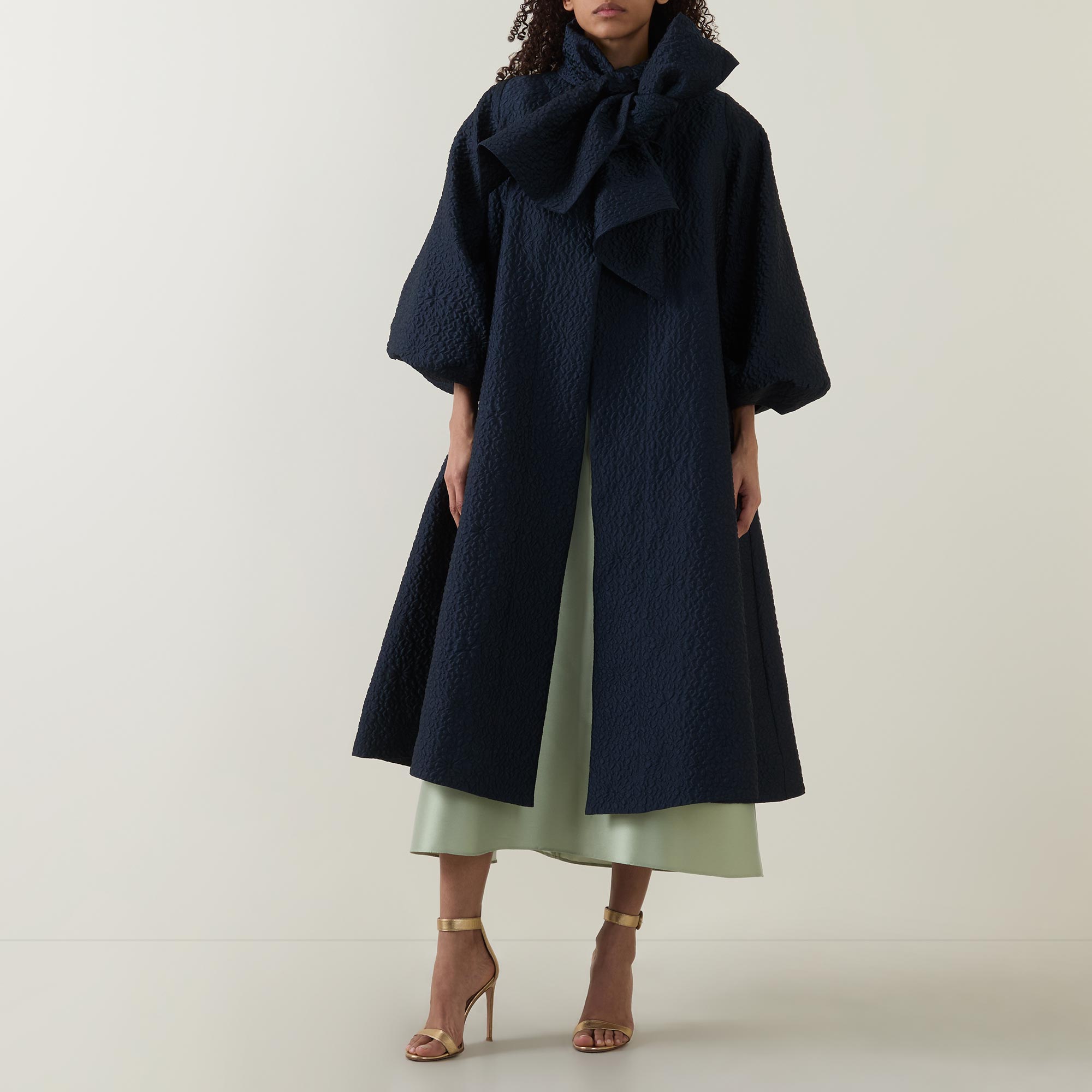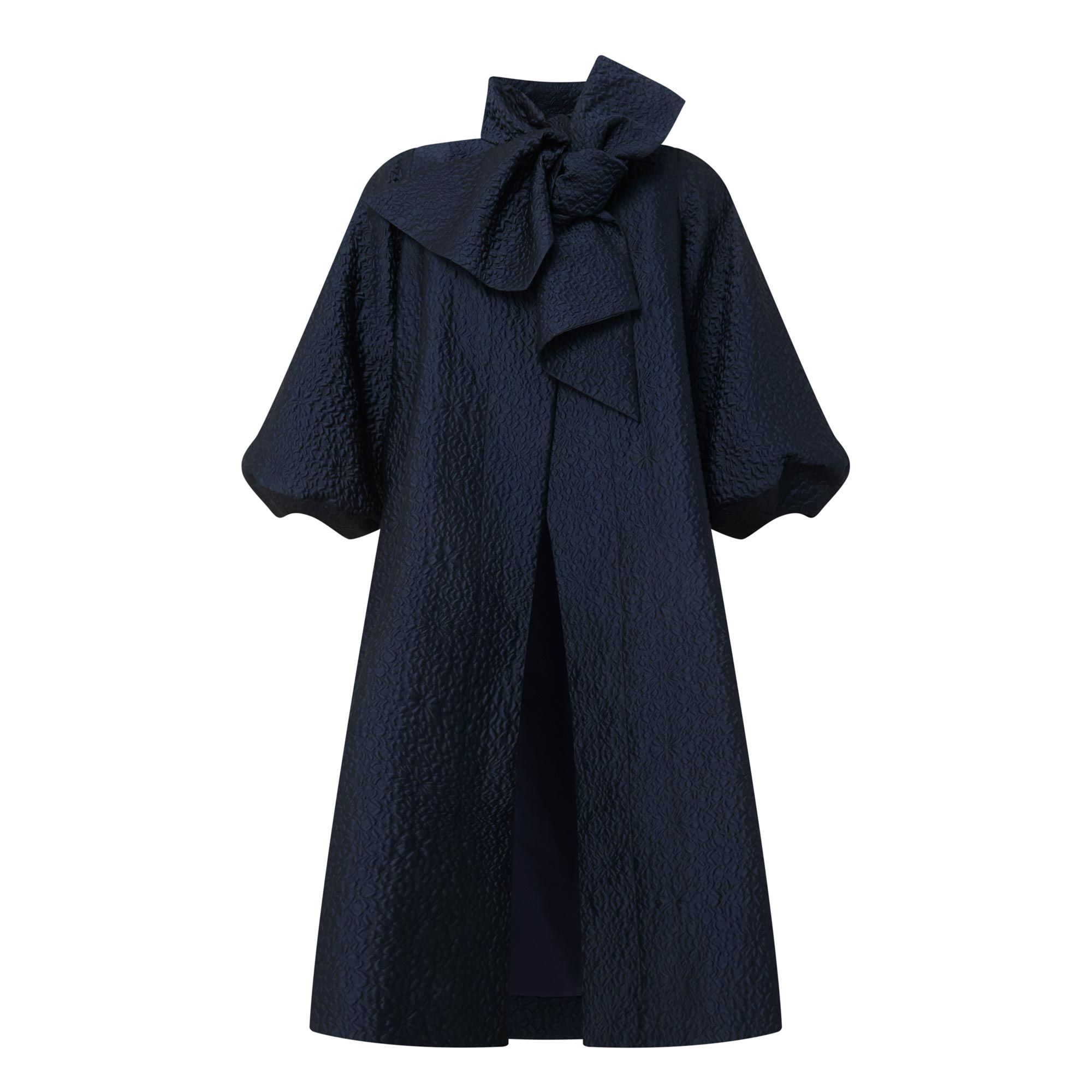 - Stand collar, exaggerated bow tie fastening, three quarter length balloon sleeves, elasticated cuffs, concealed front fastening, two side in seam pockets, flared hem, longline design, textured finish
