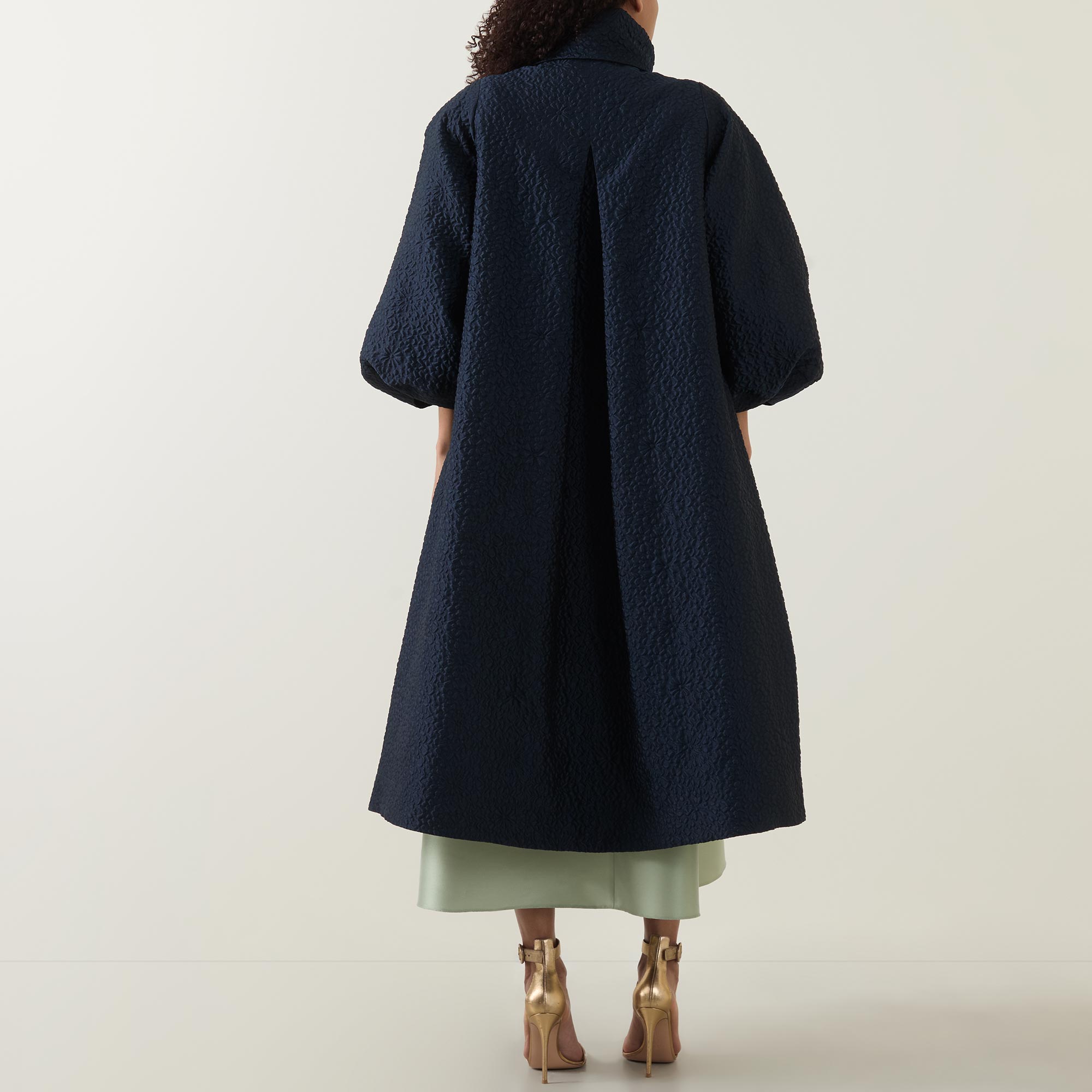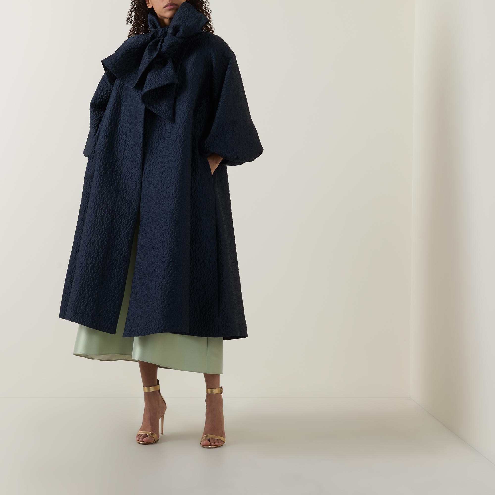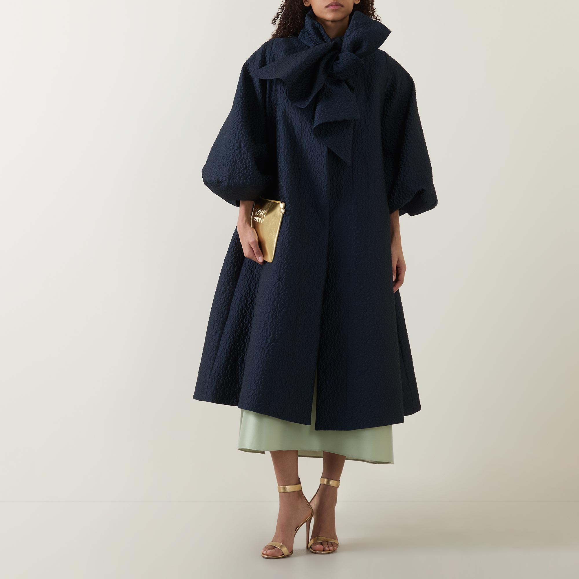 - Stand collar, exaggerated bow tie fastening, three quarter length balloon sleeves, elasticated cuffs, concealed front fastening, two side in seam pockets, flared hem, longline design, textured finish