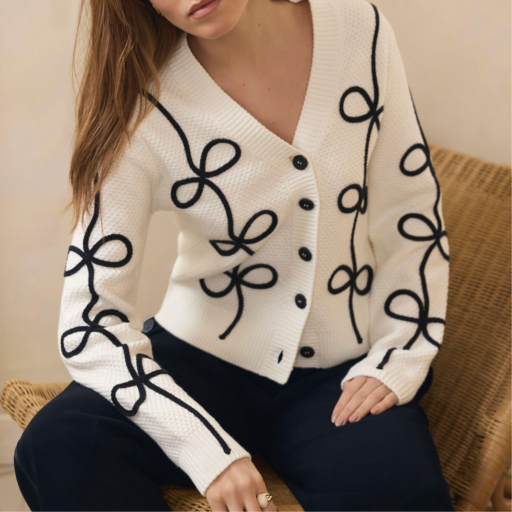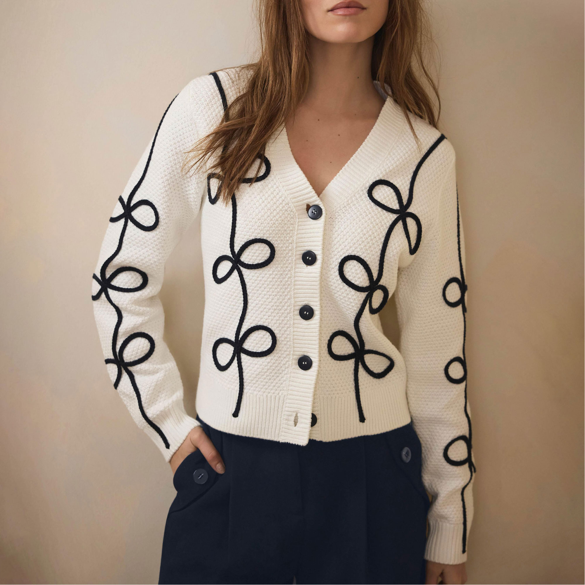 - V-neckline, contrast bow design, long sleeves, front button fastenings
