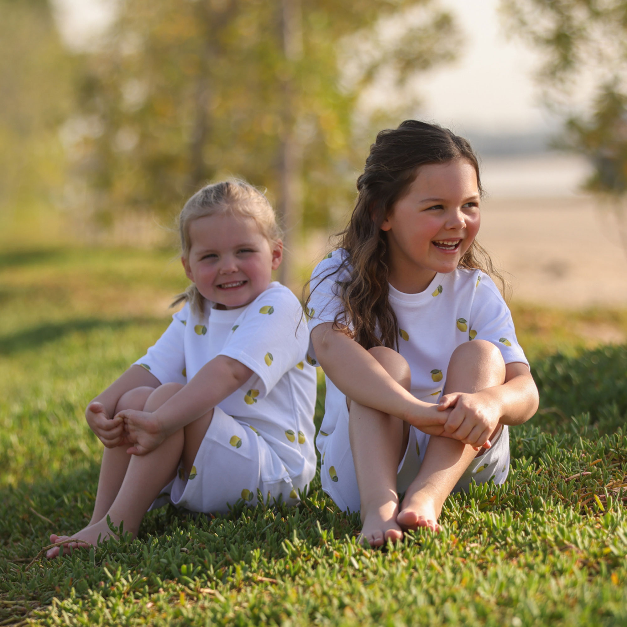 • Thermo-regulating, hypoallergenic, soft feel, breathable, moisture-wicking properties, hand-painted print, short sleeves, round neckline, elasticated waistband, pull-on style, two-piece set, lemon design