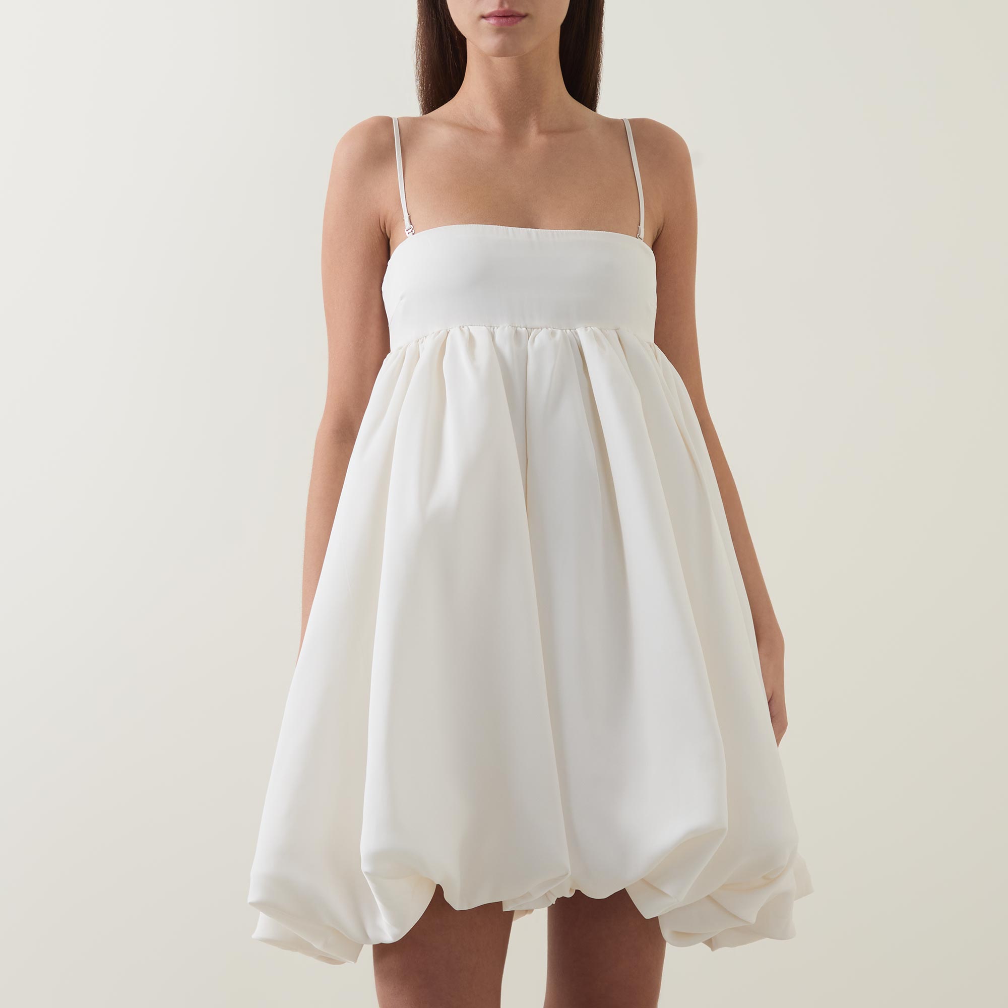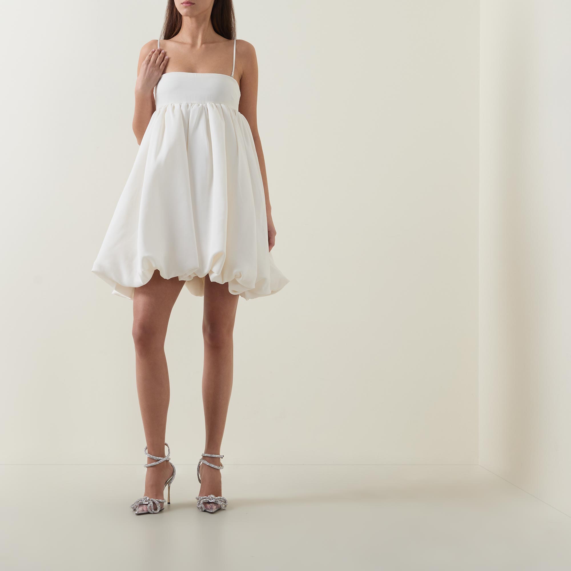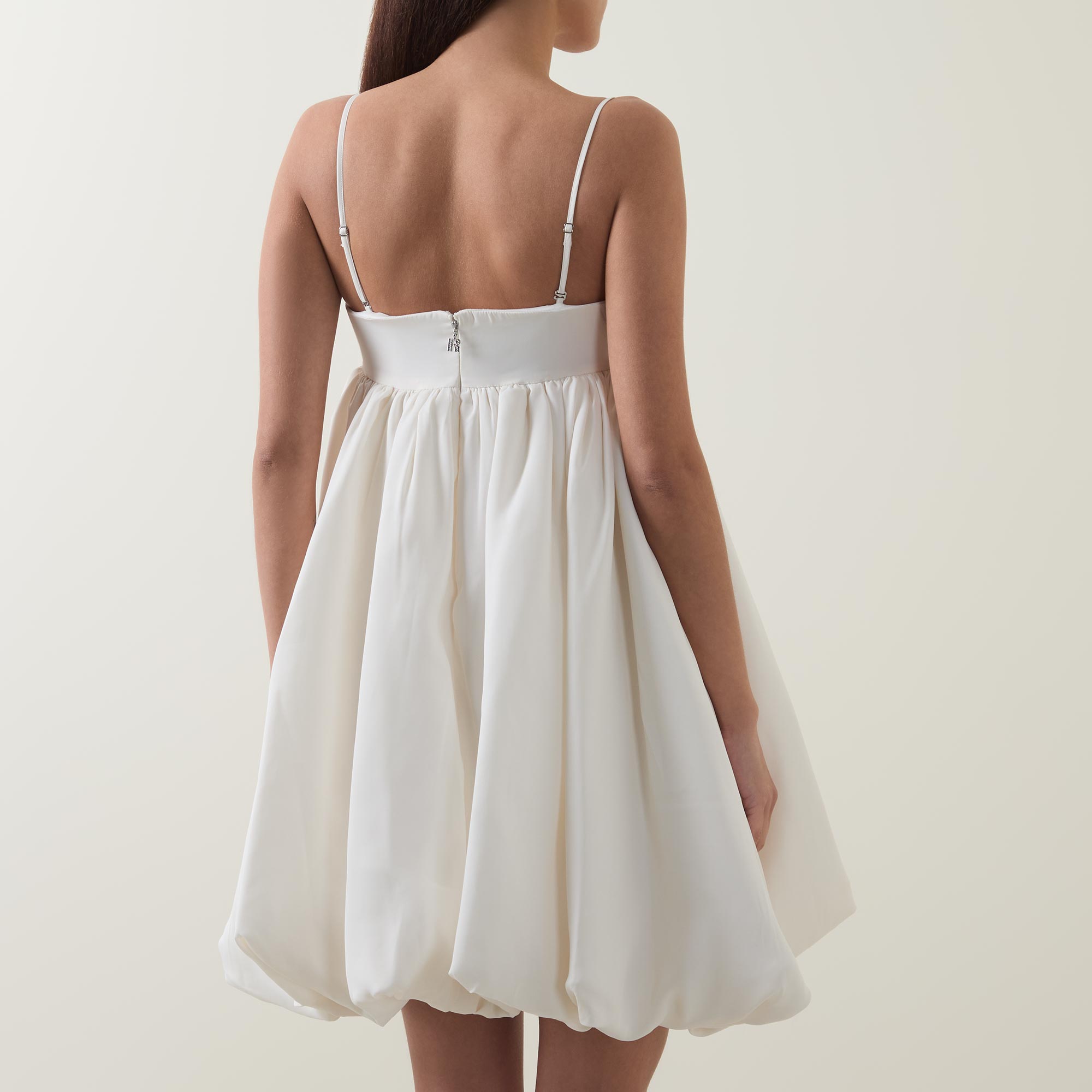 • Adjustable and detachable straps, mini length, zip fastening to the back, bubble hemline, smooth satin fabric