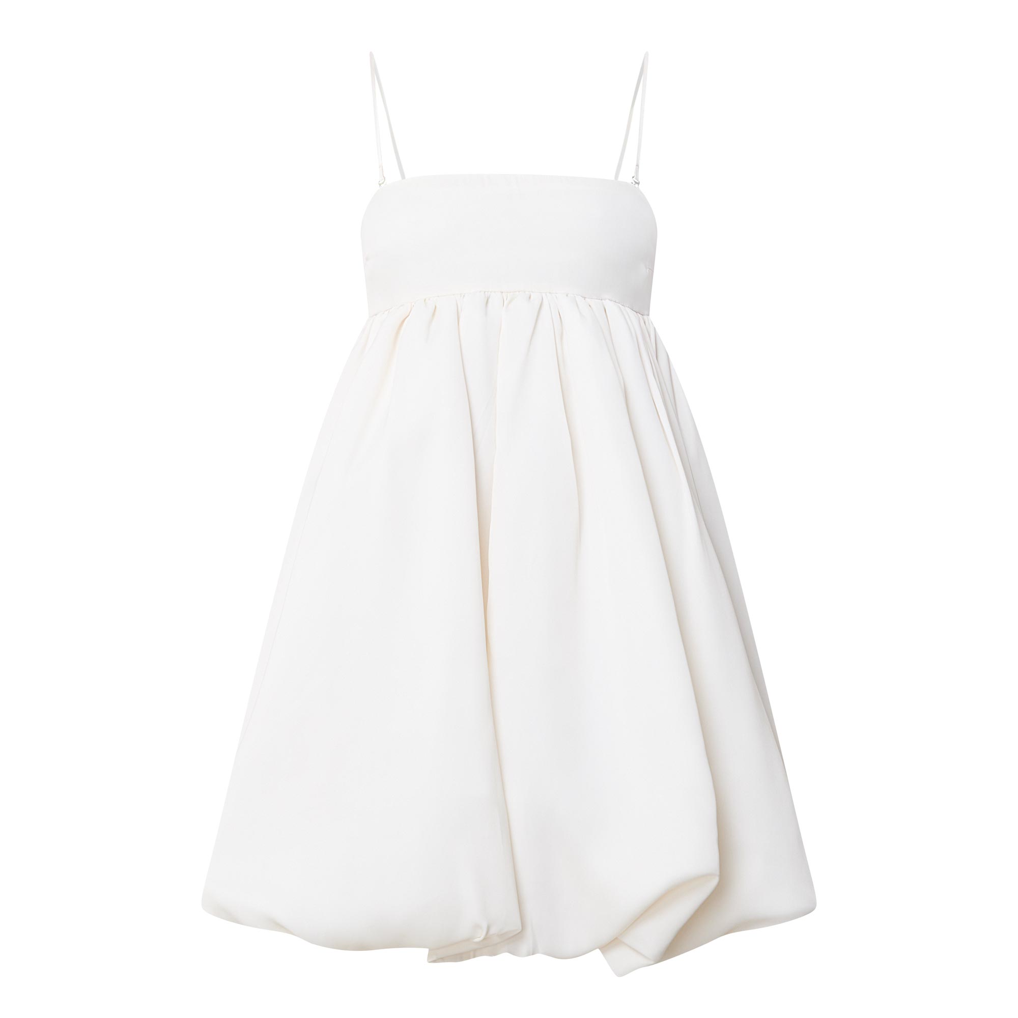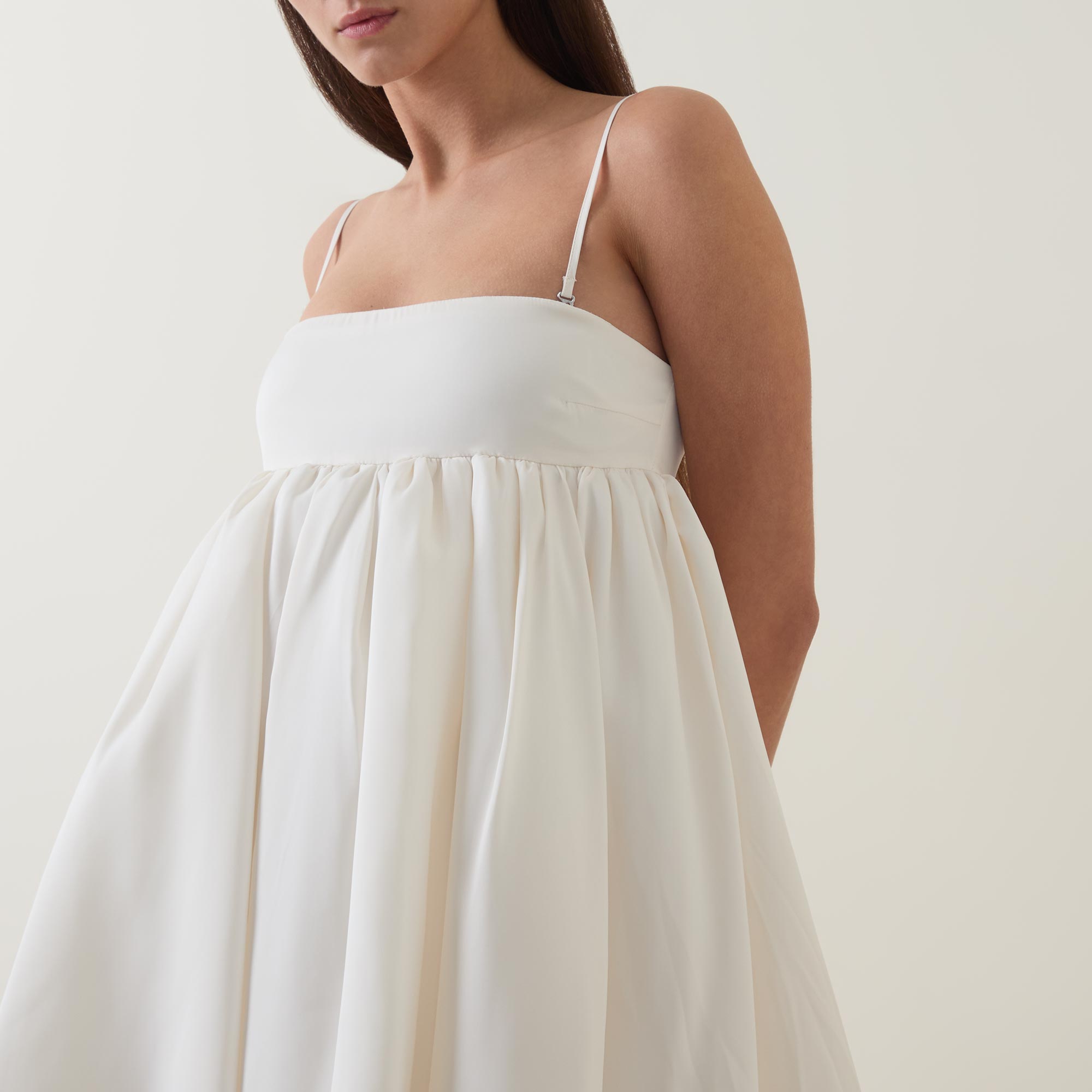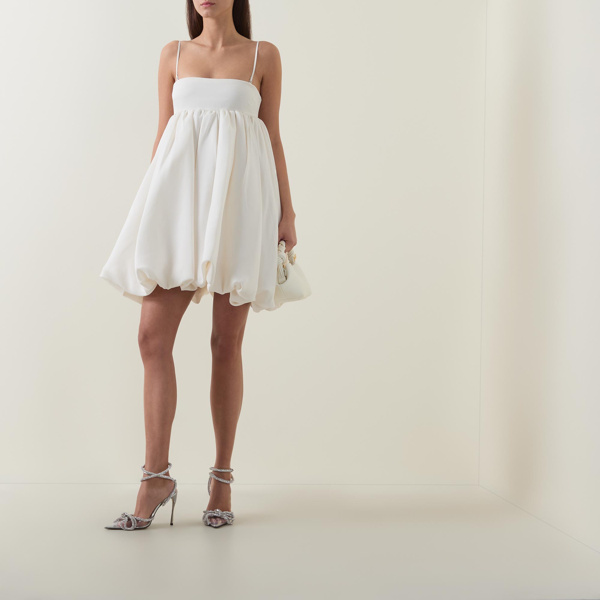• Adjustable and detachable straps, mini length, zip fastening to the back, bubble hemline, smooth satin fabric