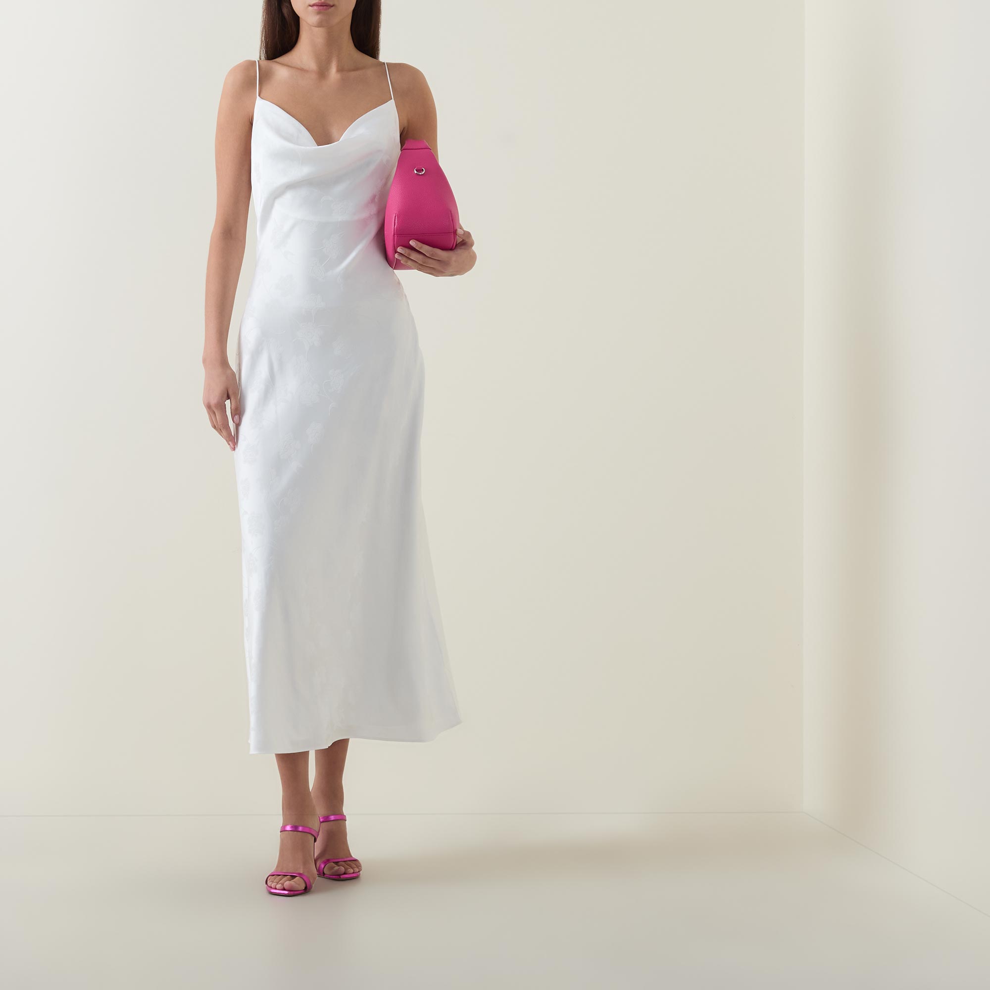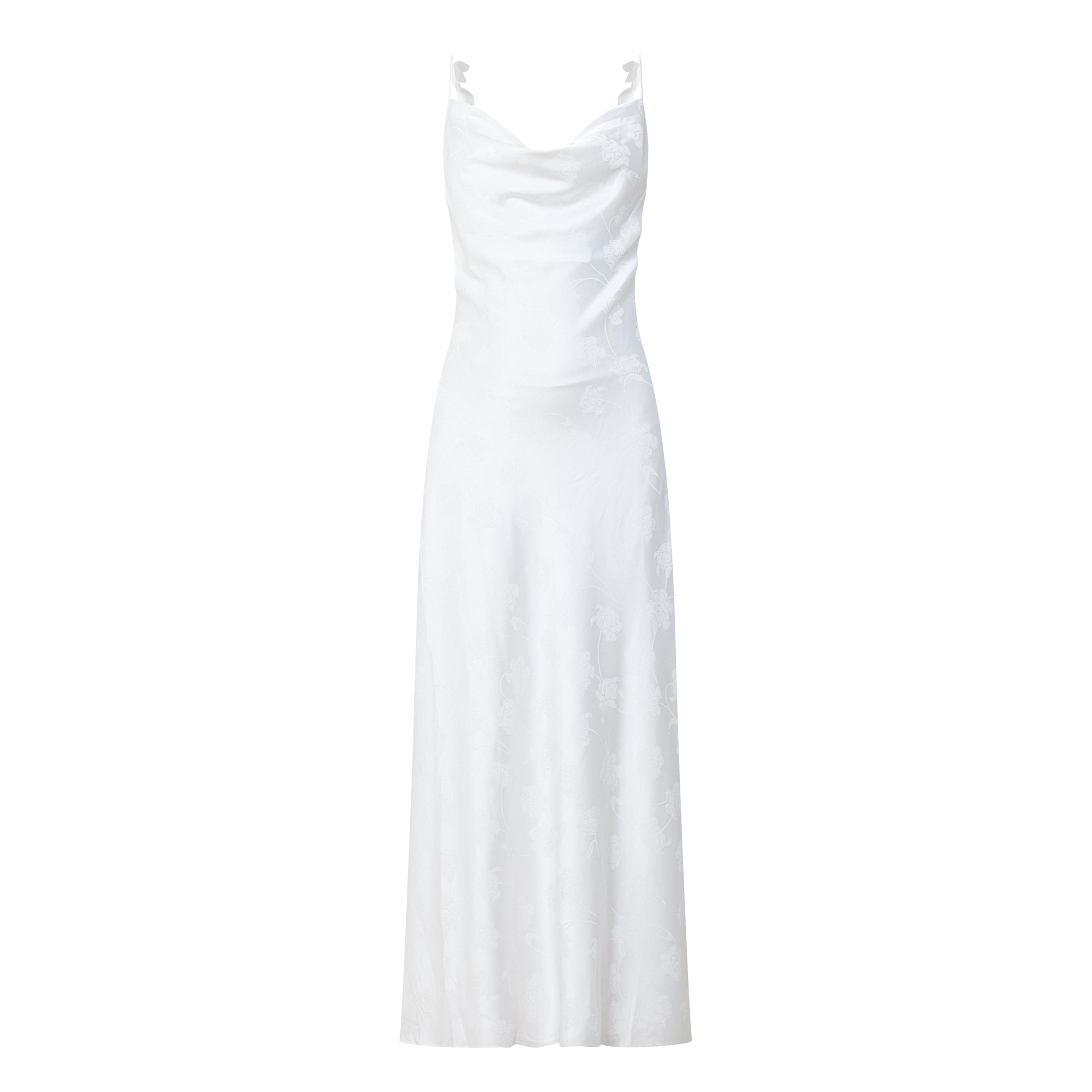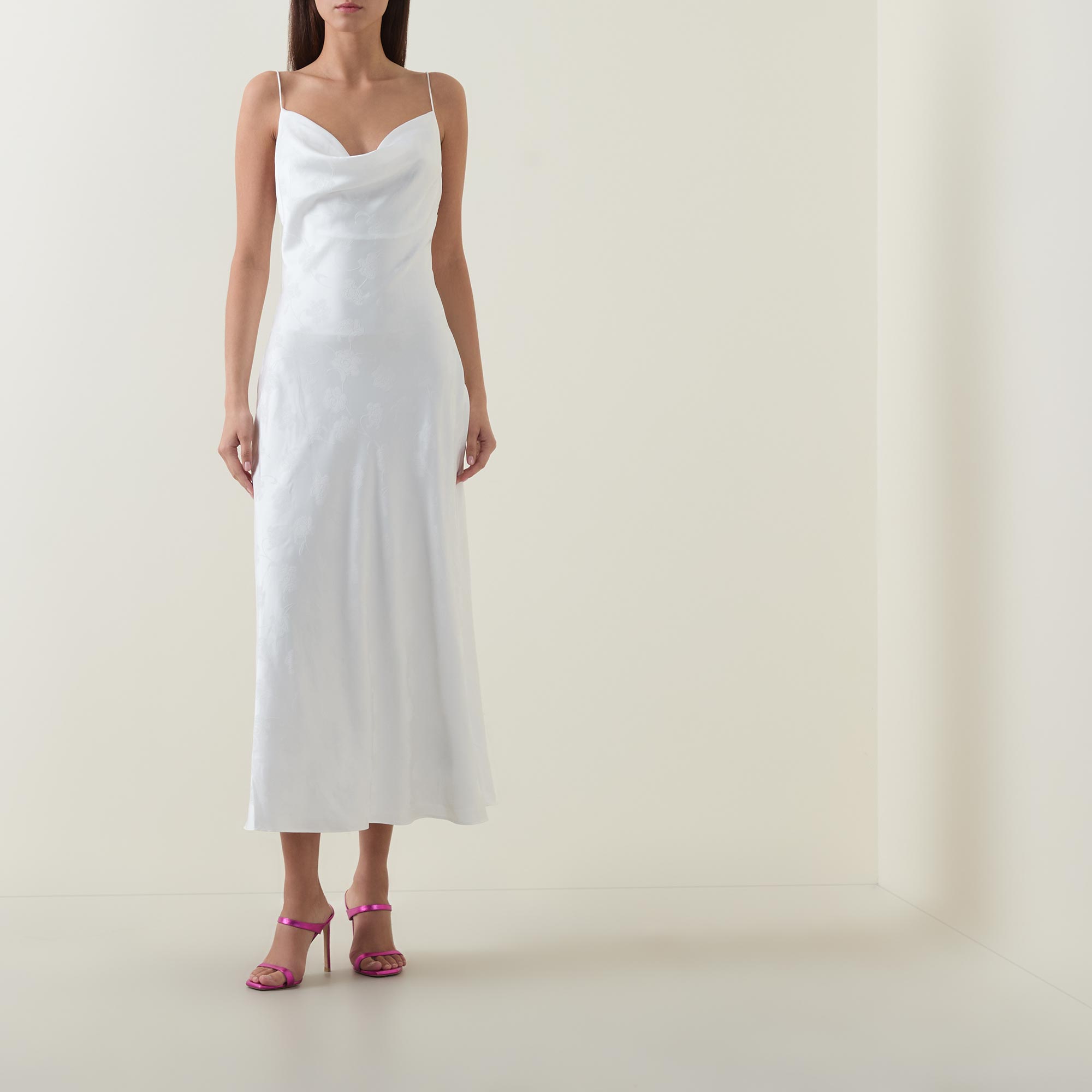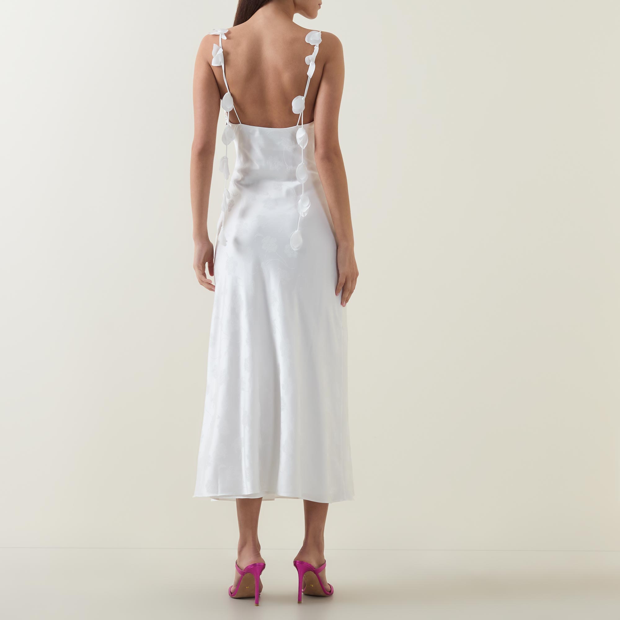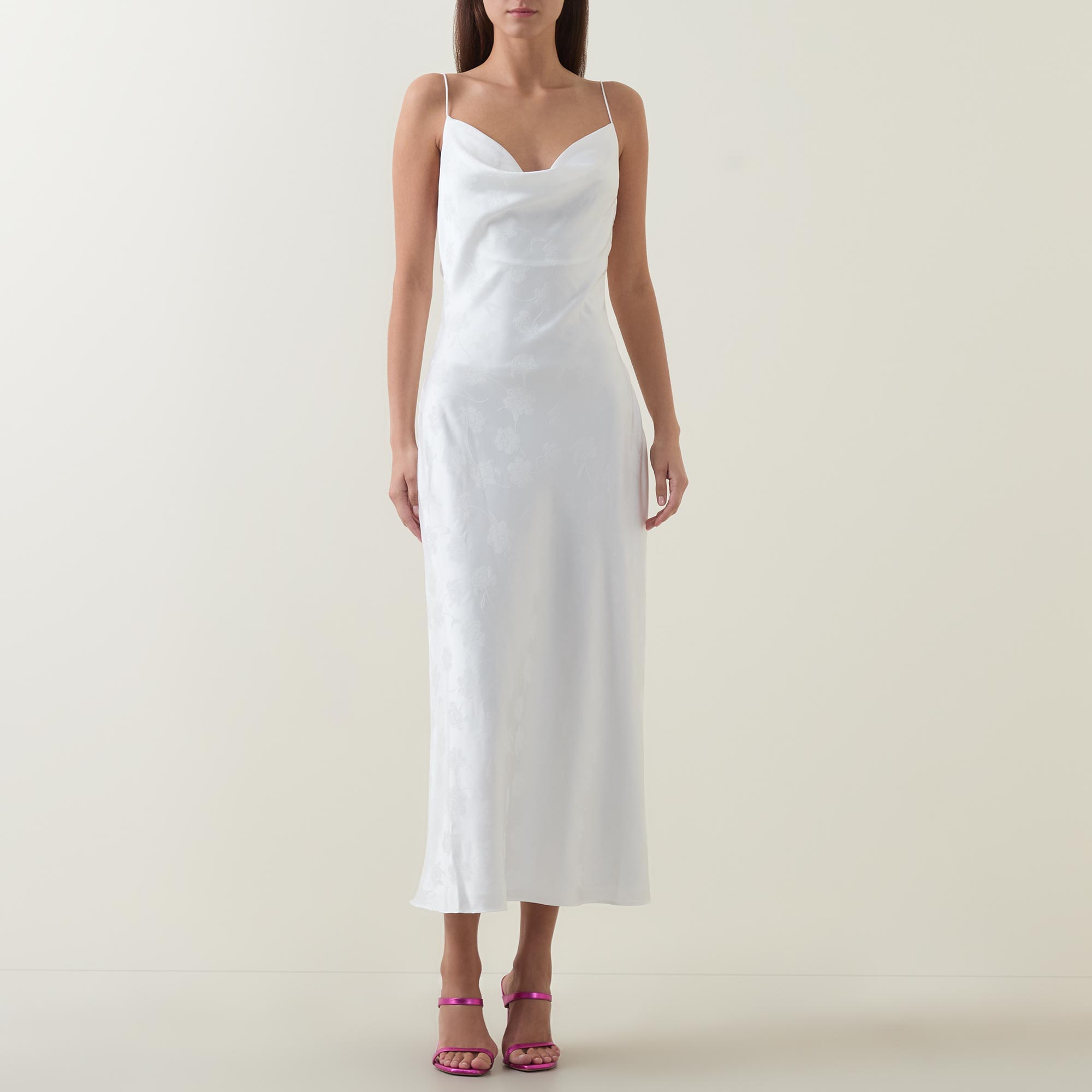 - Cowl neckline, spaghetti straps, tassel details with floral appliqués, flower jacquard pattern, midi length, sheen finish