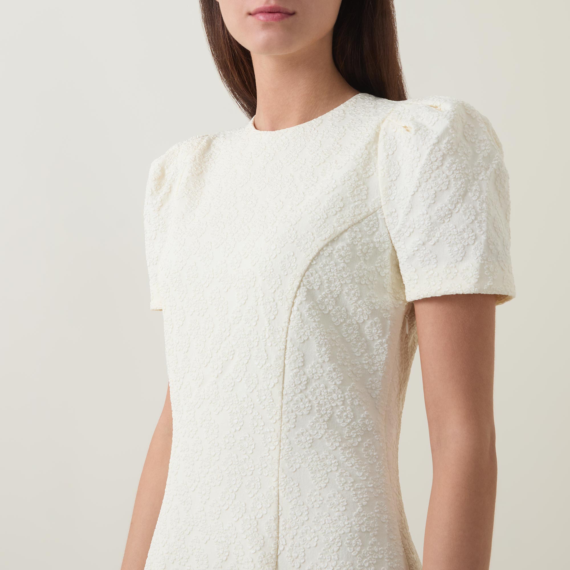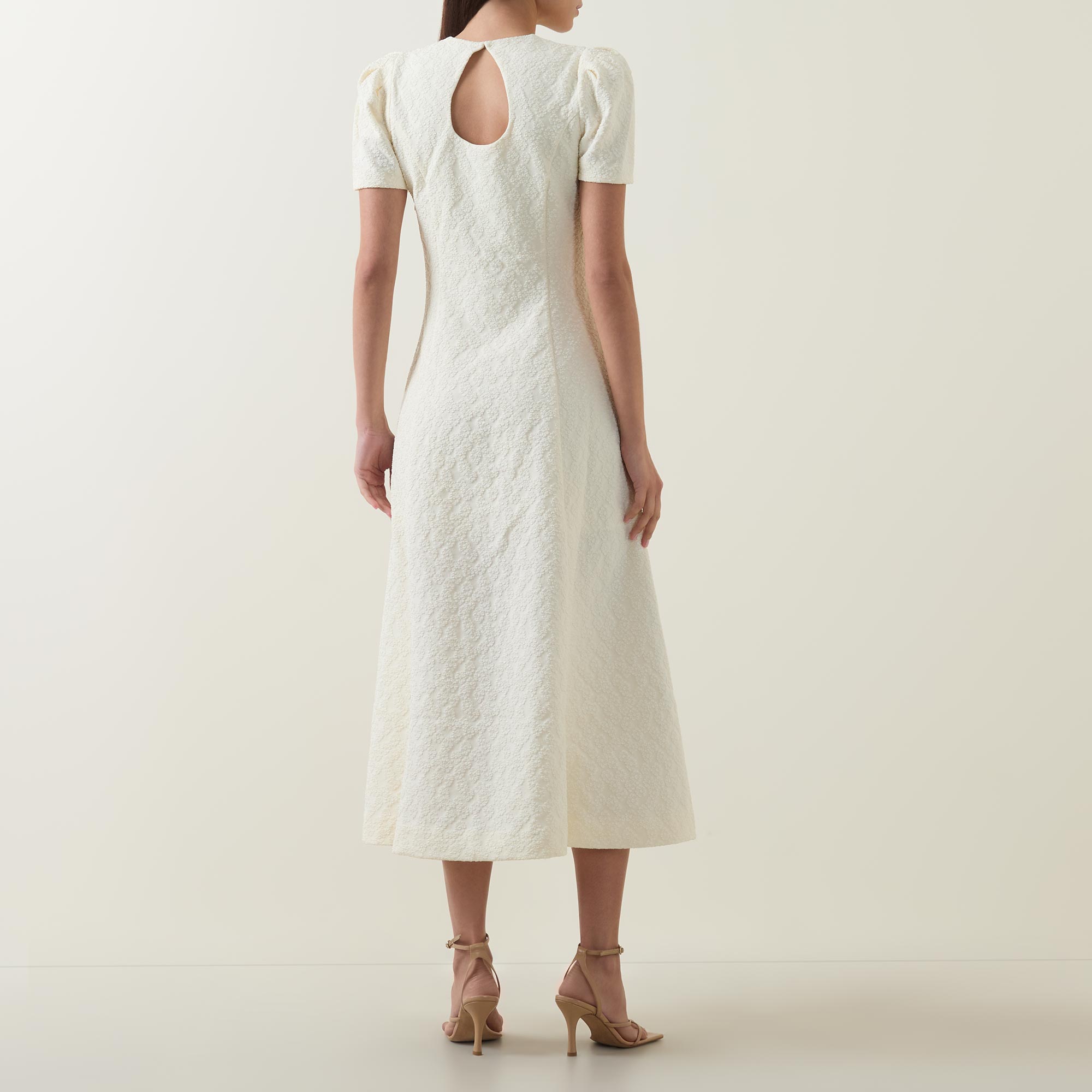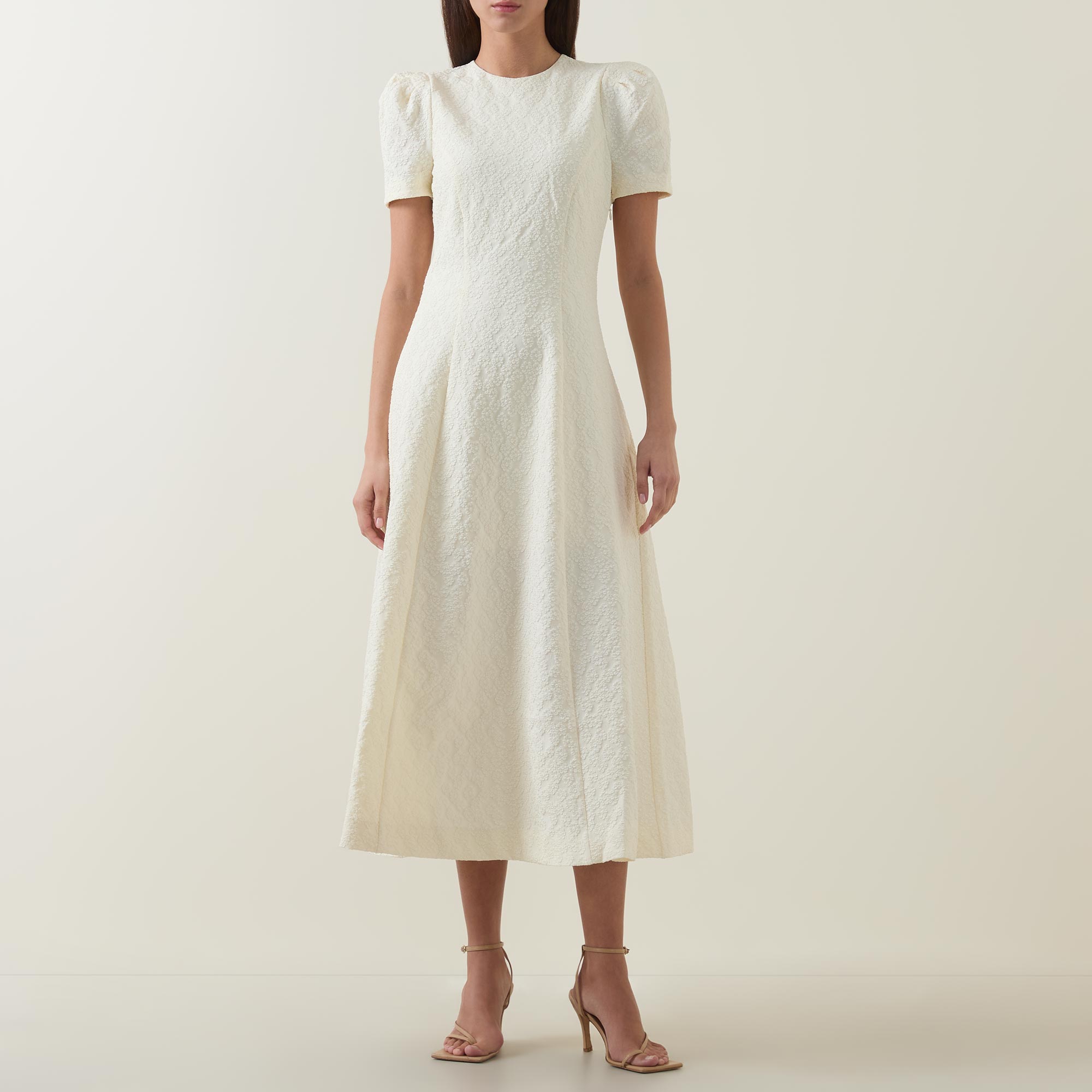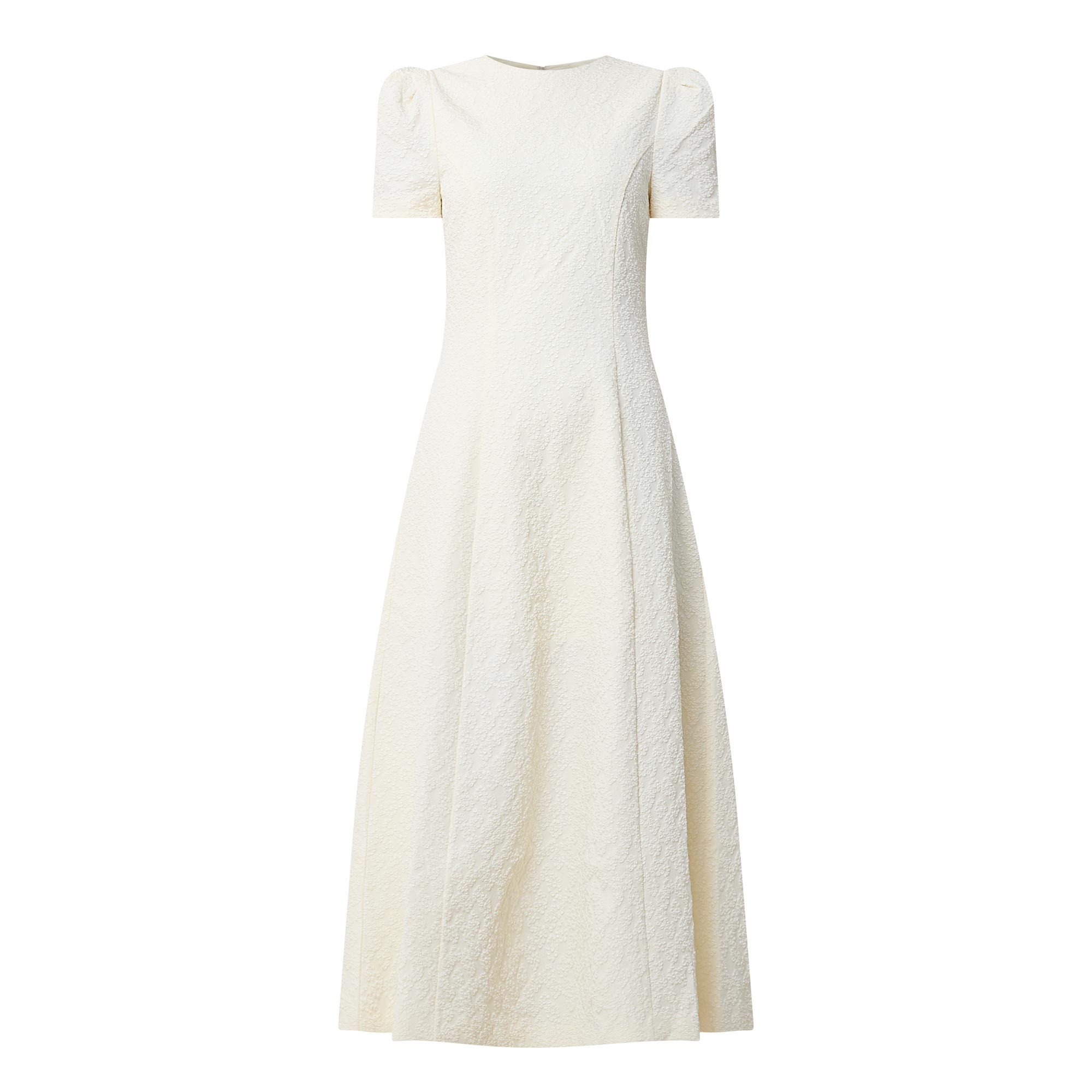 - Round neckline, short sleeve, button and loop fastening to the back, side zip closure, midi length, flared hemline, floral jacquard pattern