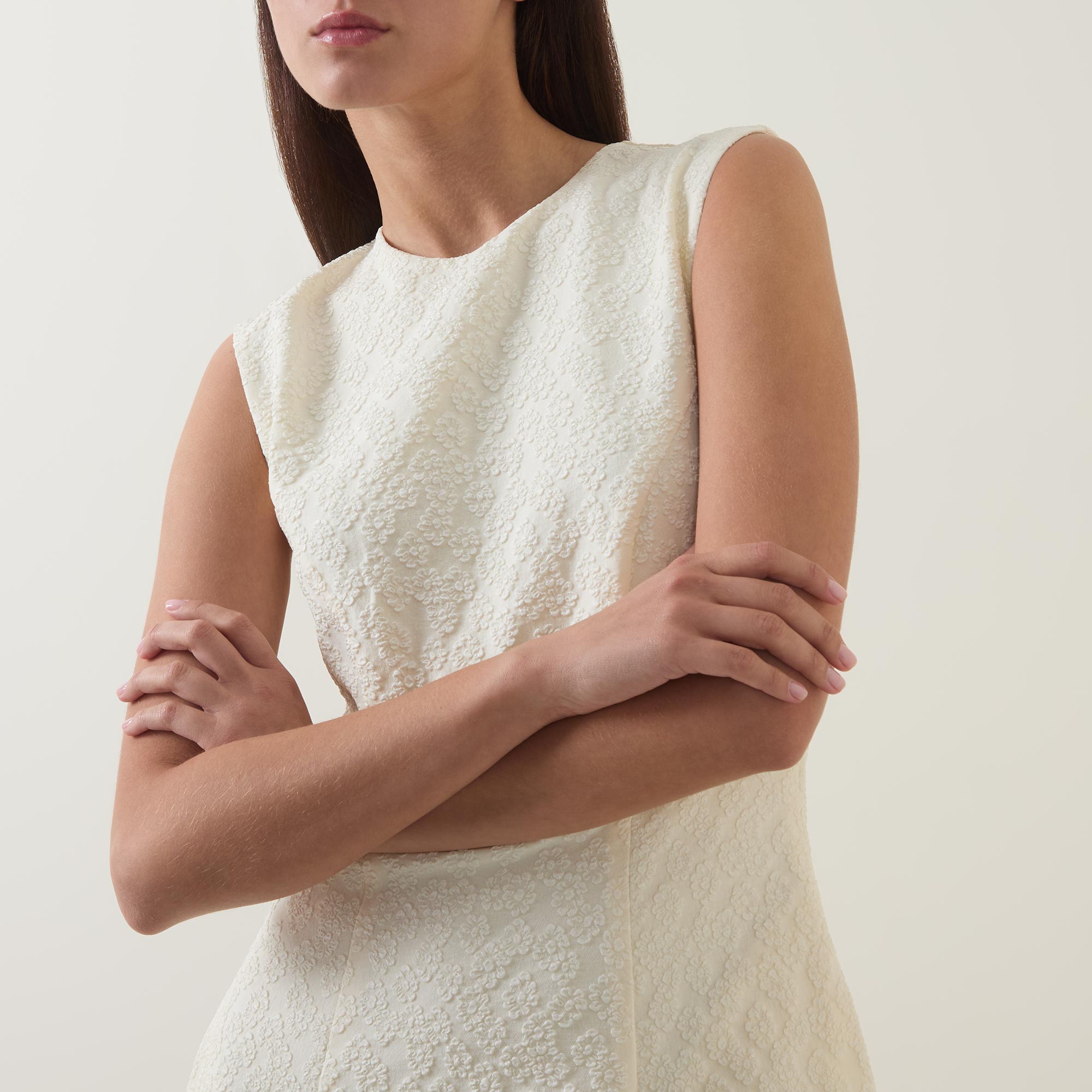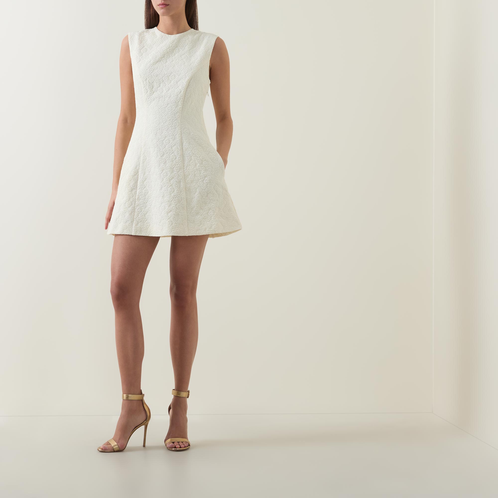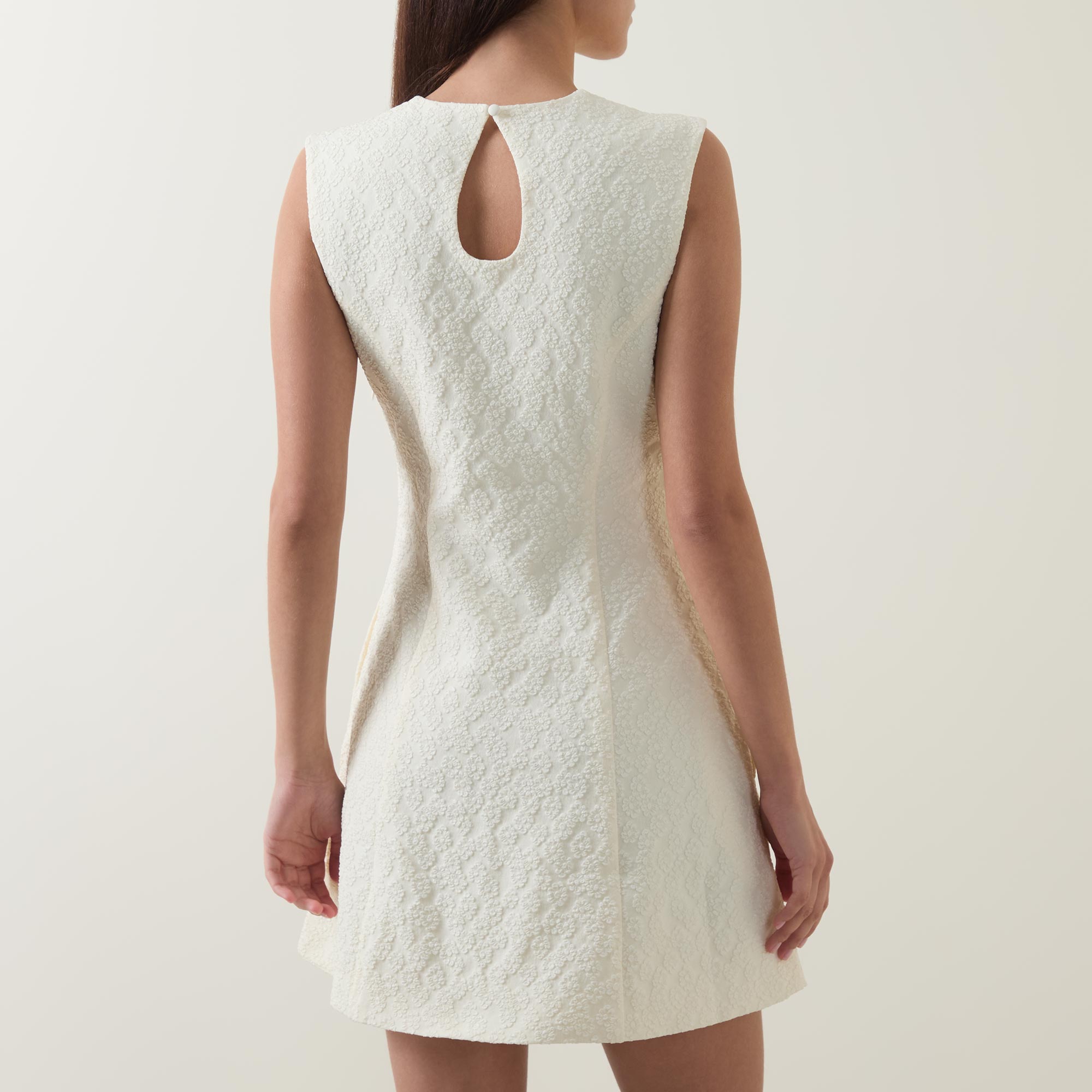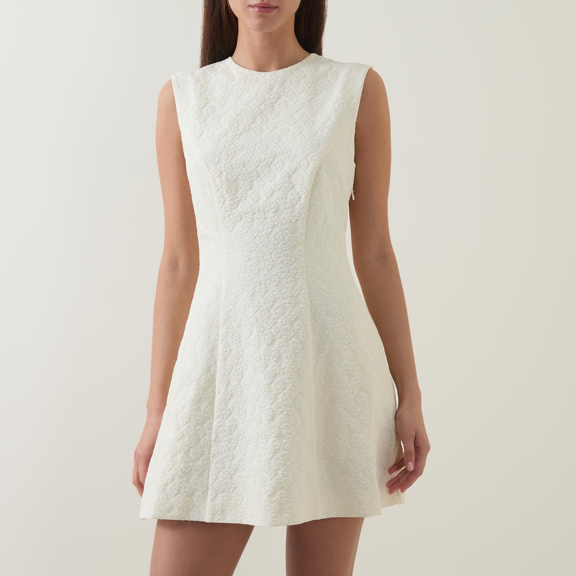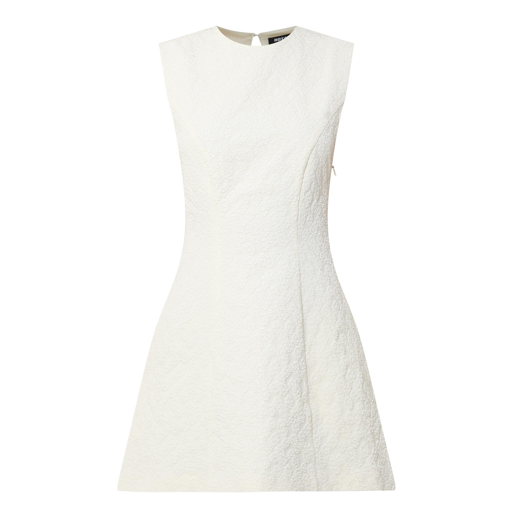 • Round neckline, sleeveless, zip closure, mini length, flared hemline, floral jacquard pattern, button and loop closure at back, side zip fastening