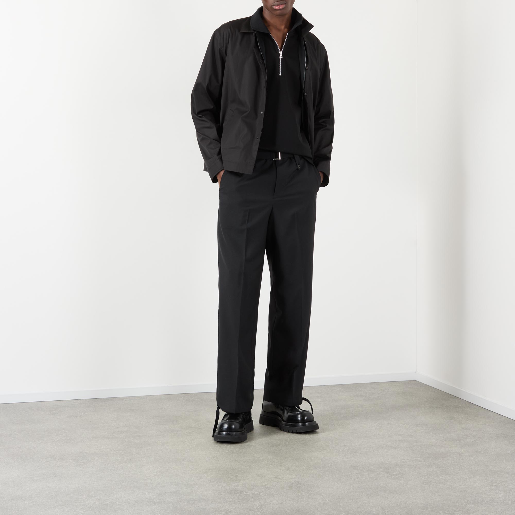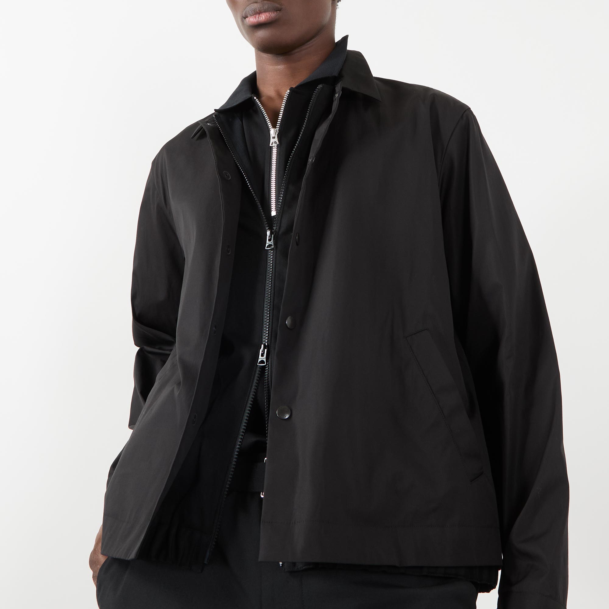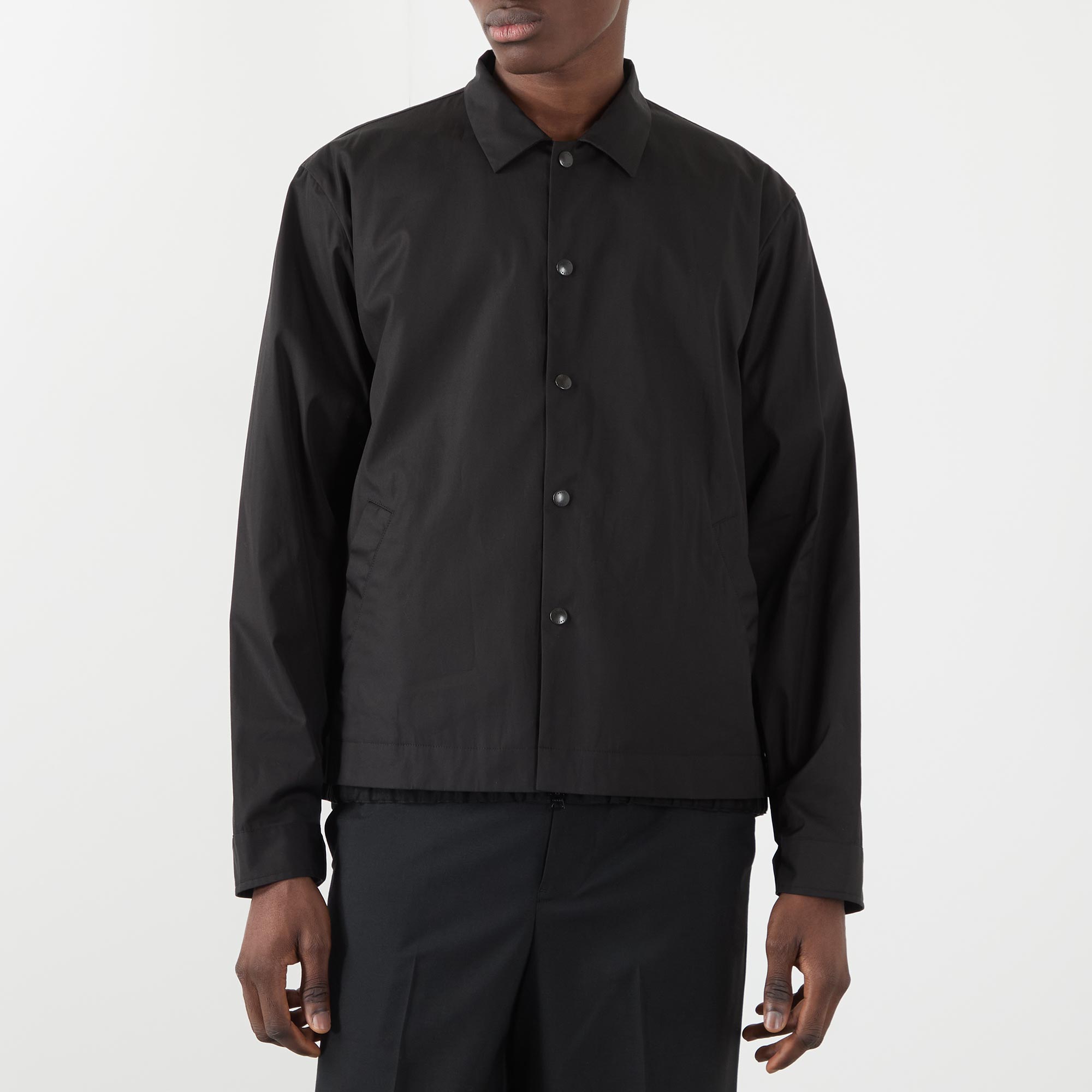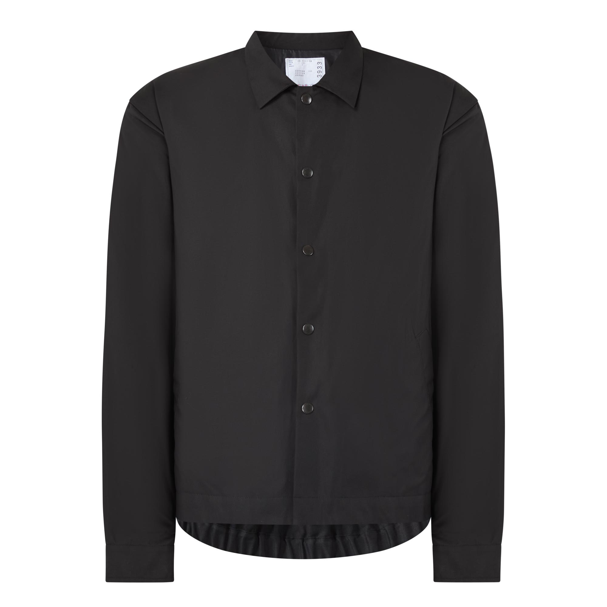 • Point collar, long sleeves, dropped shoulders, button-through fastening, two side in-seam pockets, straight hemline