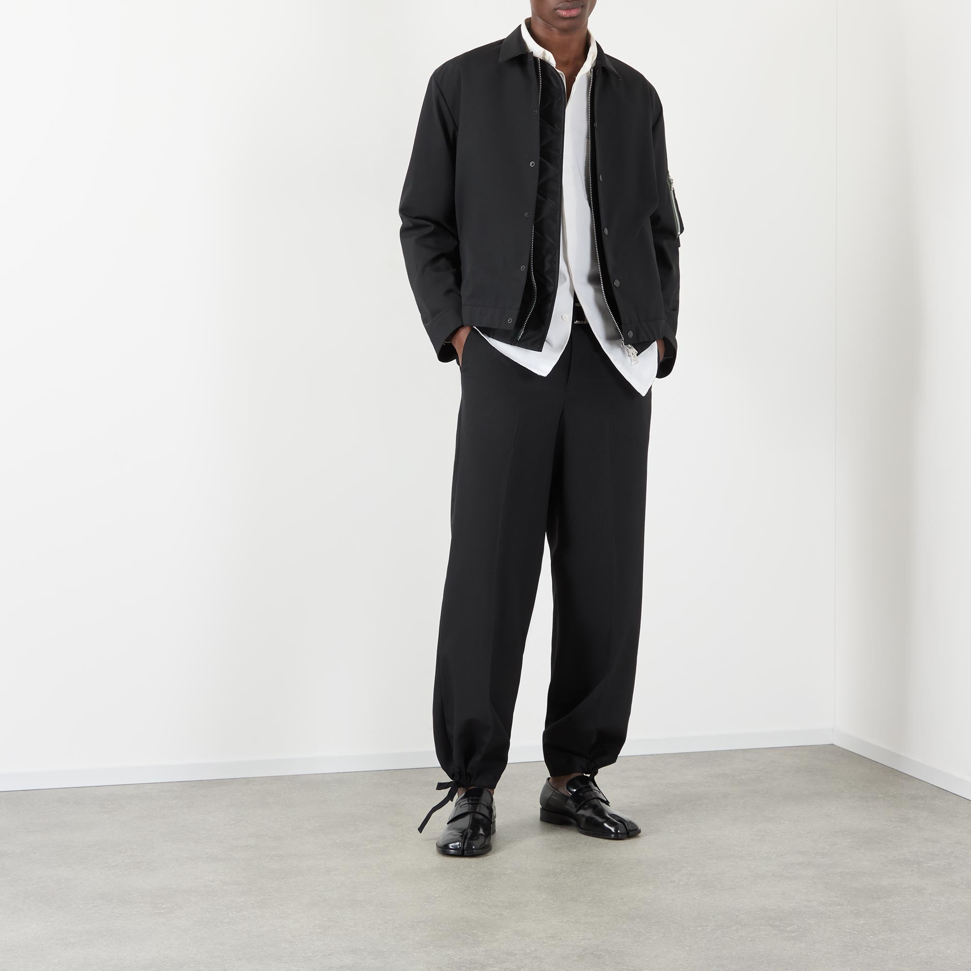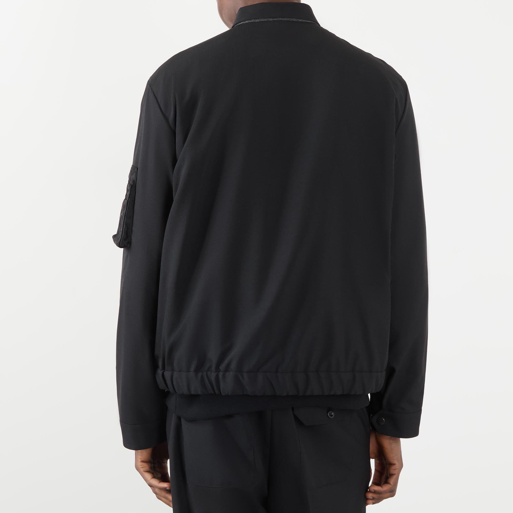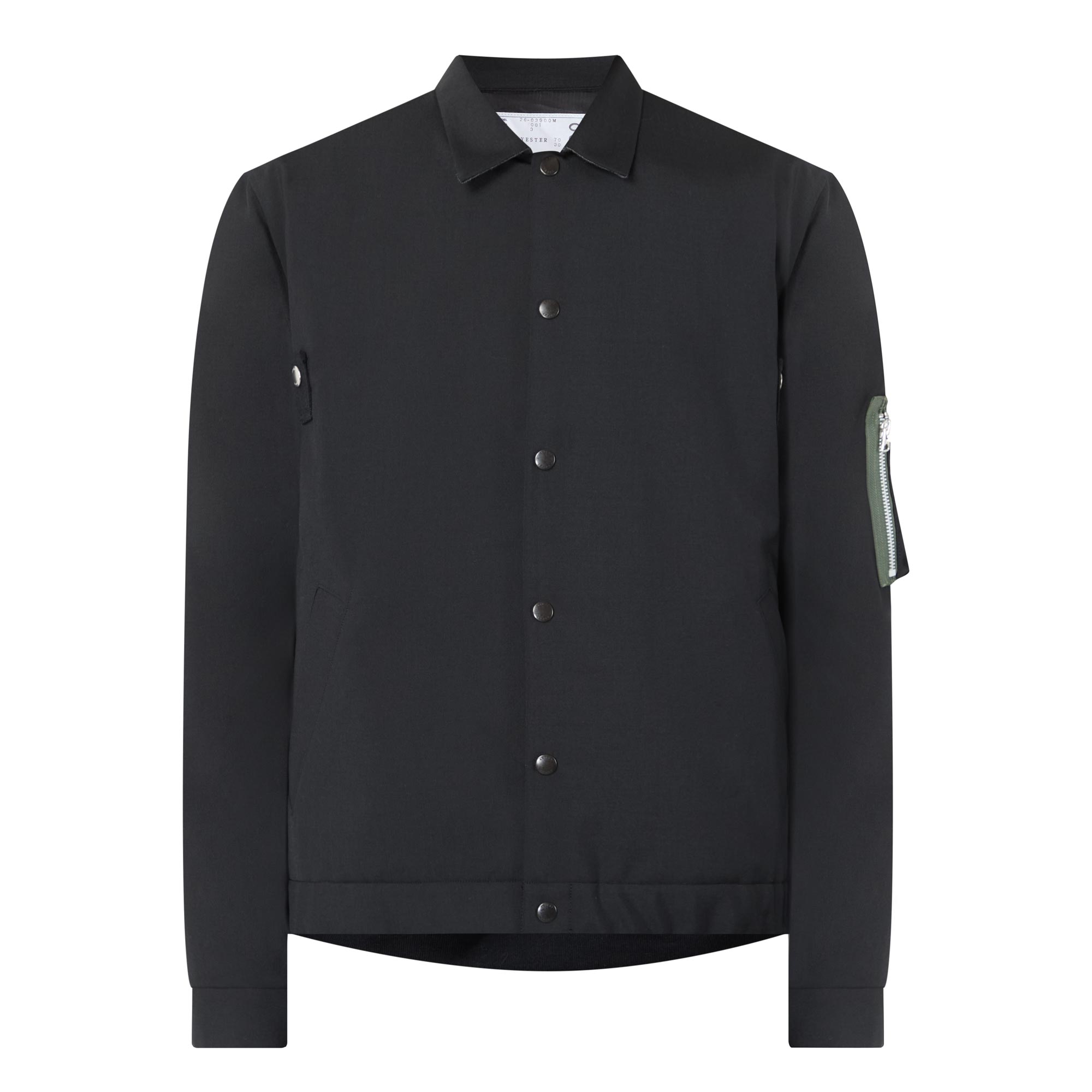 • Point collar, long sleeves, dropped shoulders, zip-fastening insert, button-through fastening, two side in-seam pockets, zip-fastening pocket on left sleeve, straight hemline, elasticated back panel