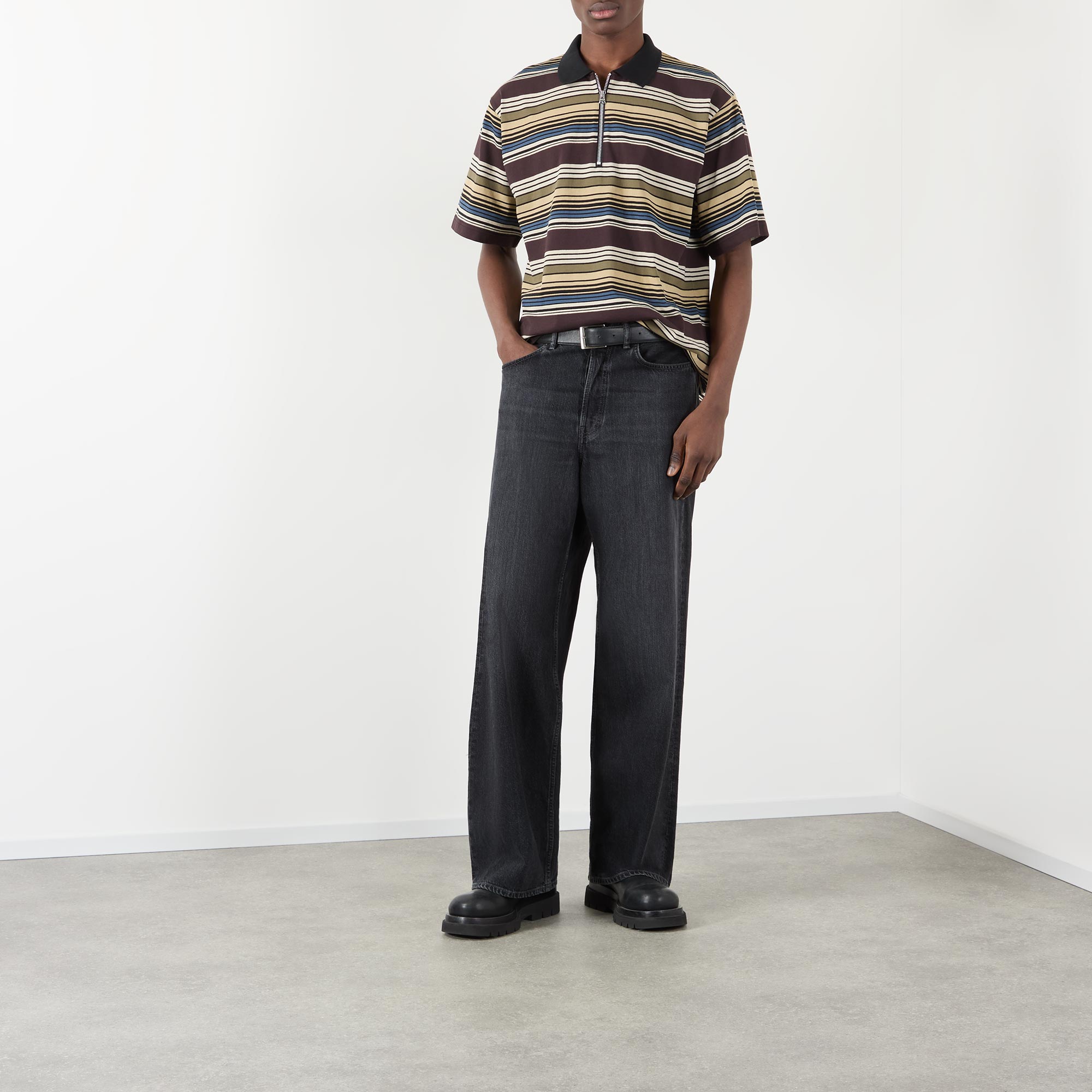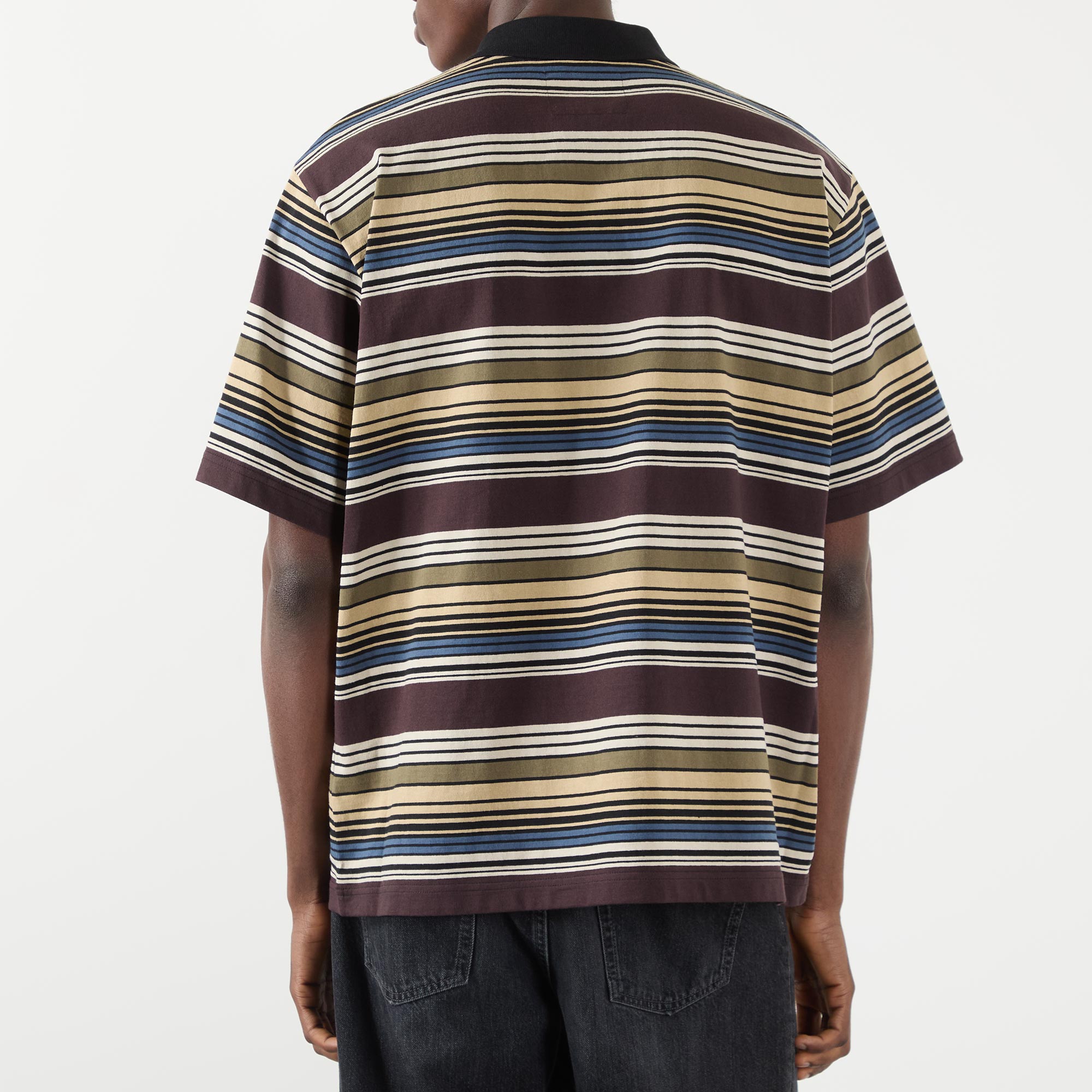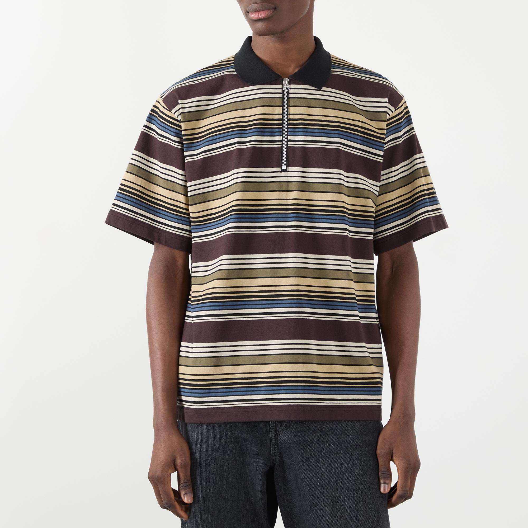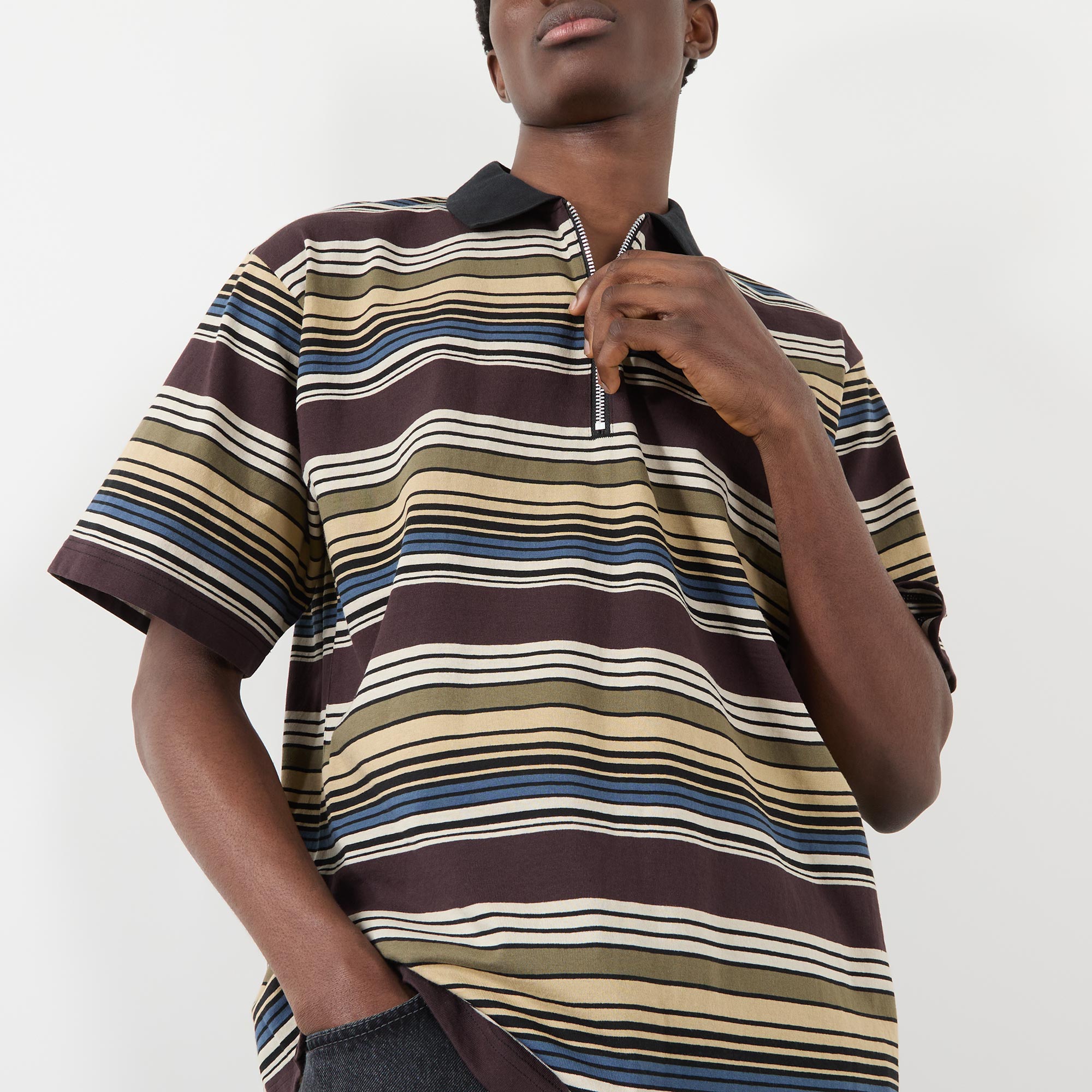 • Polo collar, short sleeves, half zip-fastening placket, dropped shoulders, striped pattern, tonal stitching, straight hemline, smooth fabric