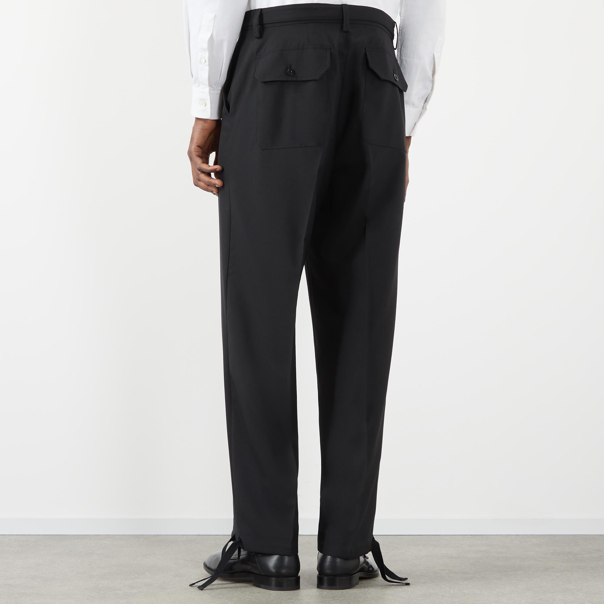 - Belt loops, adjustable belt, two side in-seam pockets, two rear flap pockets with button fastenings, mid-rise, straight-cut leg, pressed creases, tie-fastening cuffs