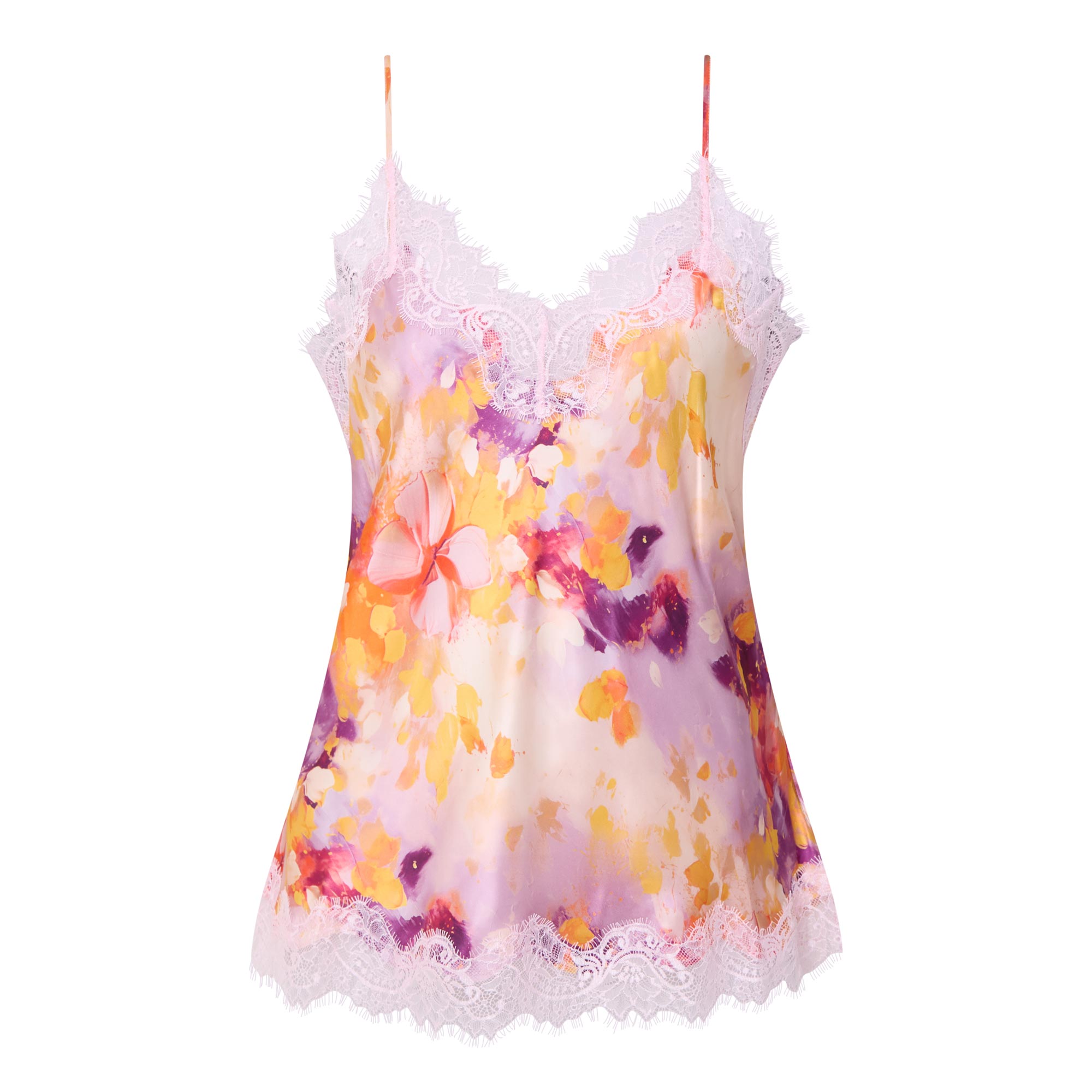 - V-neckline, fine adjustable straps, curved hem, tonal lace trim detailing throughout, abstract floral pattern, smooth silk finish