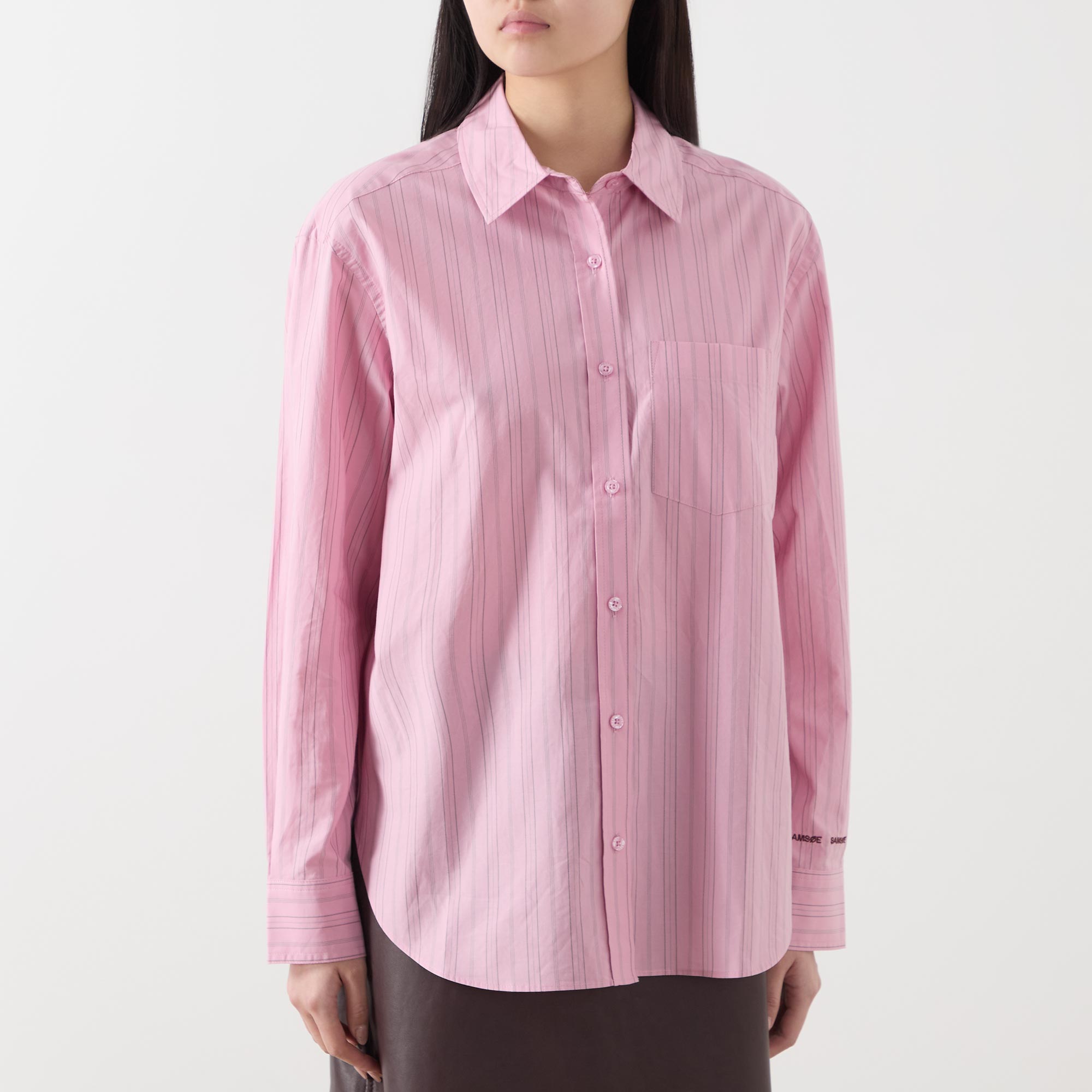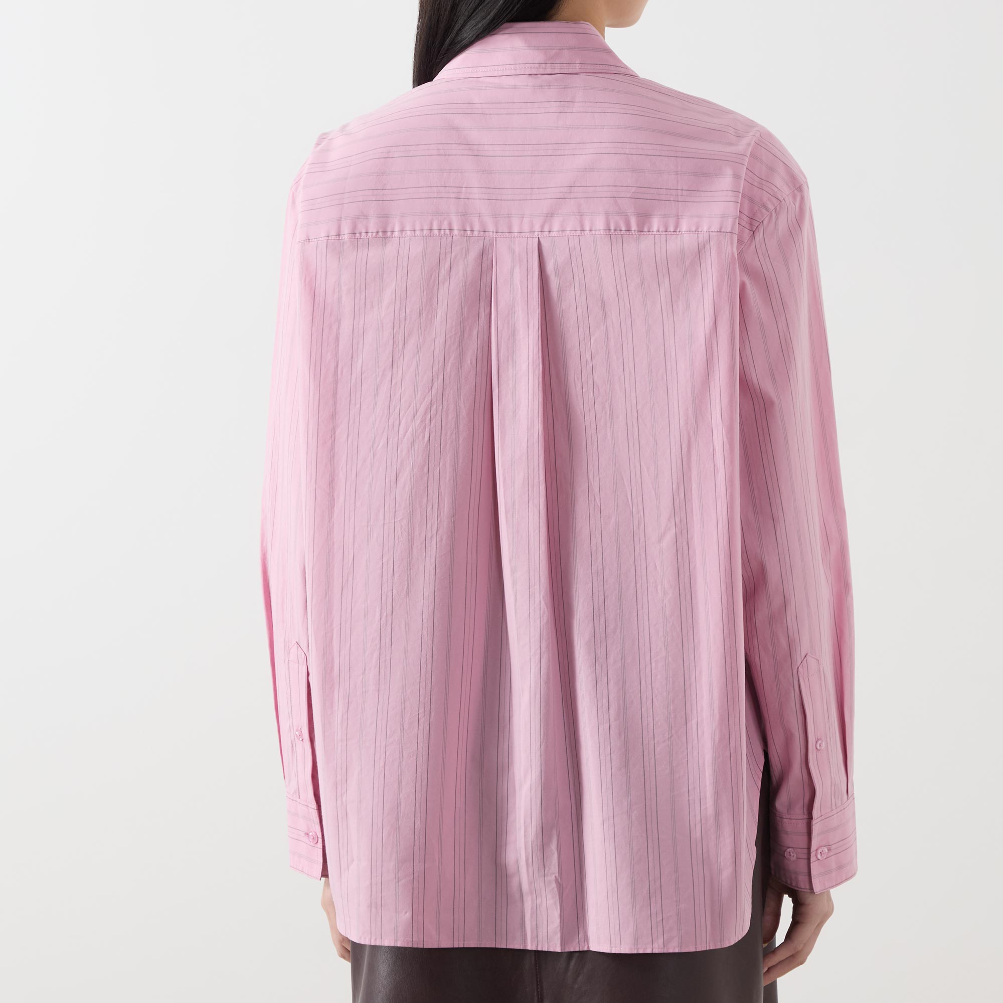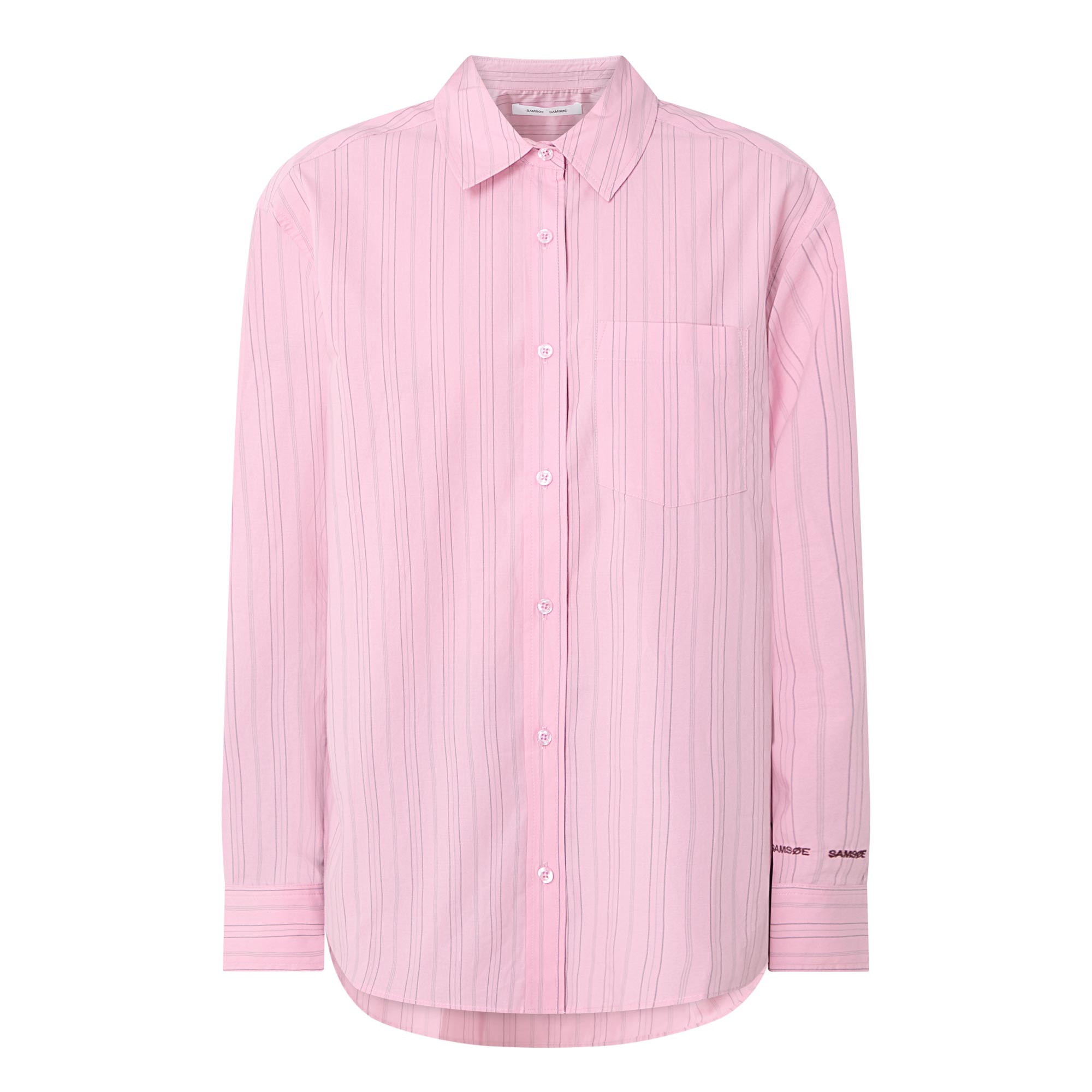 • Point collar, dropped shoulders, long pleated sleeves, buttoned cuffs, one chest patch pocket, front button placket, curved hem, striped pattern