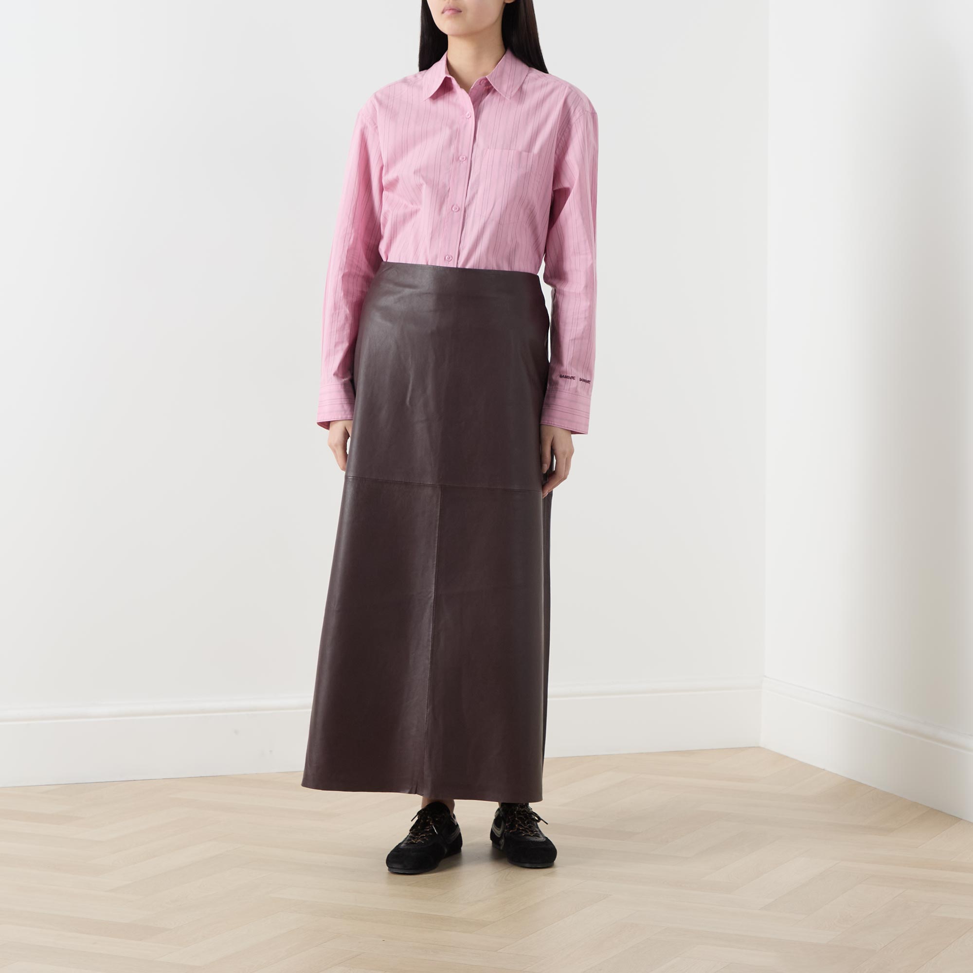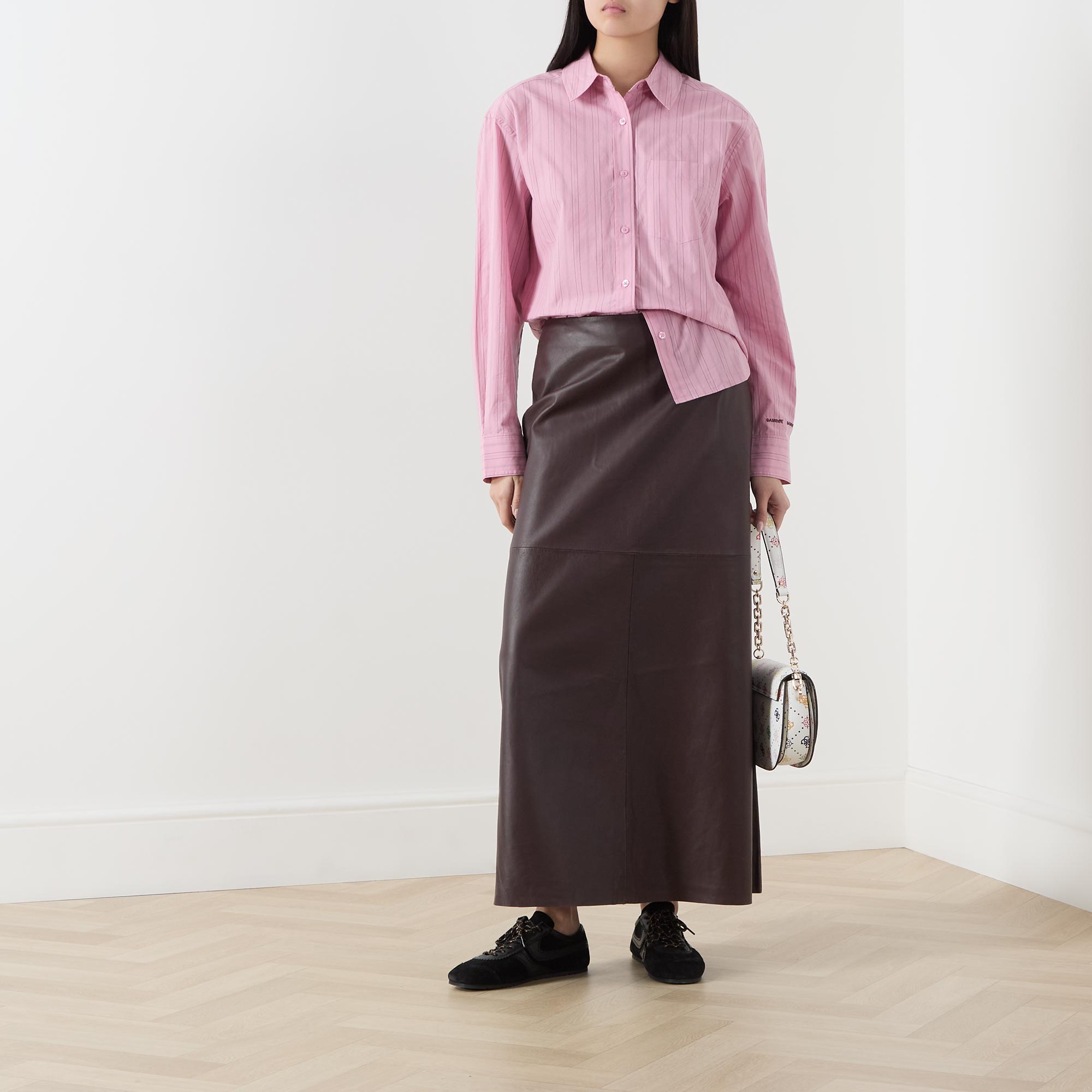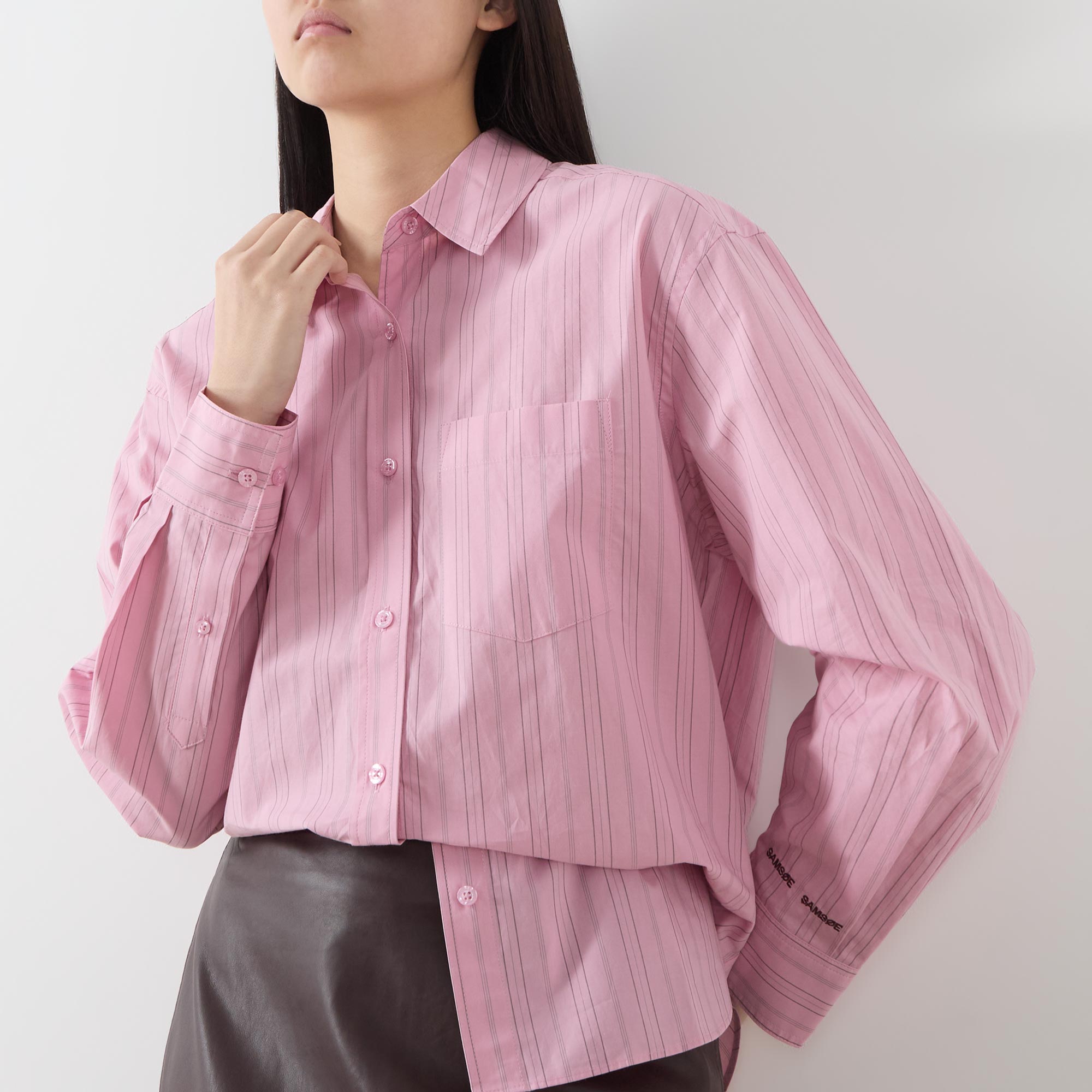 • Point collar, dropped shoulders, long pleated sleeves, buttoned cuffs, one chest patch pocket, front button placket, curved hem, striped pattern