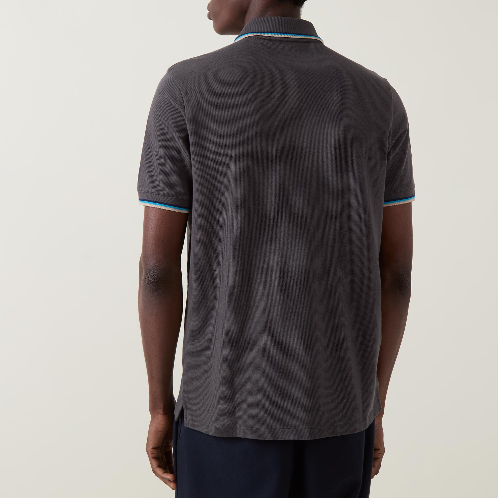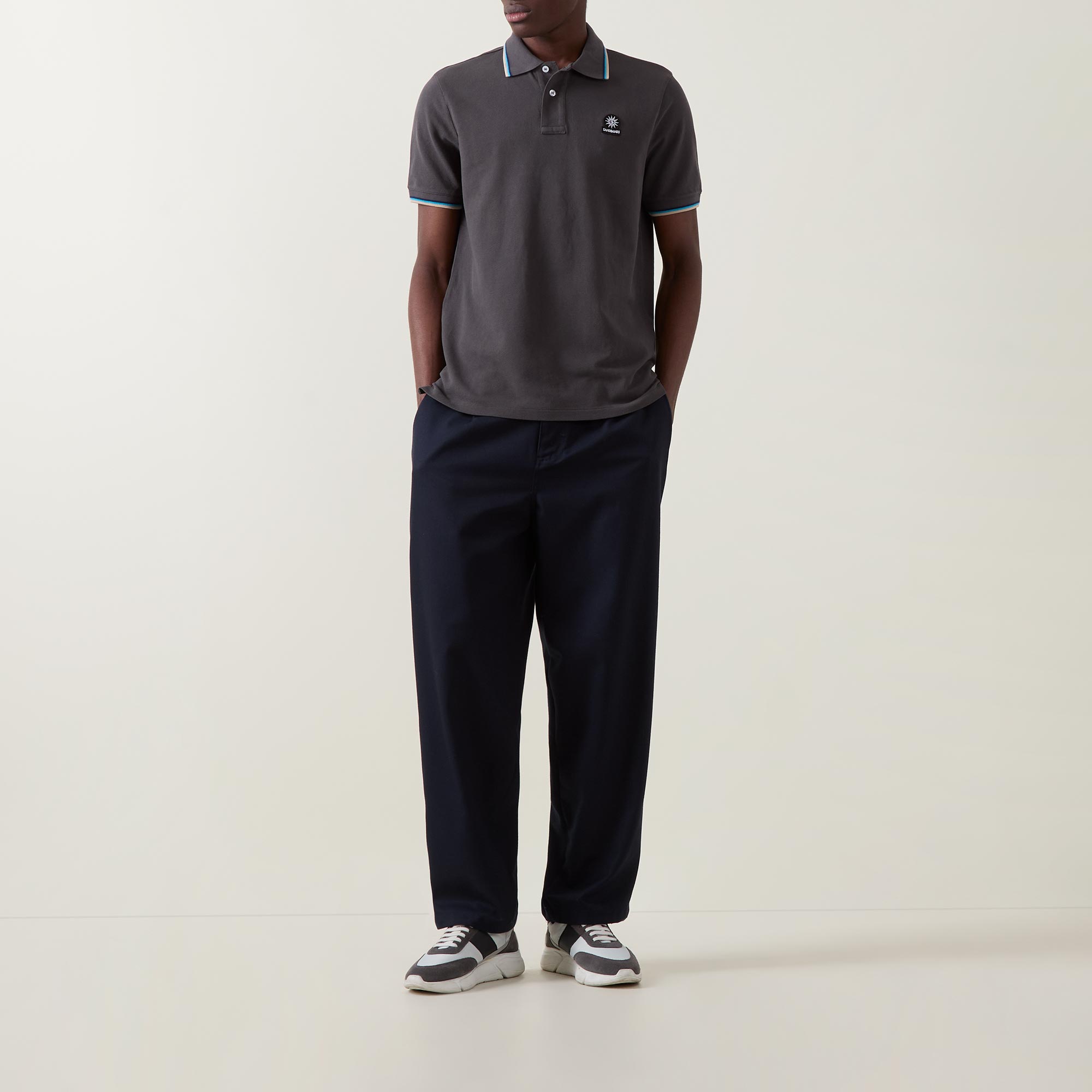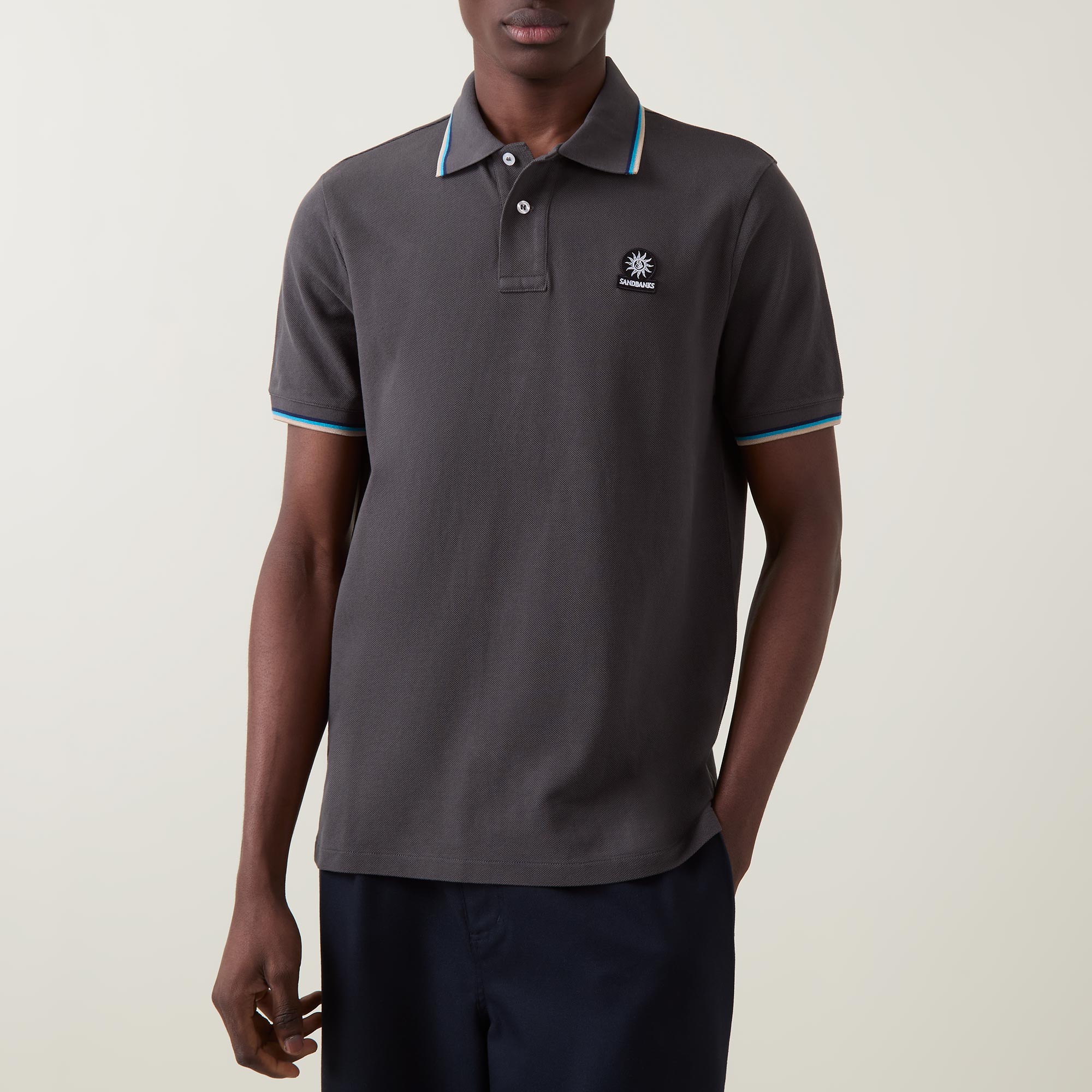 - Polo collar, short sleeves, logo badge, button fastenings, straight hemline, tipped trims