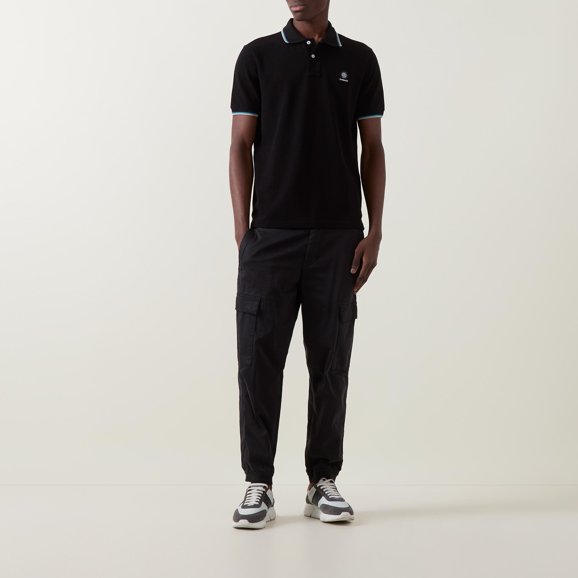 - Polo collar, short sleeves, logo badge, button fastenings, straight hemline, tipped trims