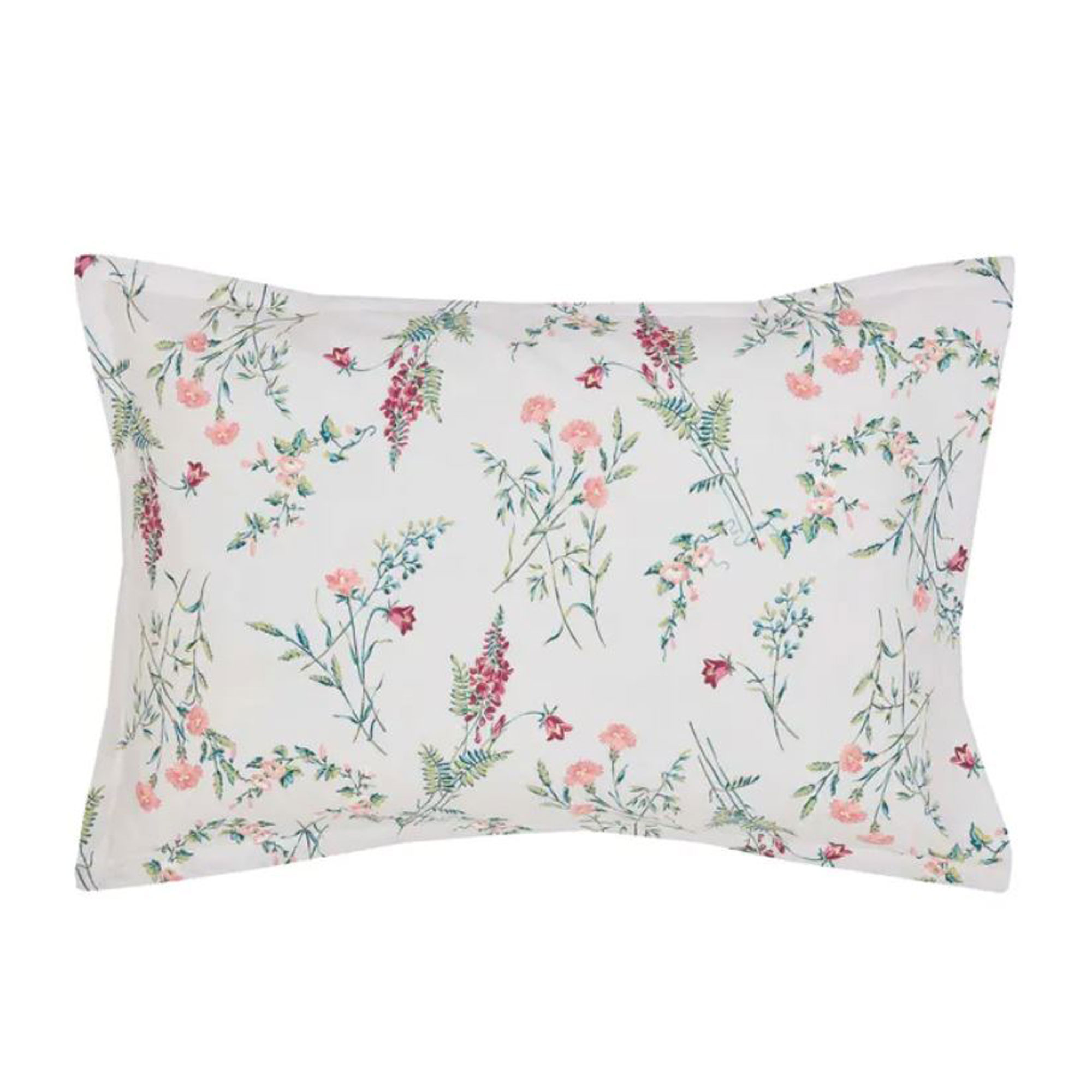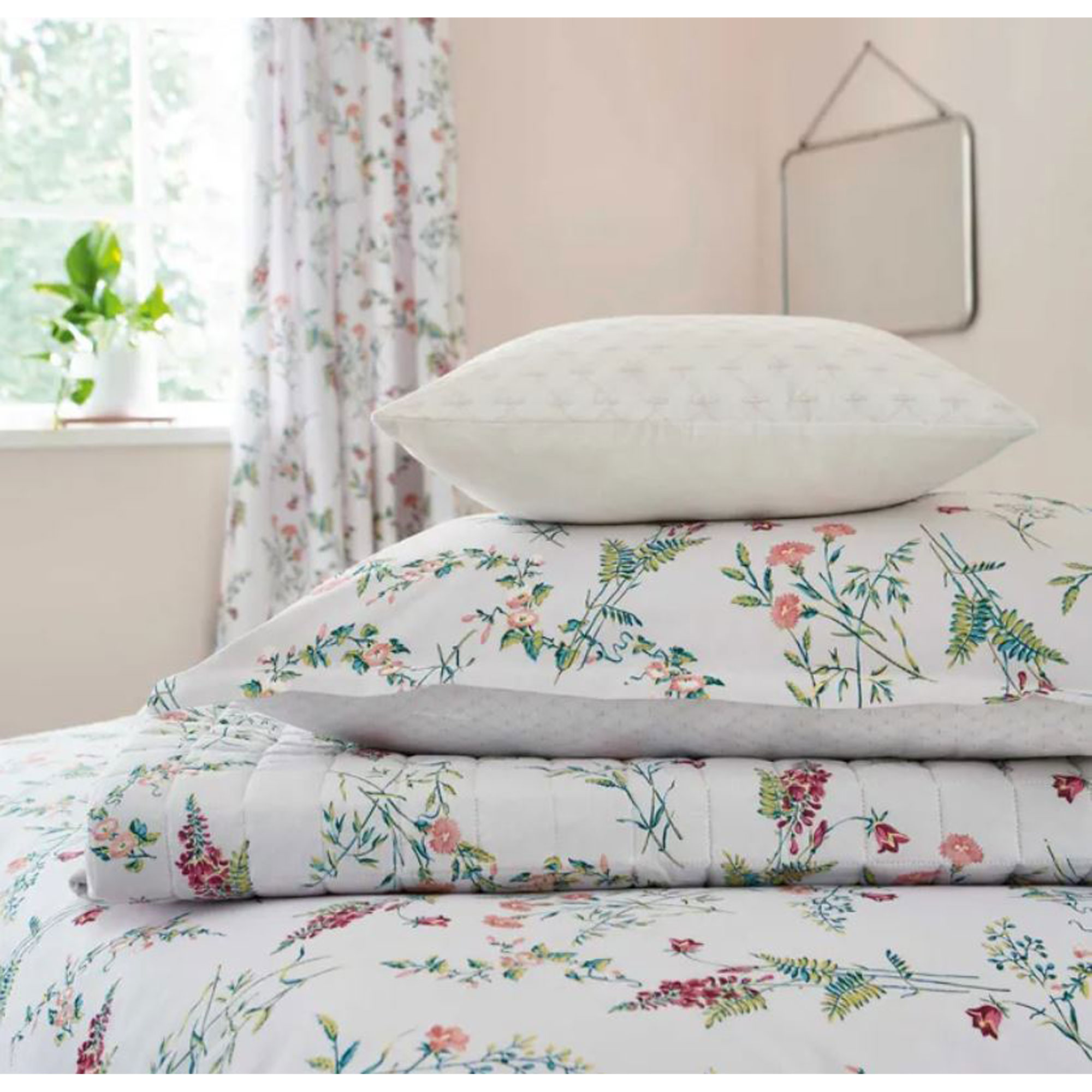 Alnwick Gardens features a subtle orchid pink coloured ground scattered with beautifully illustrated garden flowers, perfectly evoking the atmosphere of warm summer days. Printed on pure cotton, the duvet cover and Oxford pillowcase flip over to reveal a small scale trellis pattern on the reverse. Pair with a matching quilted bedspread featuring a small square quilting pattern and textured cotton accessory cushion decorated with trellis pattern embroidery.
