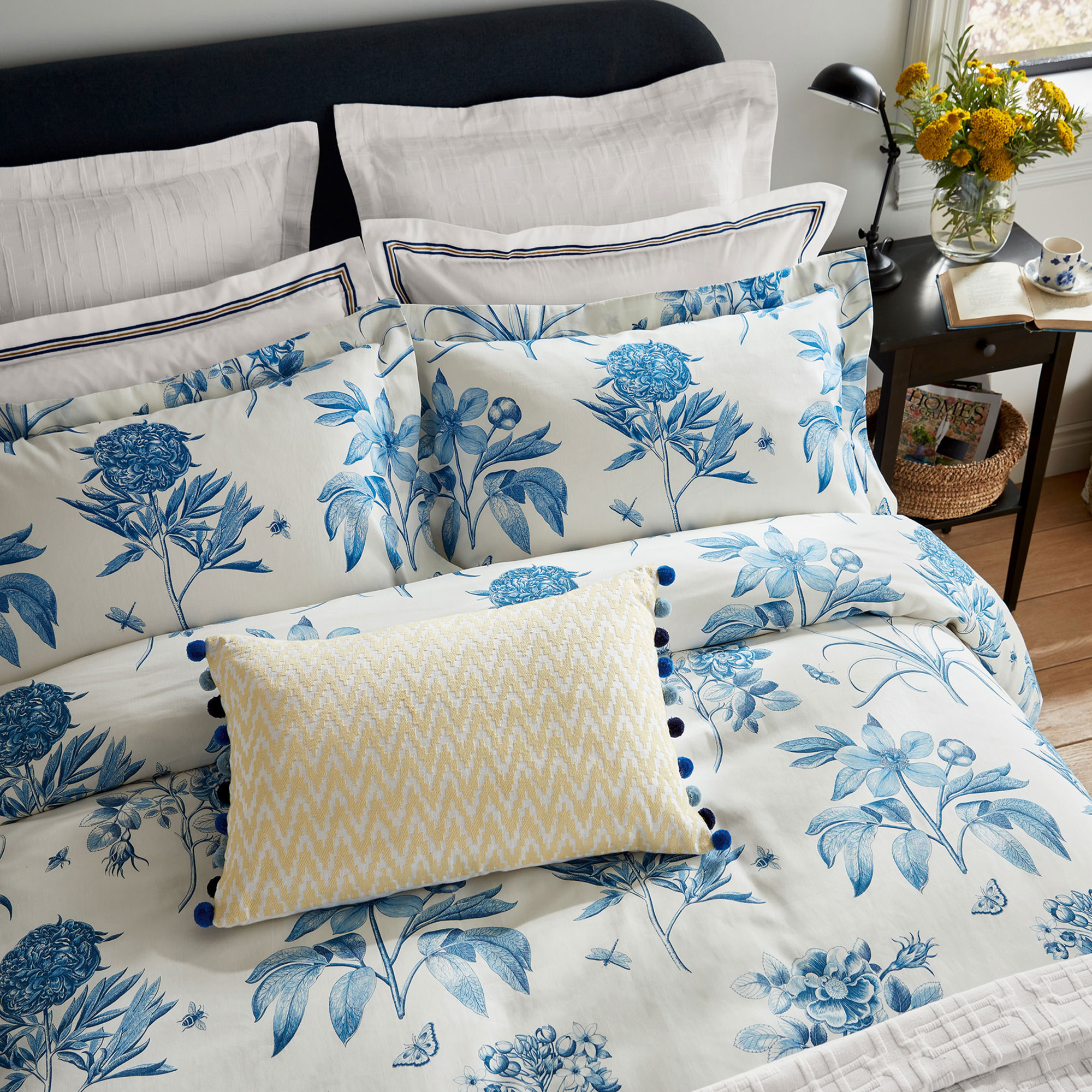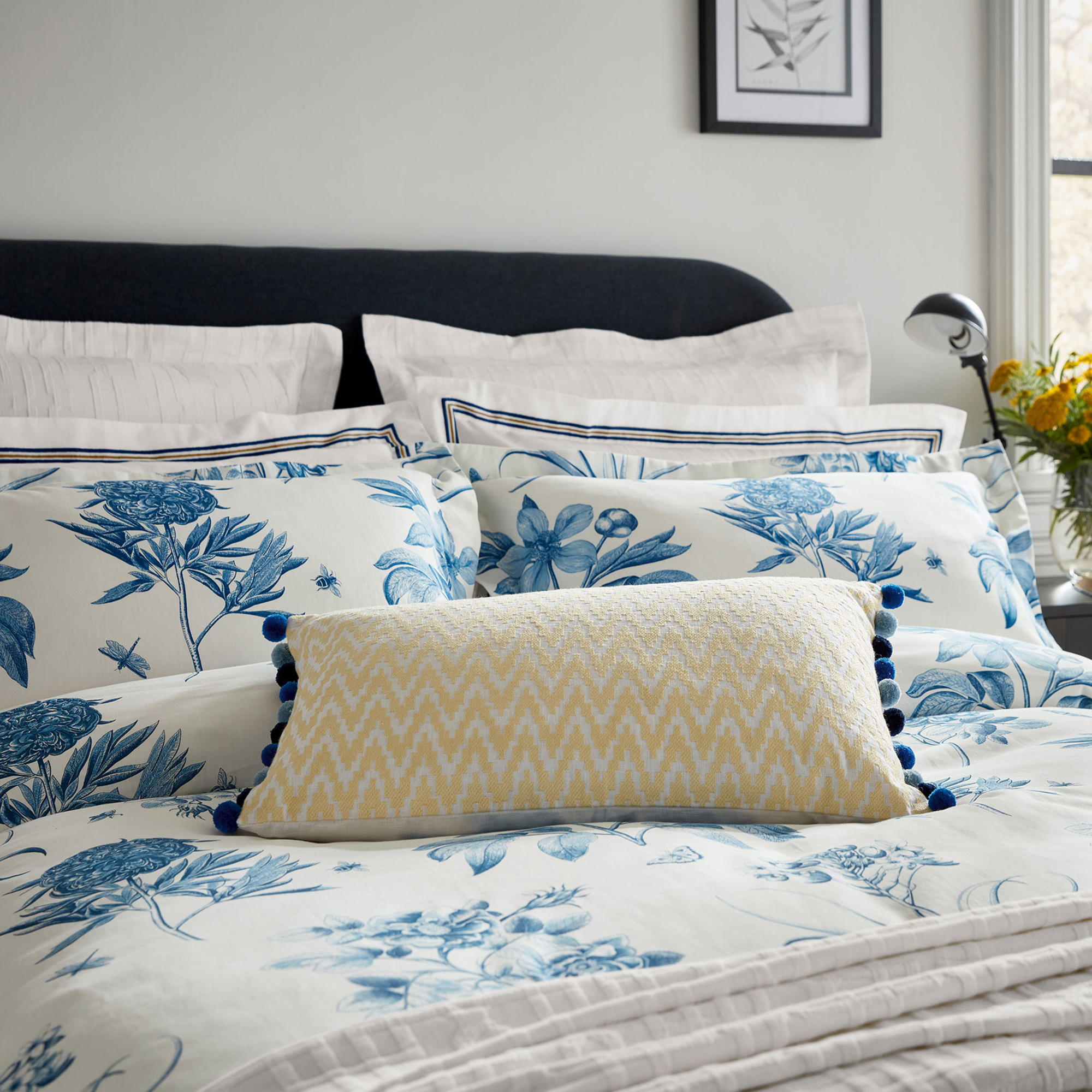 Taken from Sanderson’s Parchment Flowers collection, Etchings & Roses is now one of the brands best-selling designs. This antique, botanical design has been taken from the Sanderson archive and re-interpreted for bedlinen in elegant duck-egg and dove colour palettes. Available in sets and printed on pure cotton the range is complemented by a soft fringed blanket with a graduating stripe pattern and an accessory cushion featuring embroidered stylised leaves.