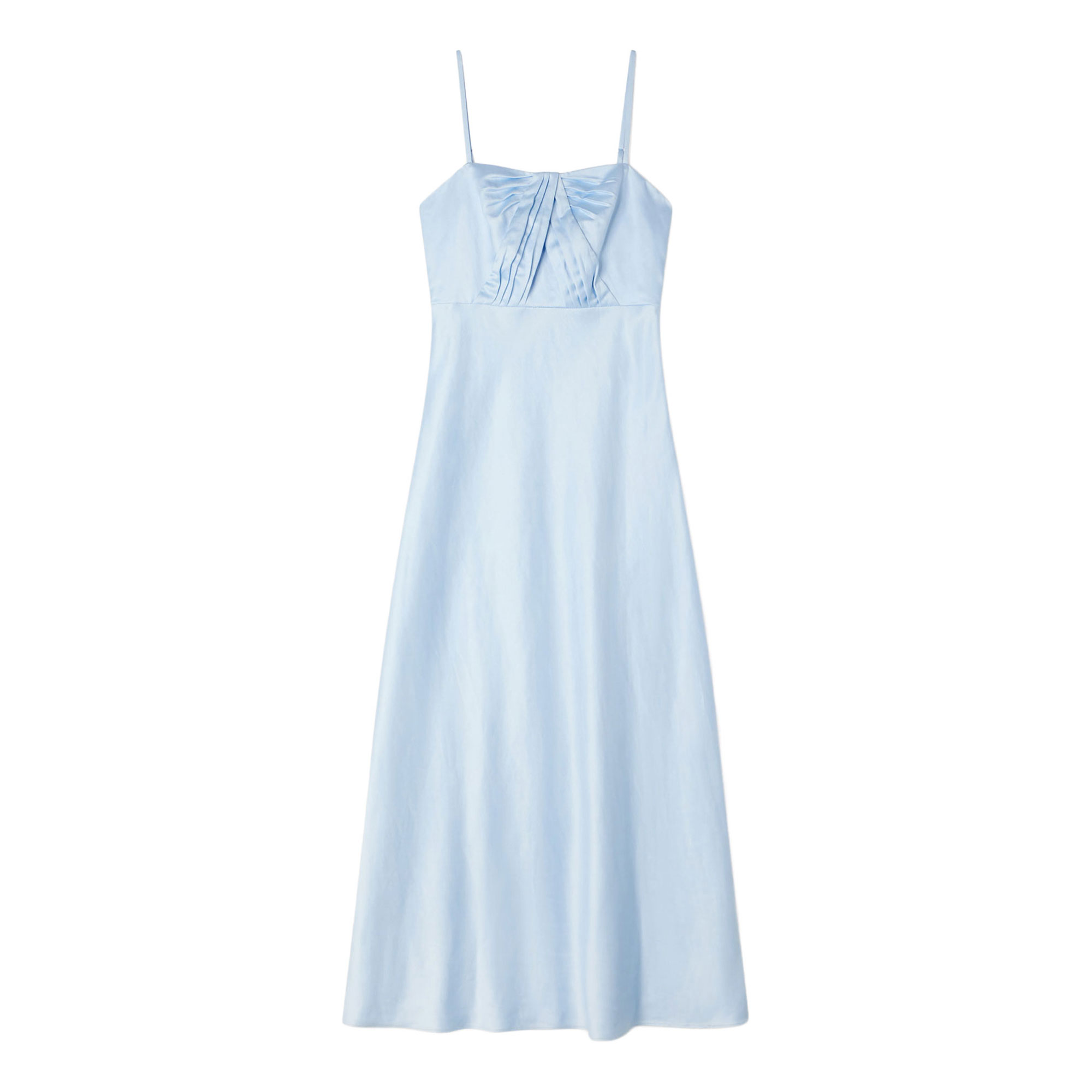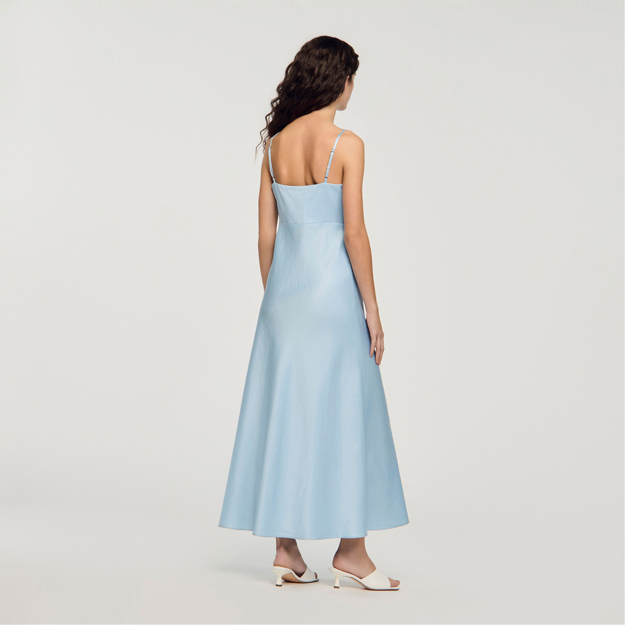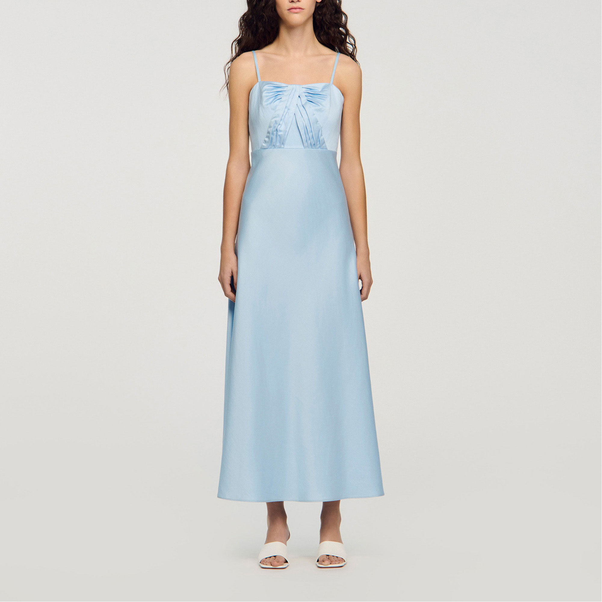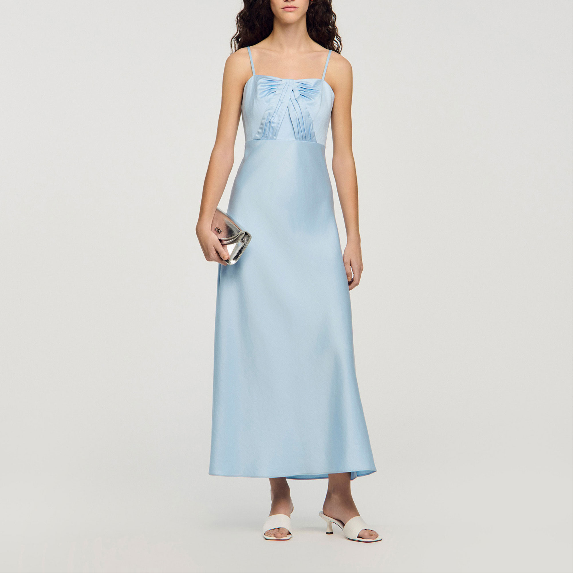 - Pleated bustier top, flared skirt, thin straps, cut-out under the bust, side zip fastening, satin fabric
