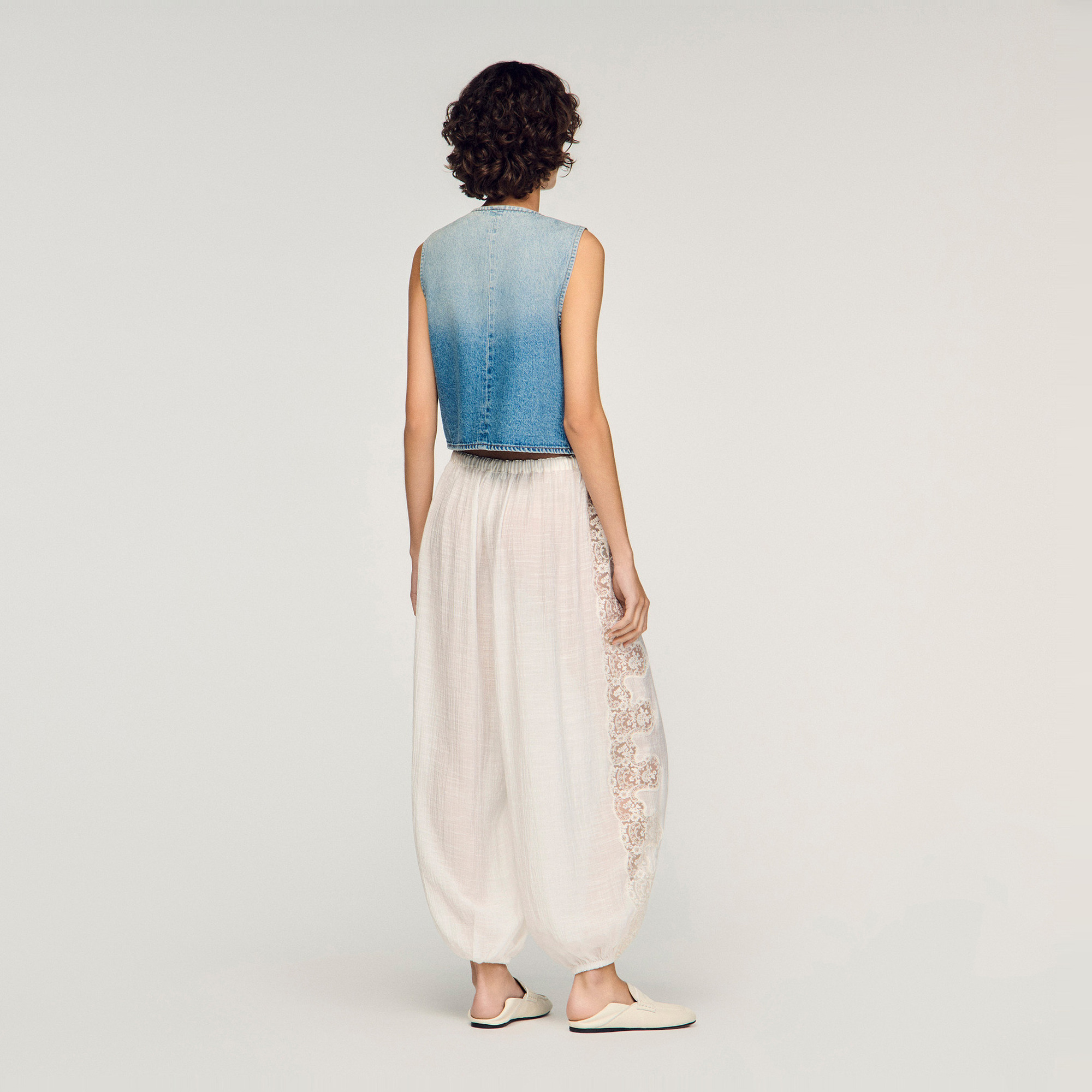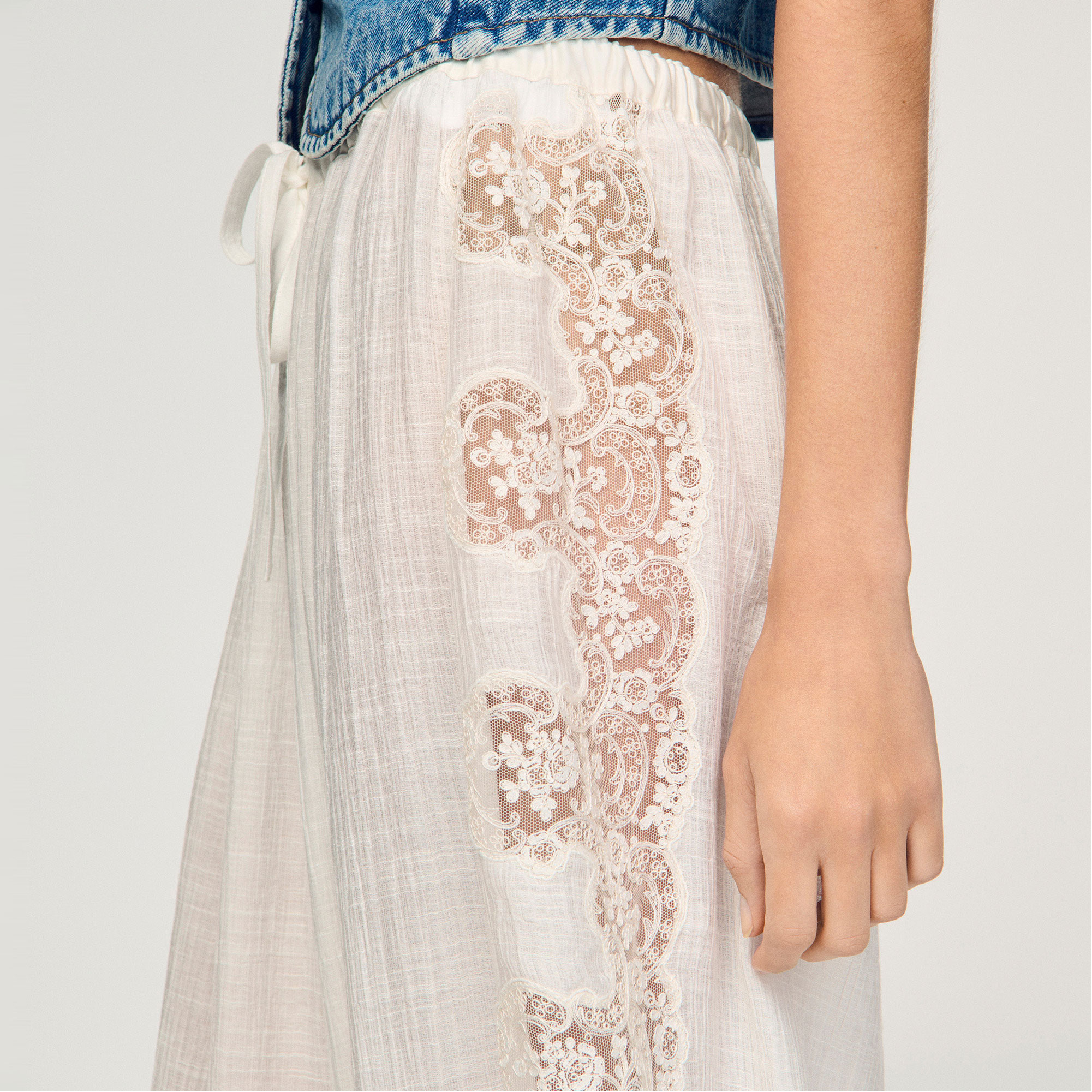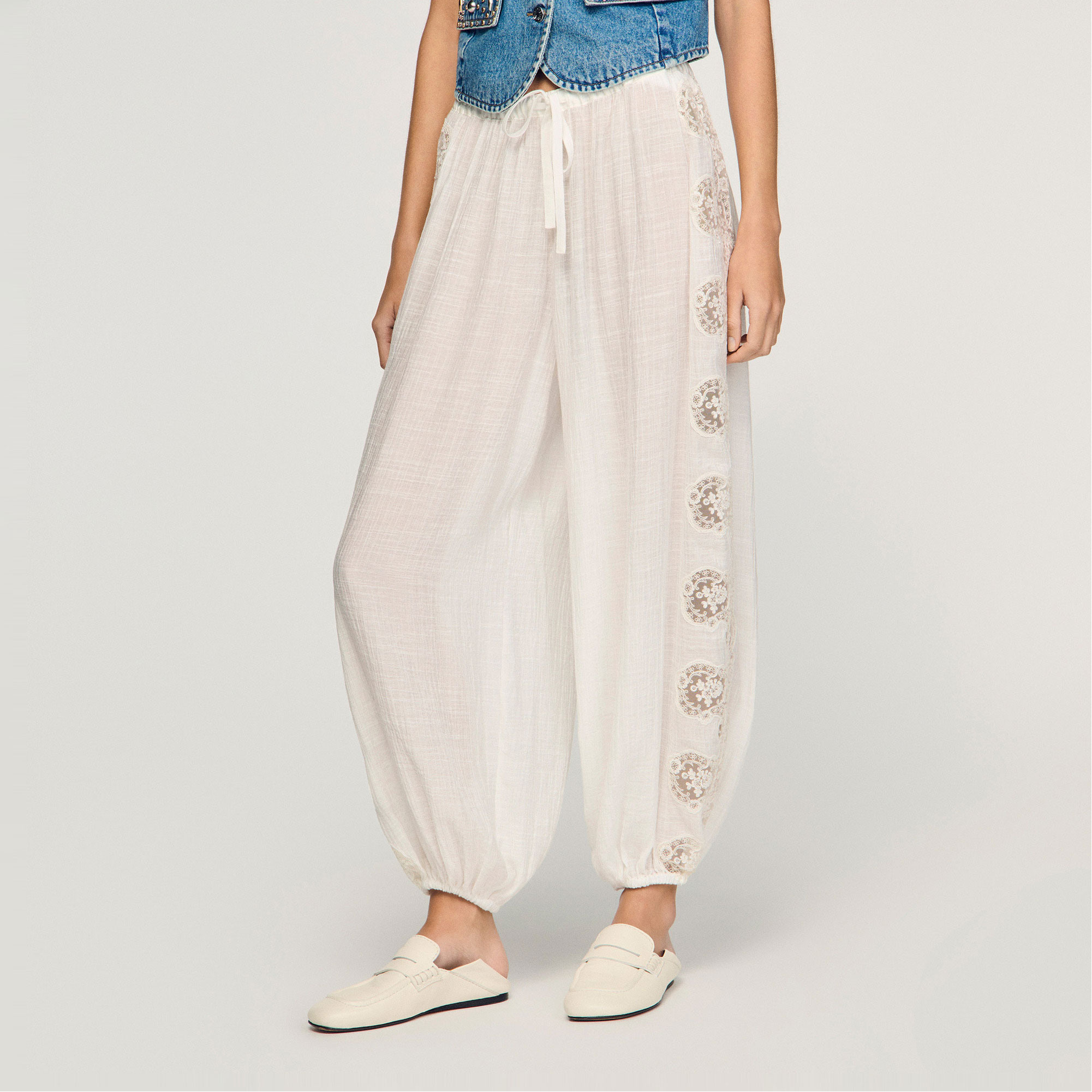 • Crepon fabric with lace inserts, wide-cut fit, all-over lace, elasticated waist with drawstring and tie fastening, elasticated hems