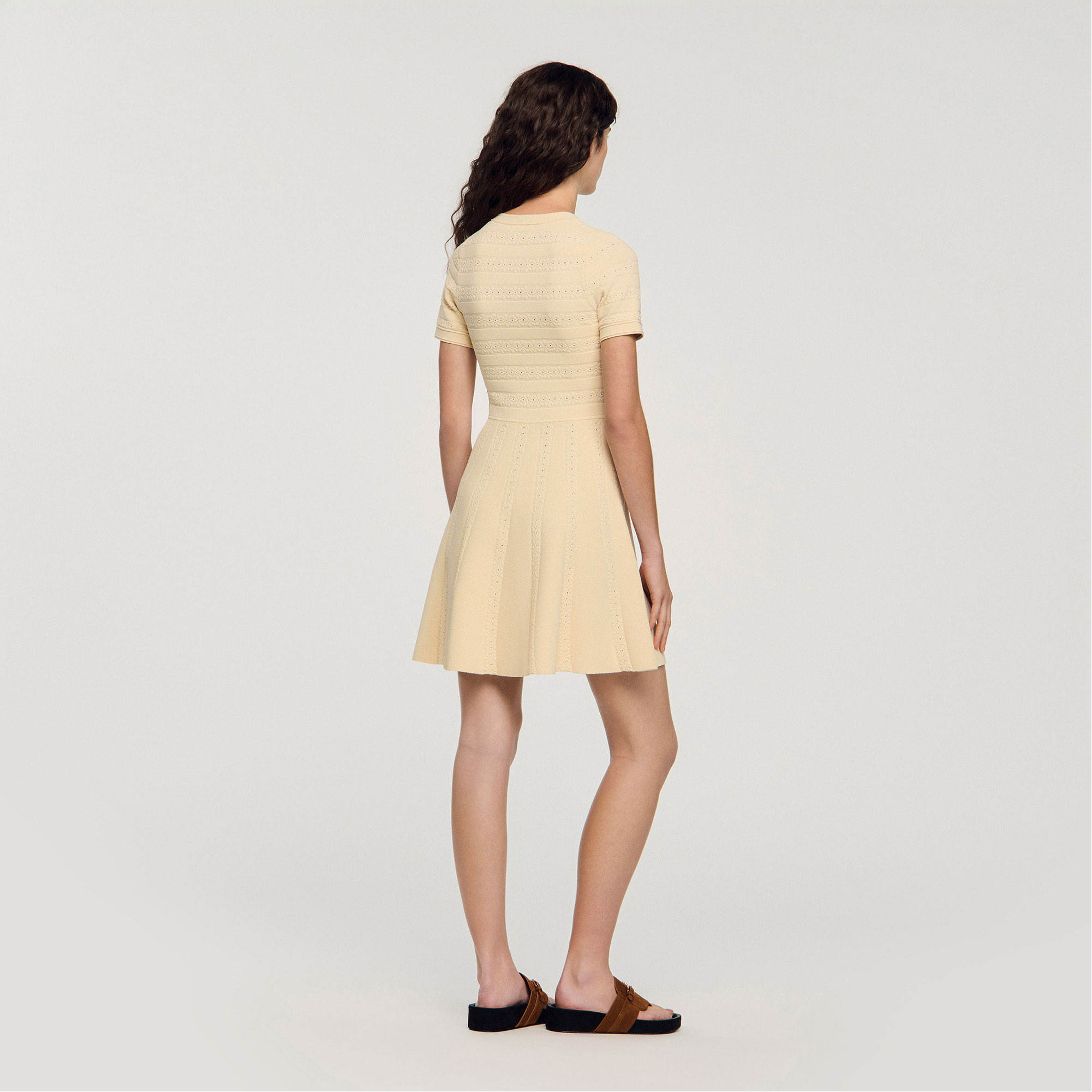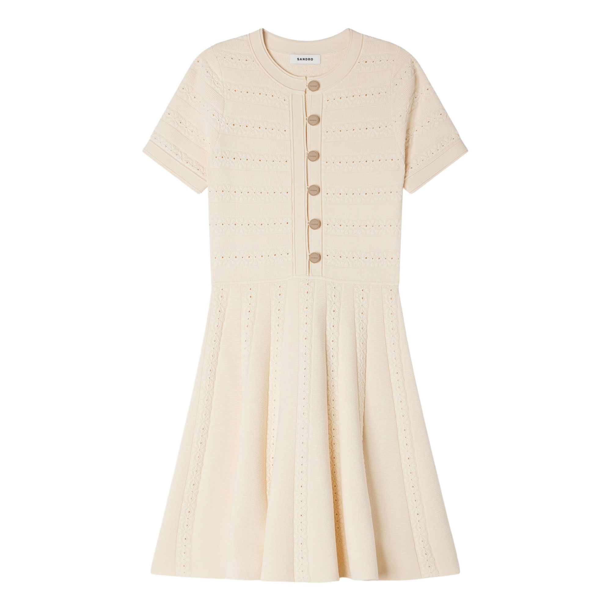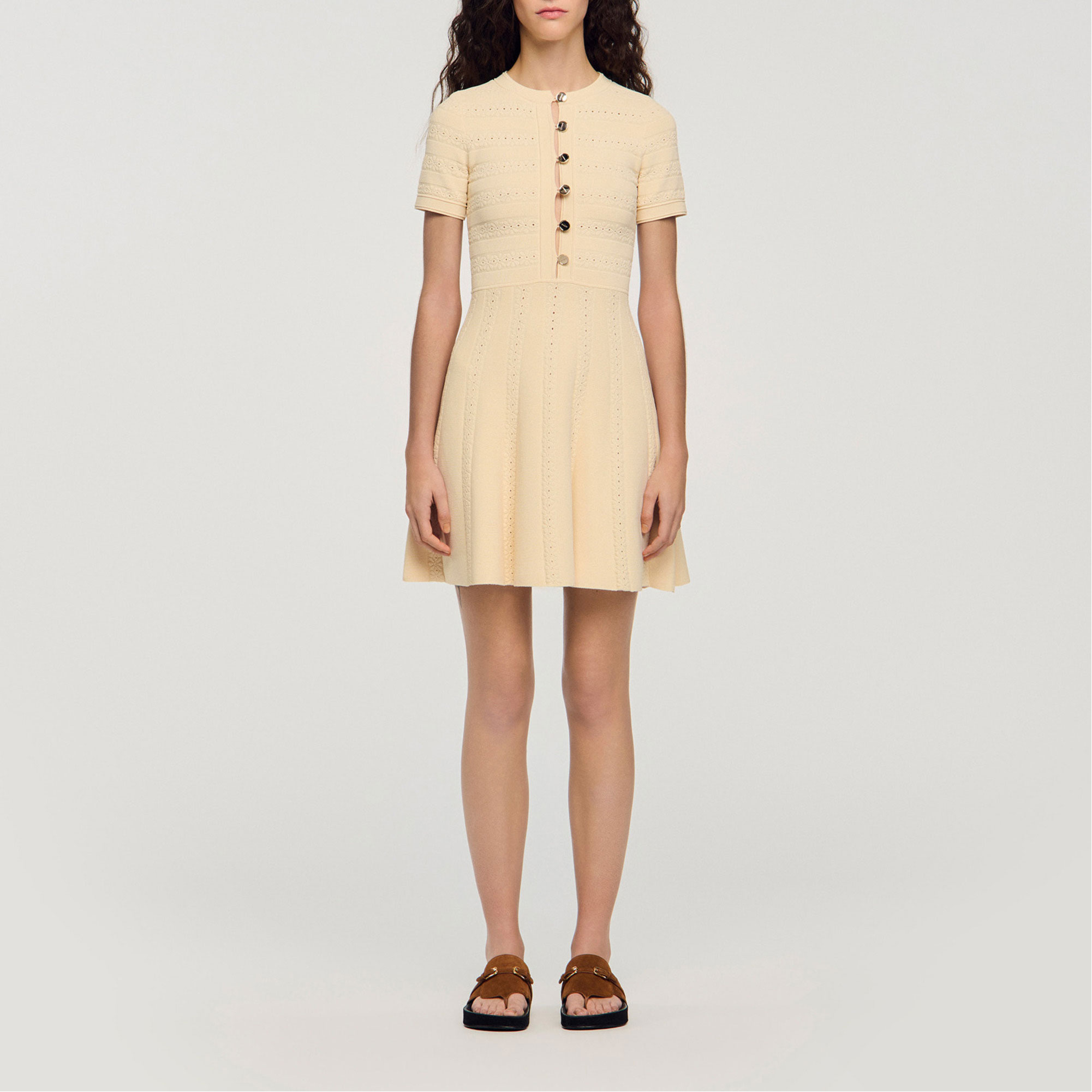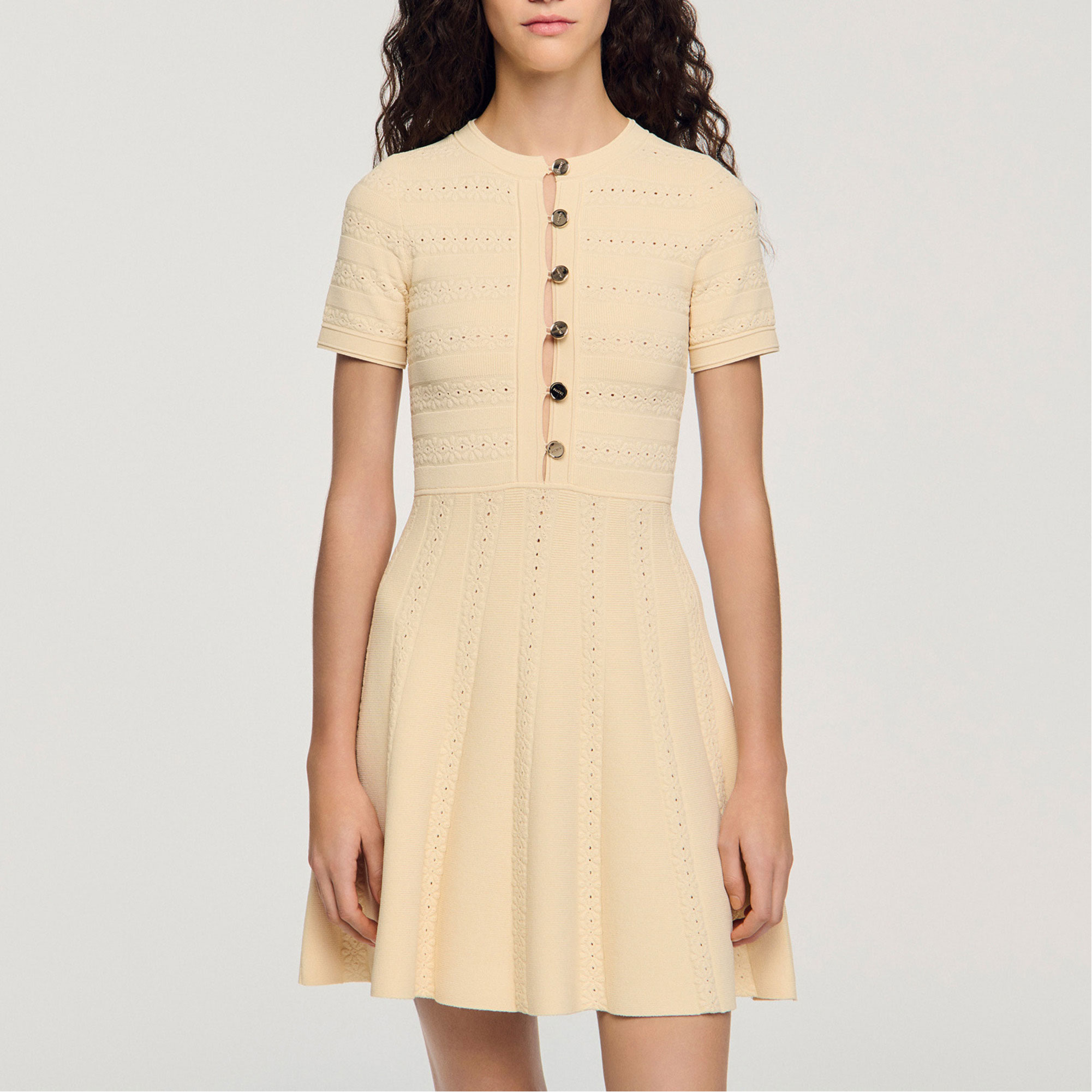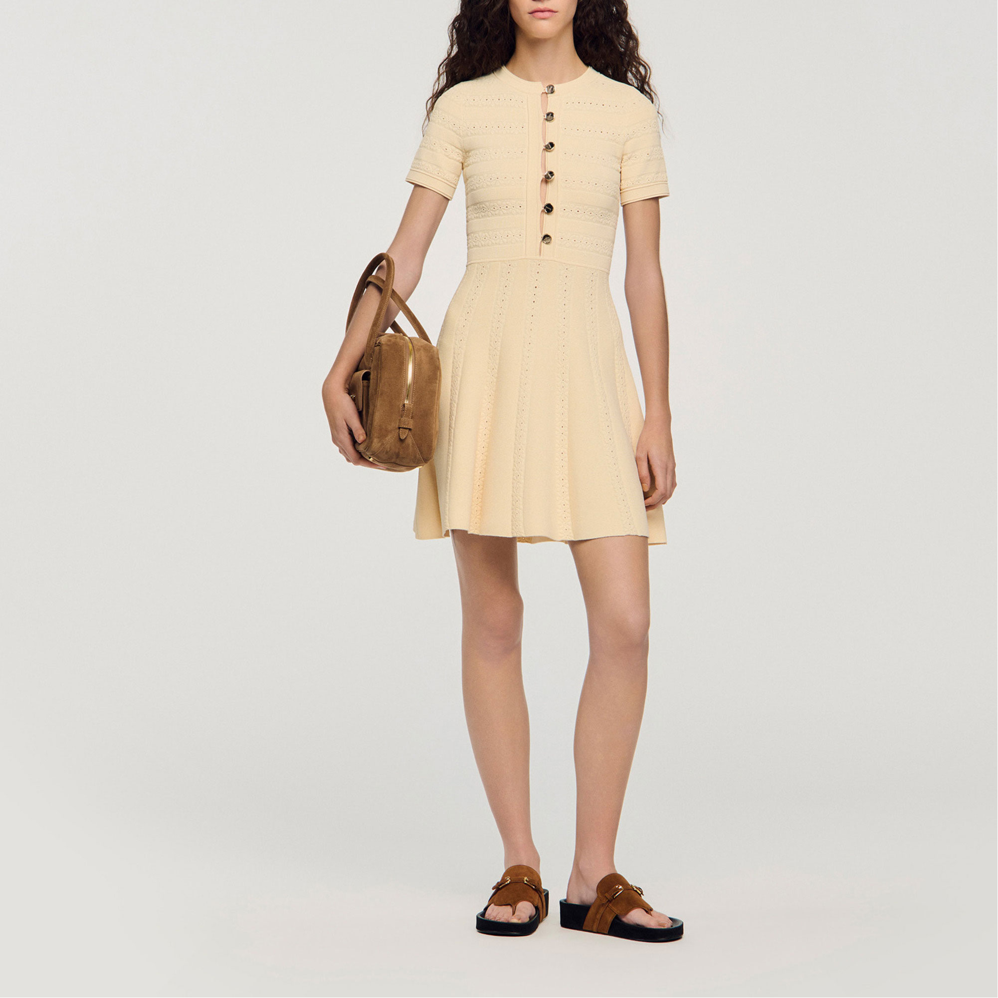 • Mini length, floral pattern, fitted at the bust and flared at the skirt, round neck, short sleeves, front button fastening