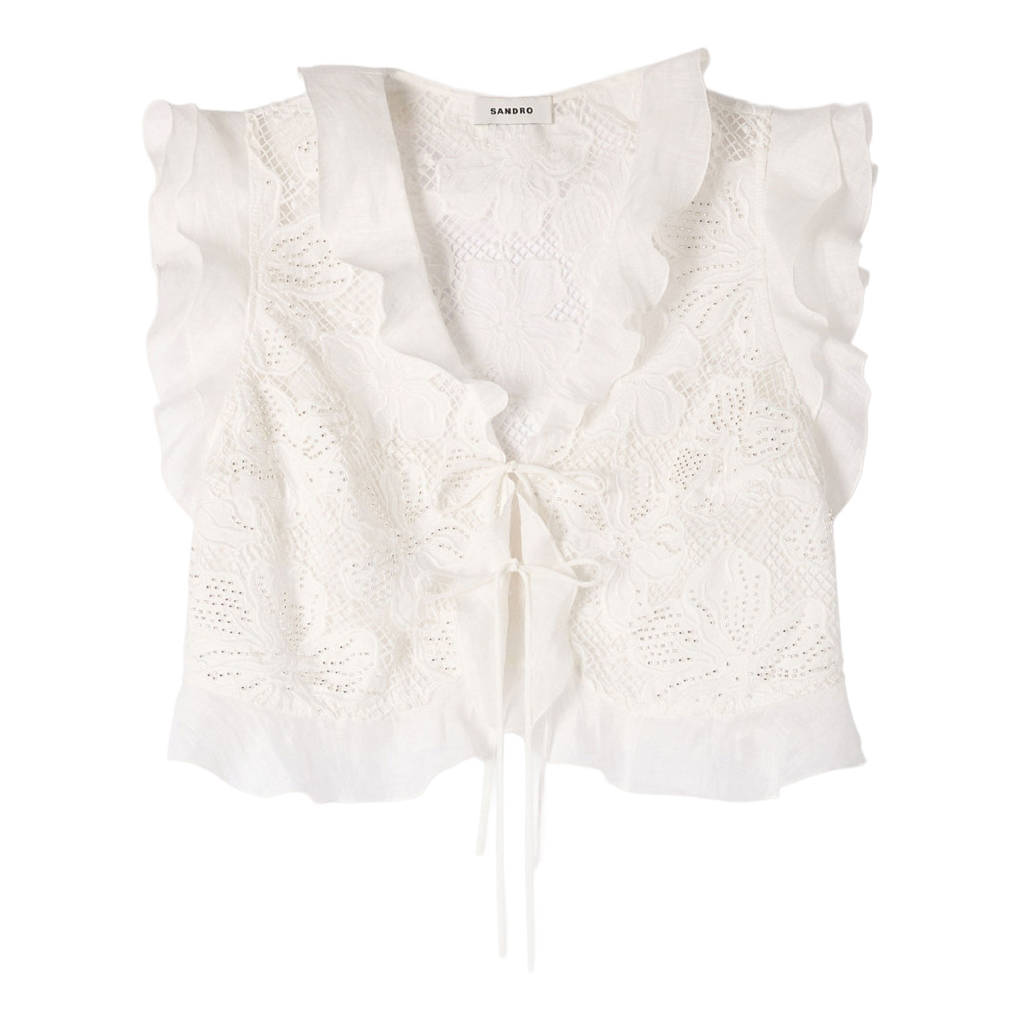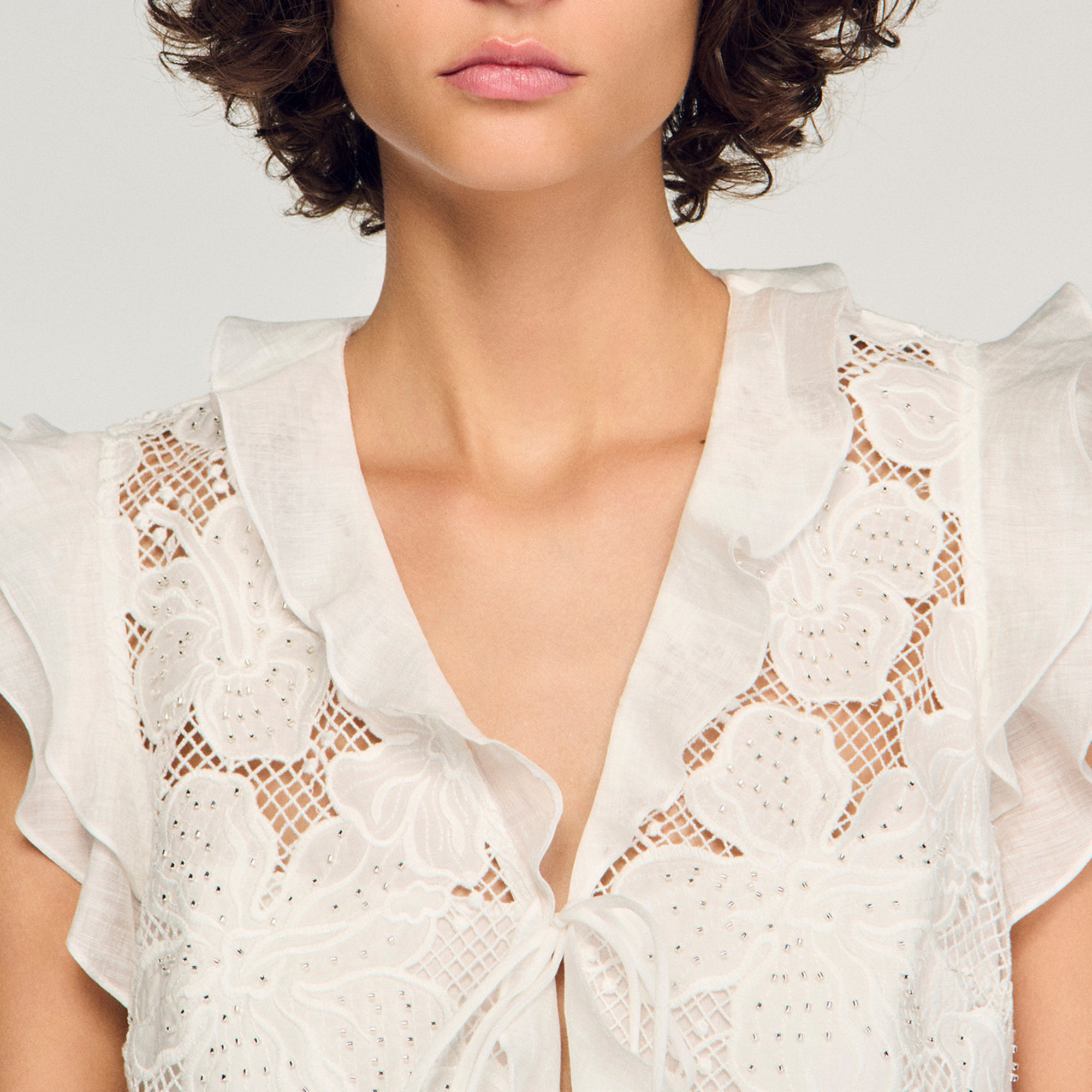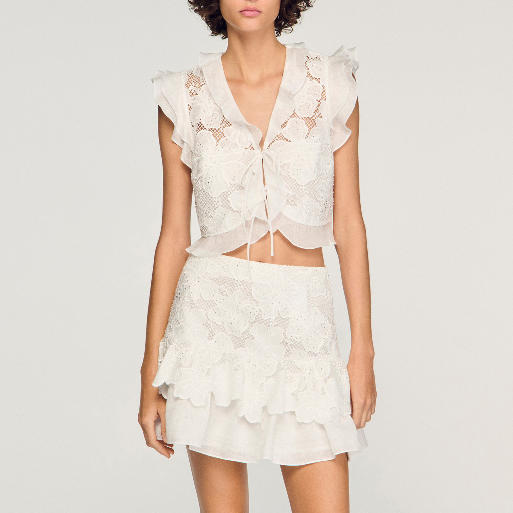 • Cropped fit, ruffled V-neckline, short ruffled sleeves, tie fastening on the front, ruffle at the hem, floral guipure lace details