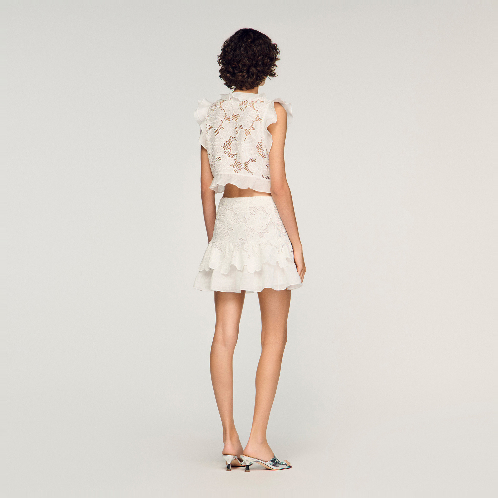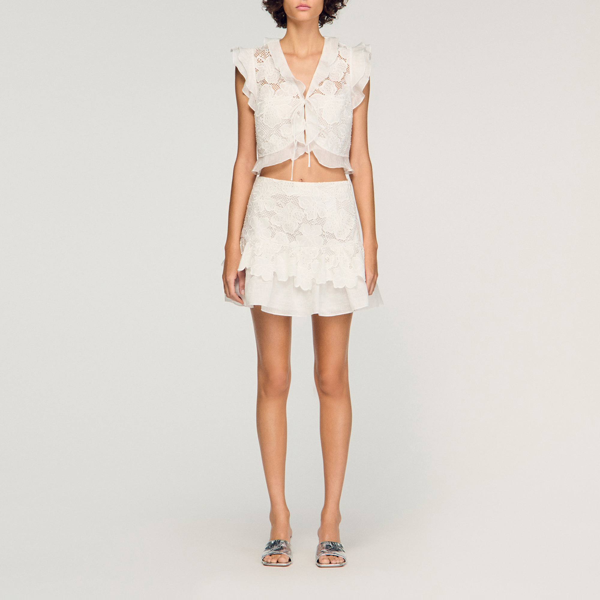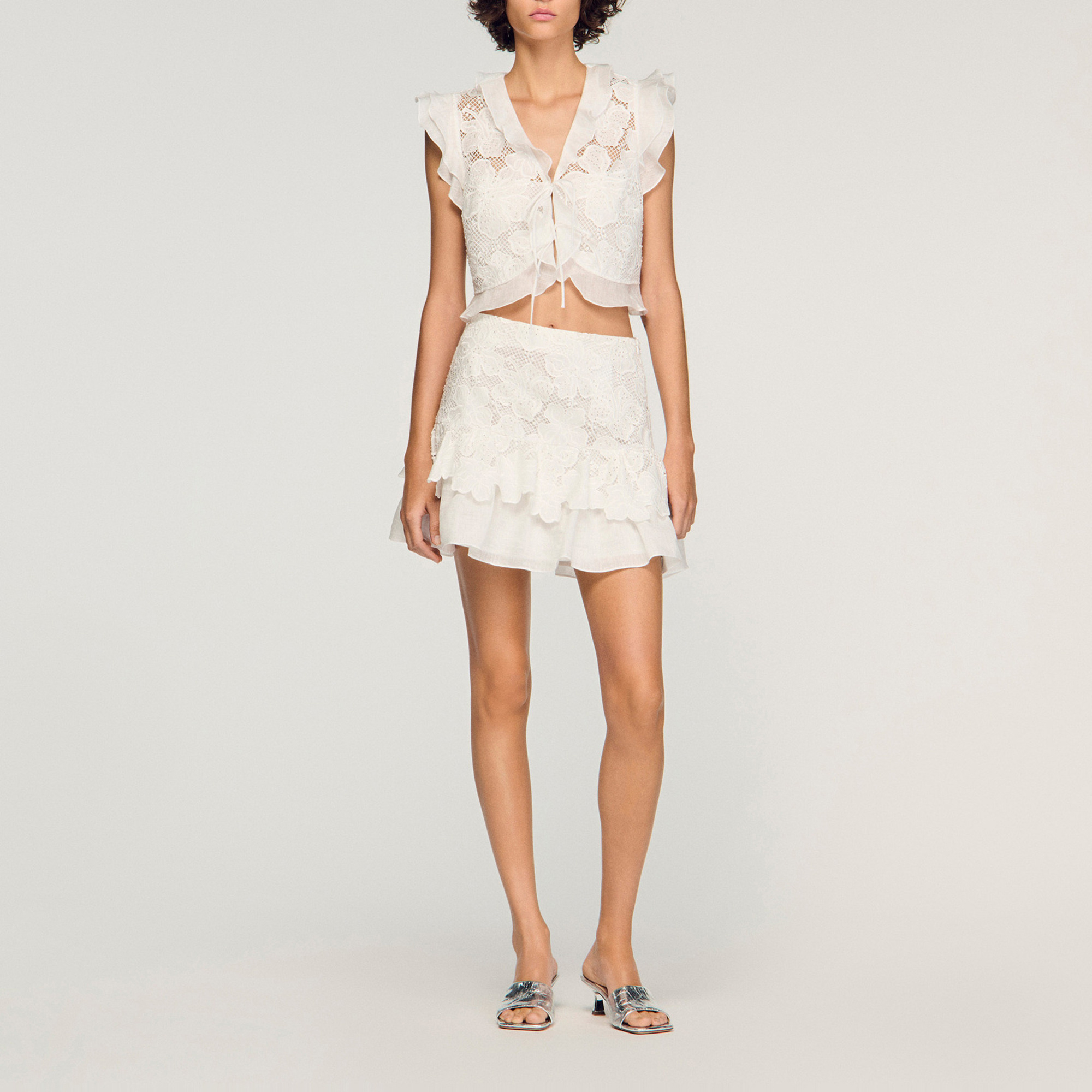 • Cropped fit, ruffled V-neckline, short ruffled sleeves, tie fastening on the front, ruffle at the hem, floral guipure lace details