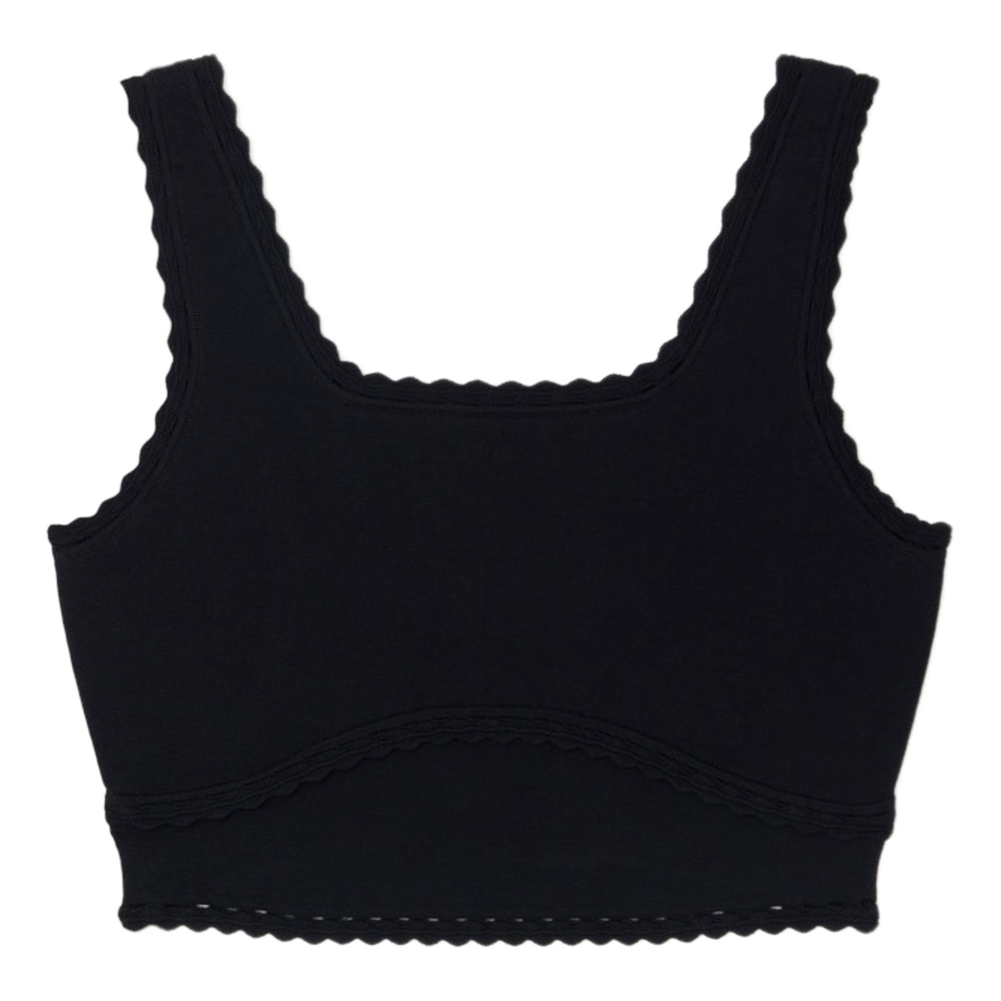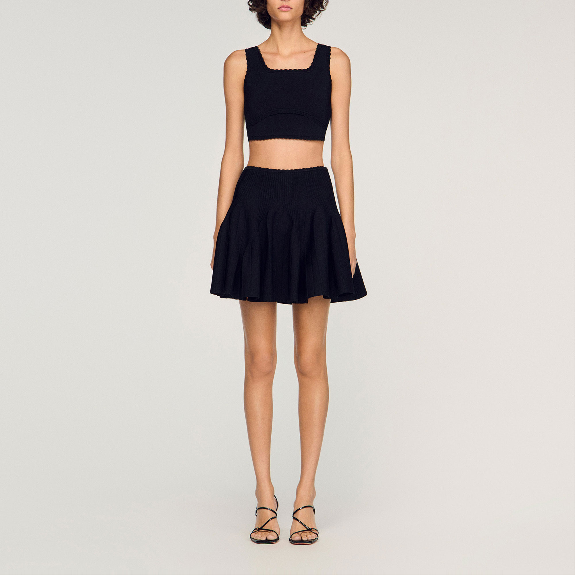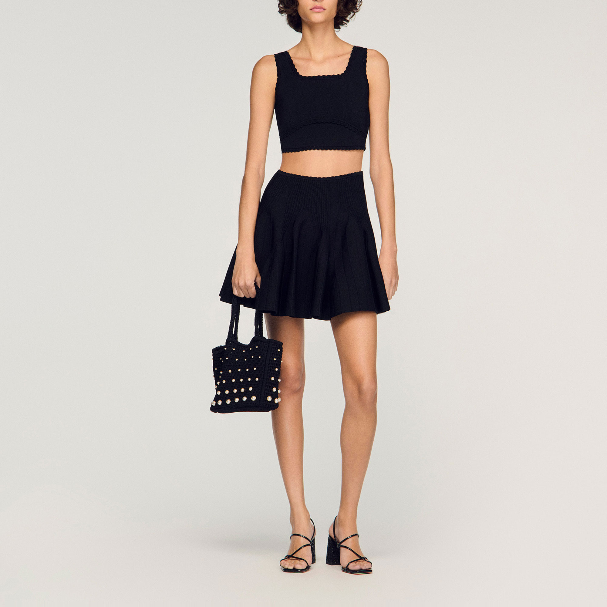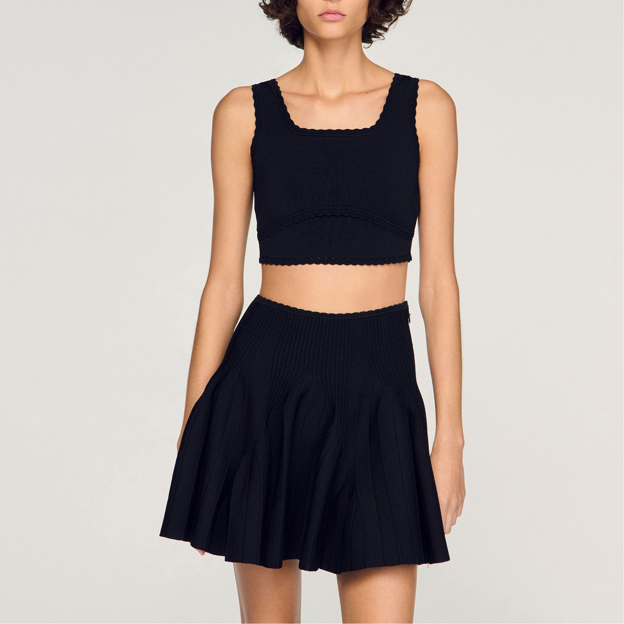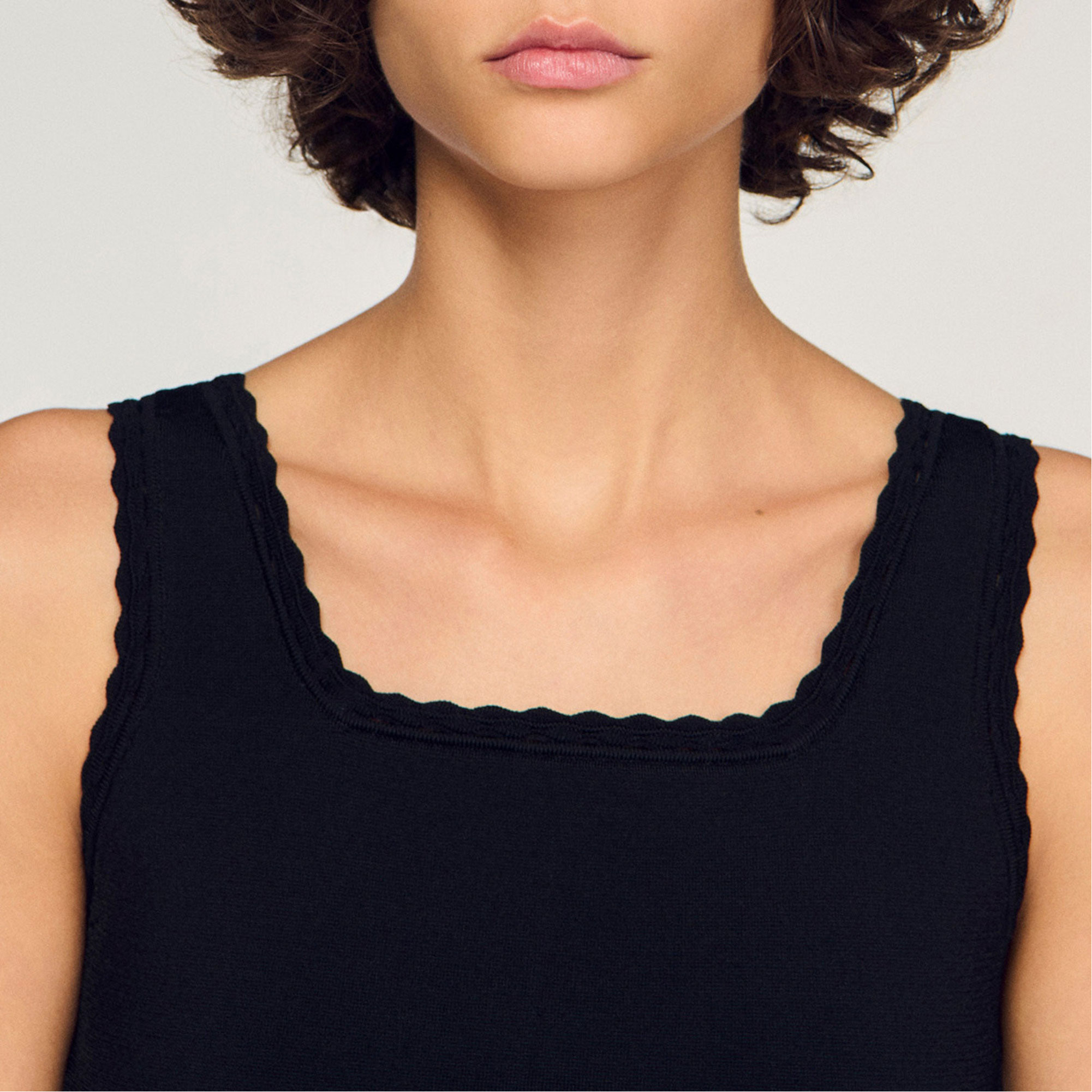 • Plain knit, cropped, fixed straps, decorative trim, collarless