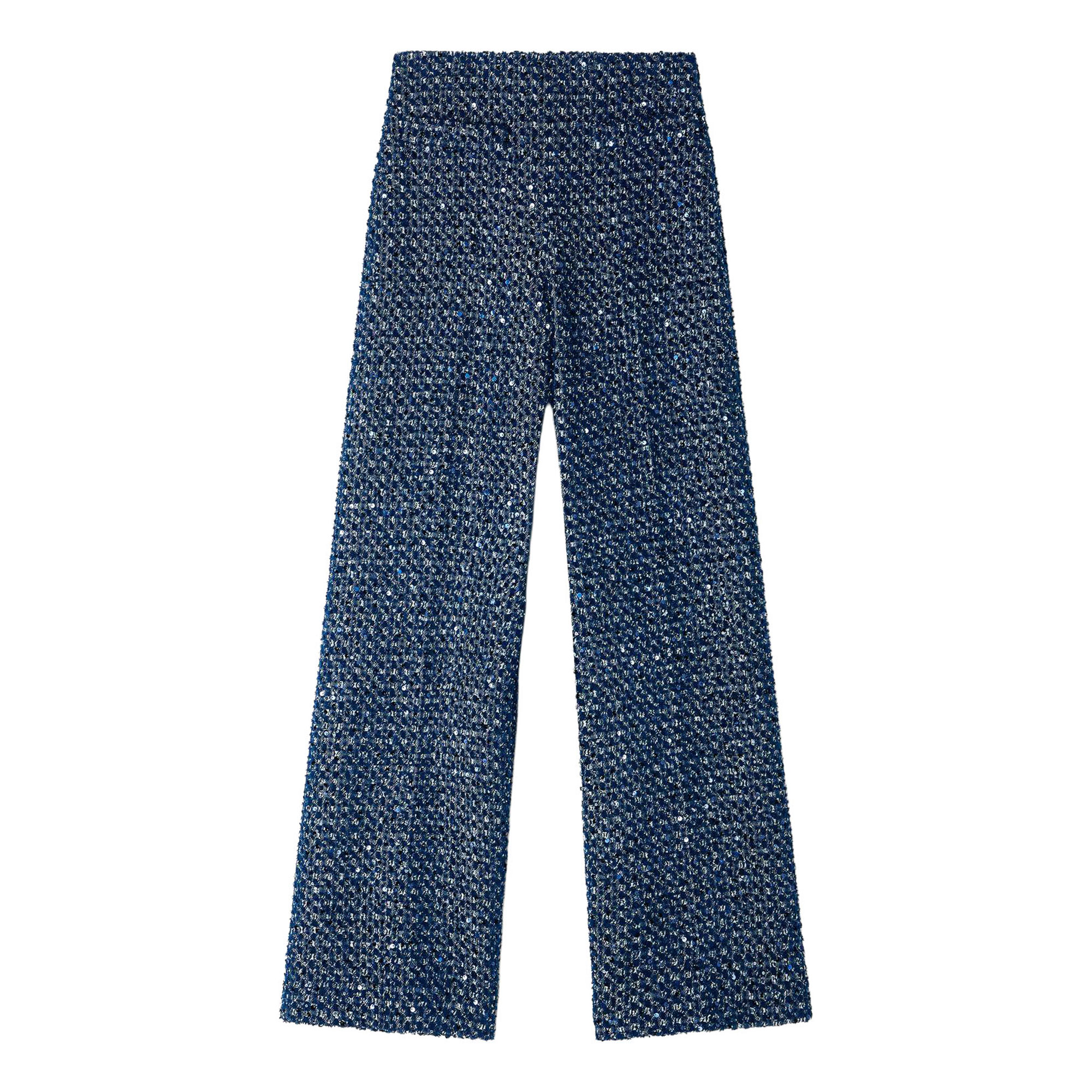 • Decorative fabric with geometric sequins, wide fit, high waist, faux piped pockets on the front, ironed creases down the middle of the leg, side zip fastening