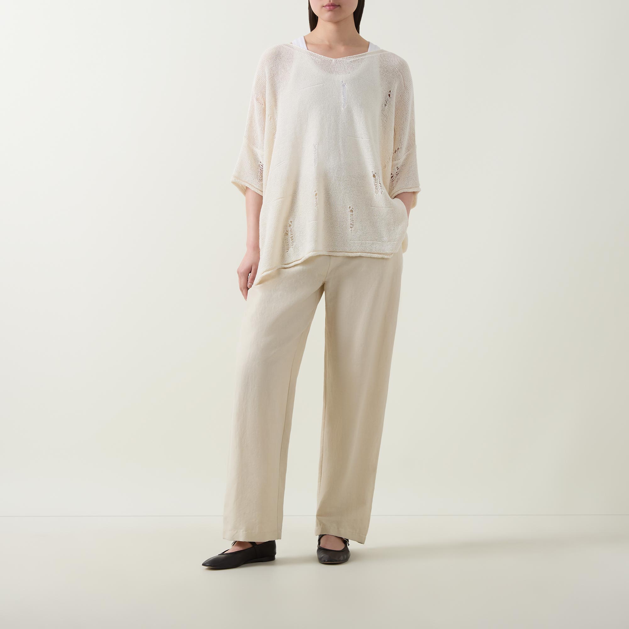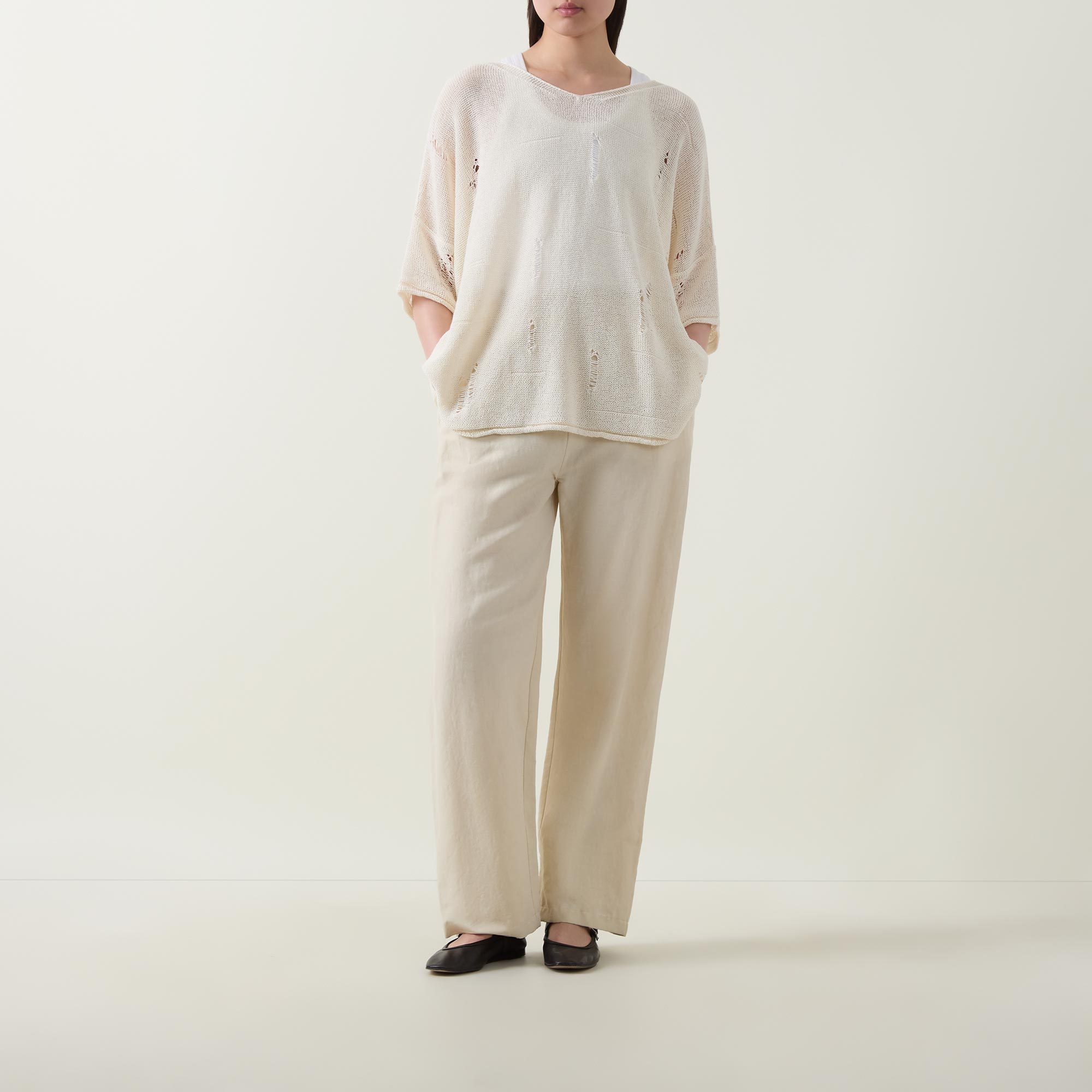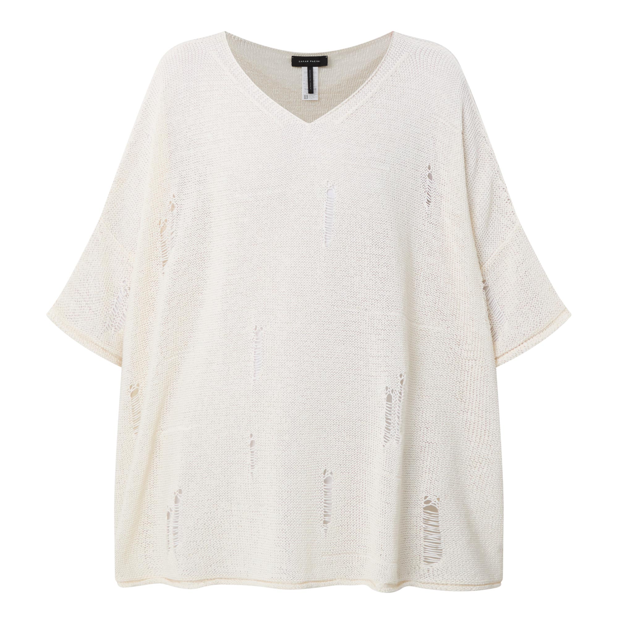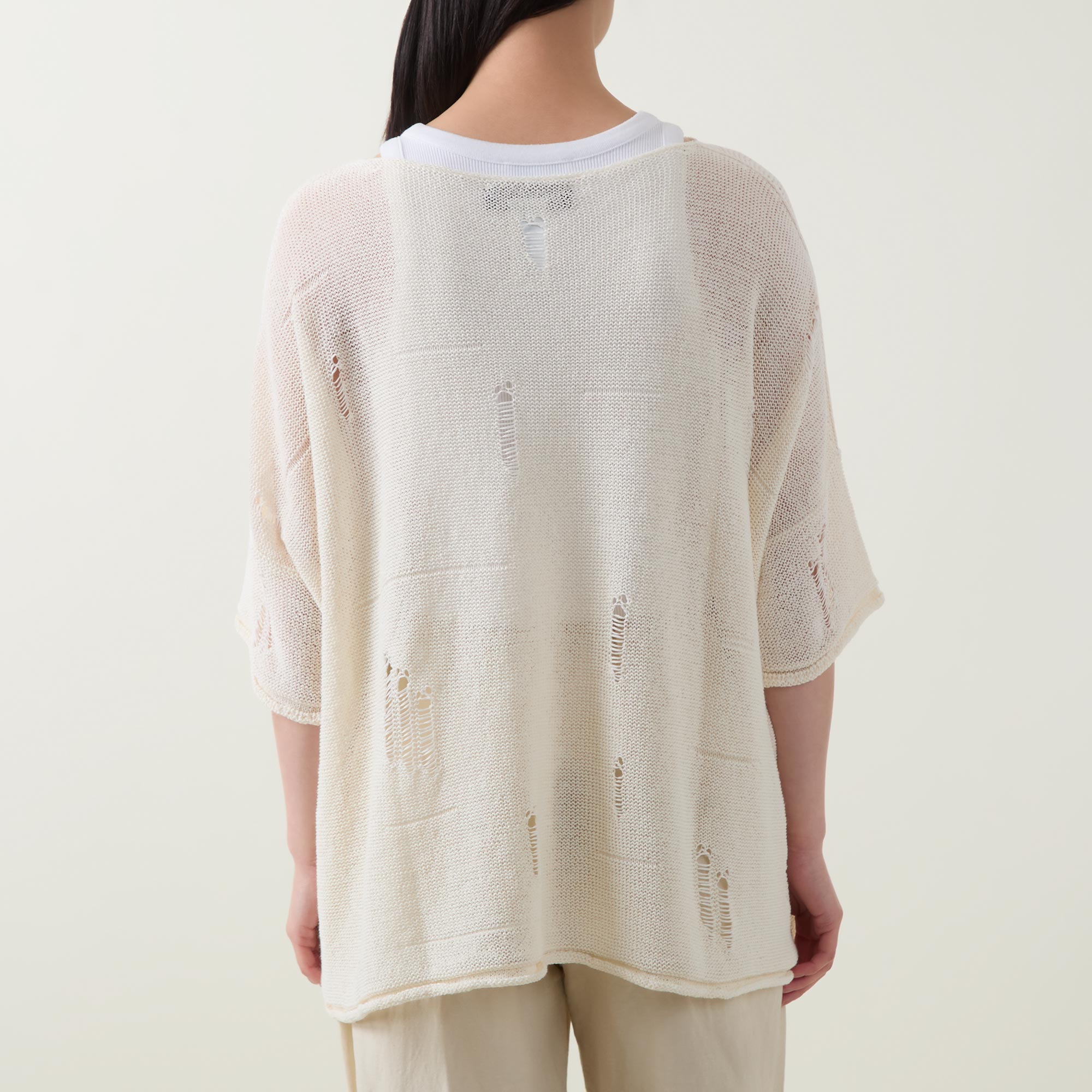 - V-neckline, dropped shoulders, elbow-length sleeves, rolled trims, fine knit structure, distressed details, unlined, sheer coverage