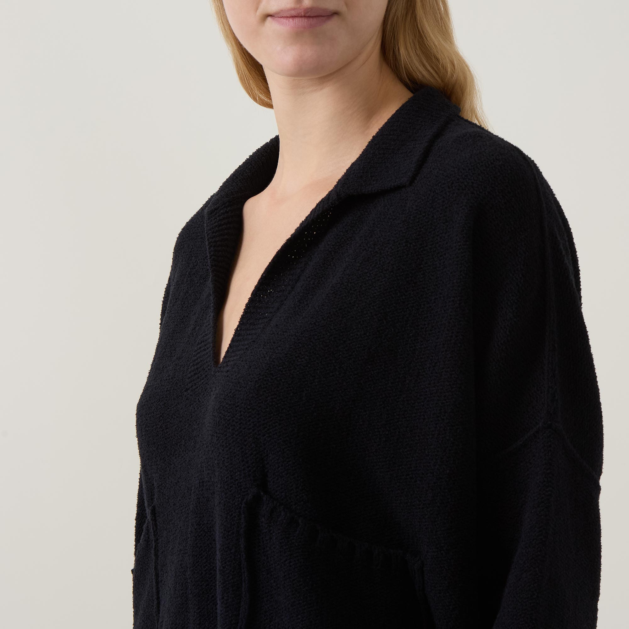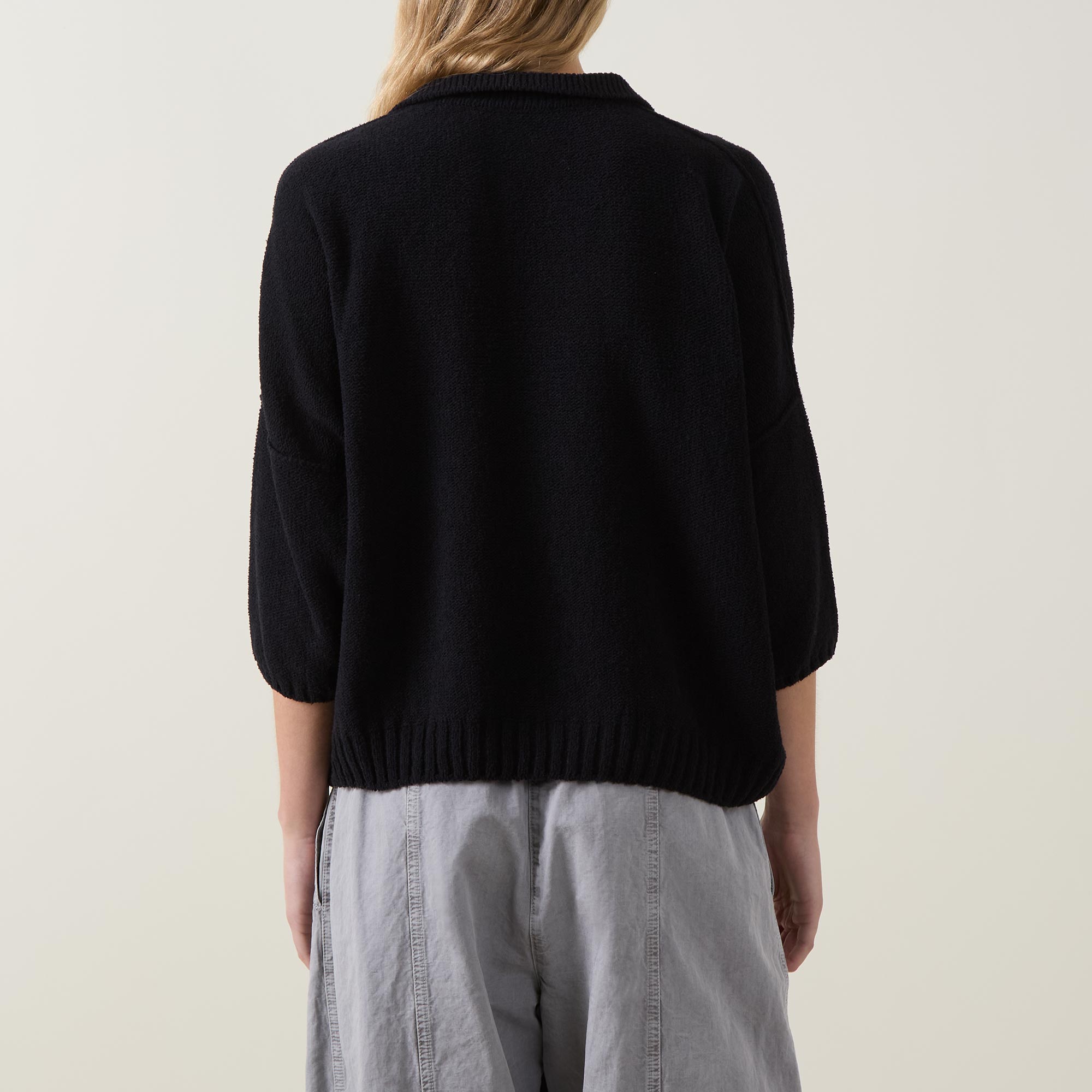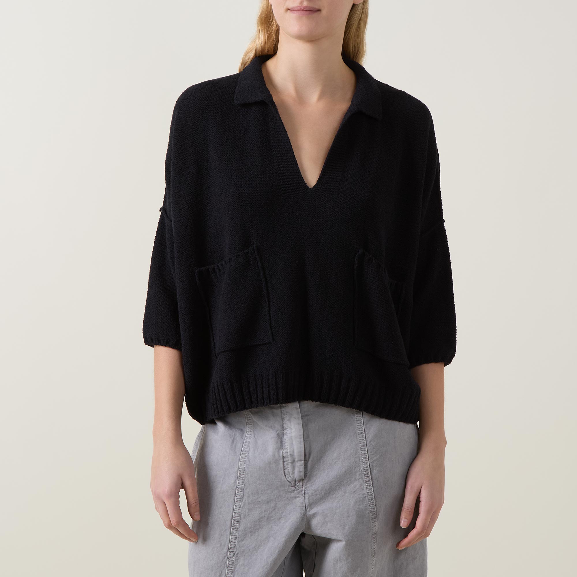 - Flat collar, open neckline, three-quarter-length sleeves, dropped shoulders, fine knit structure, patch pockets