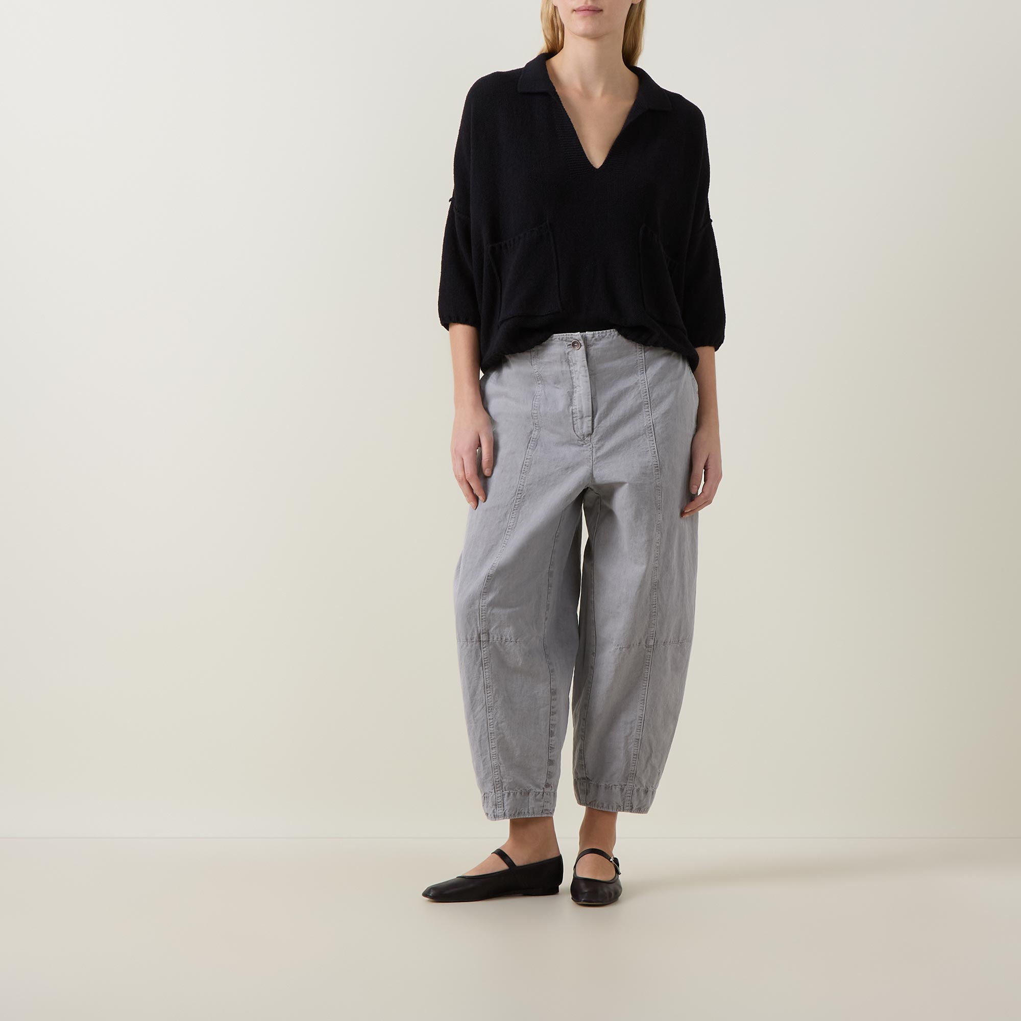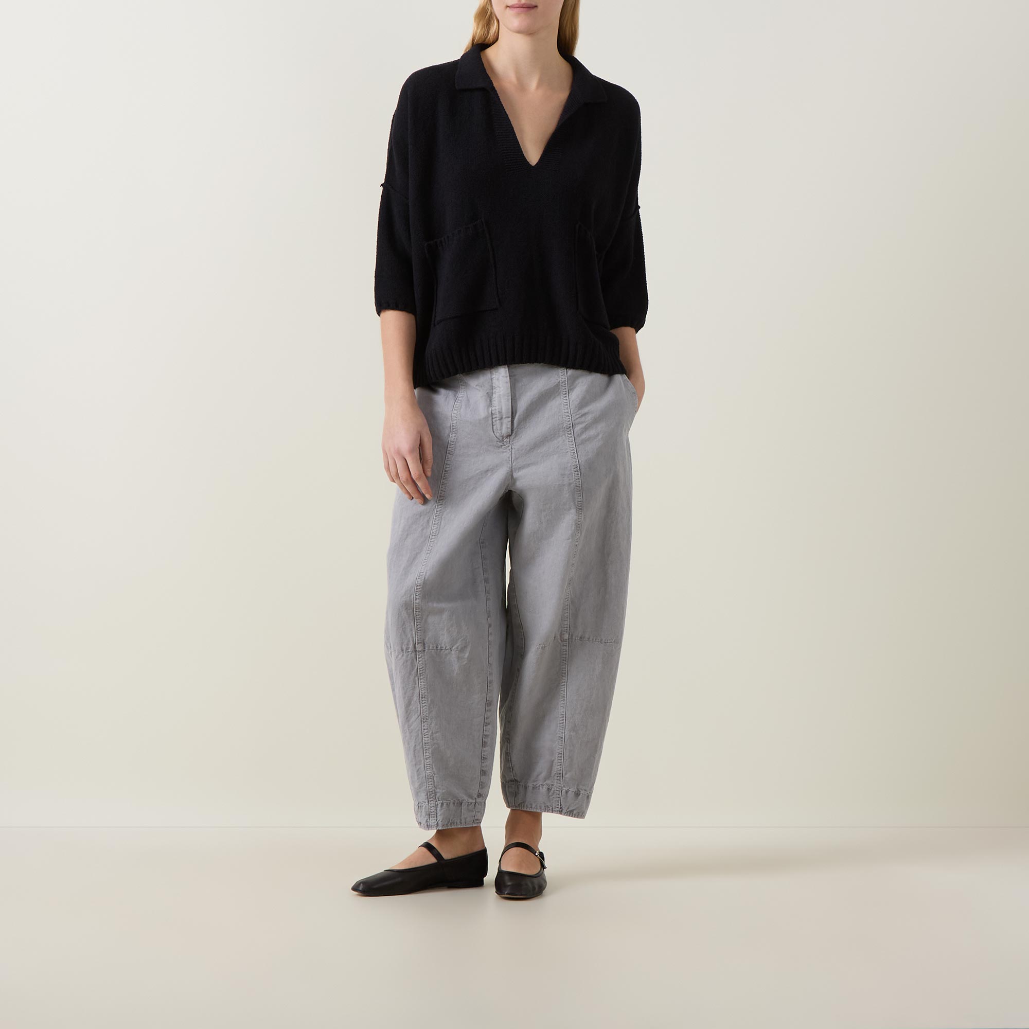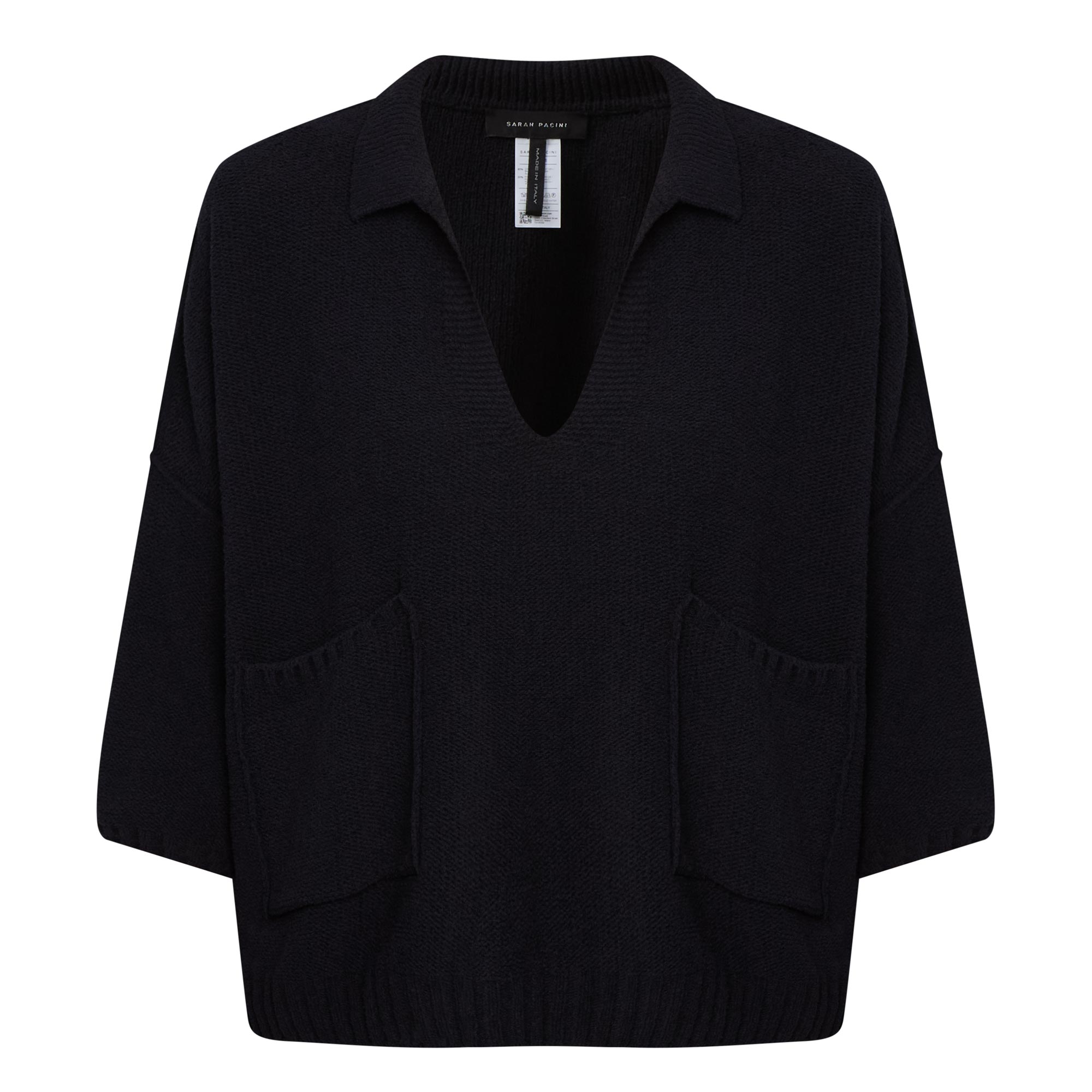 - Flat collar, open neckline, three-quarter-length sleeves, dropped shoulders, fine knit structure, patch pockets