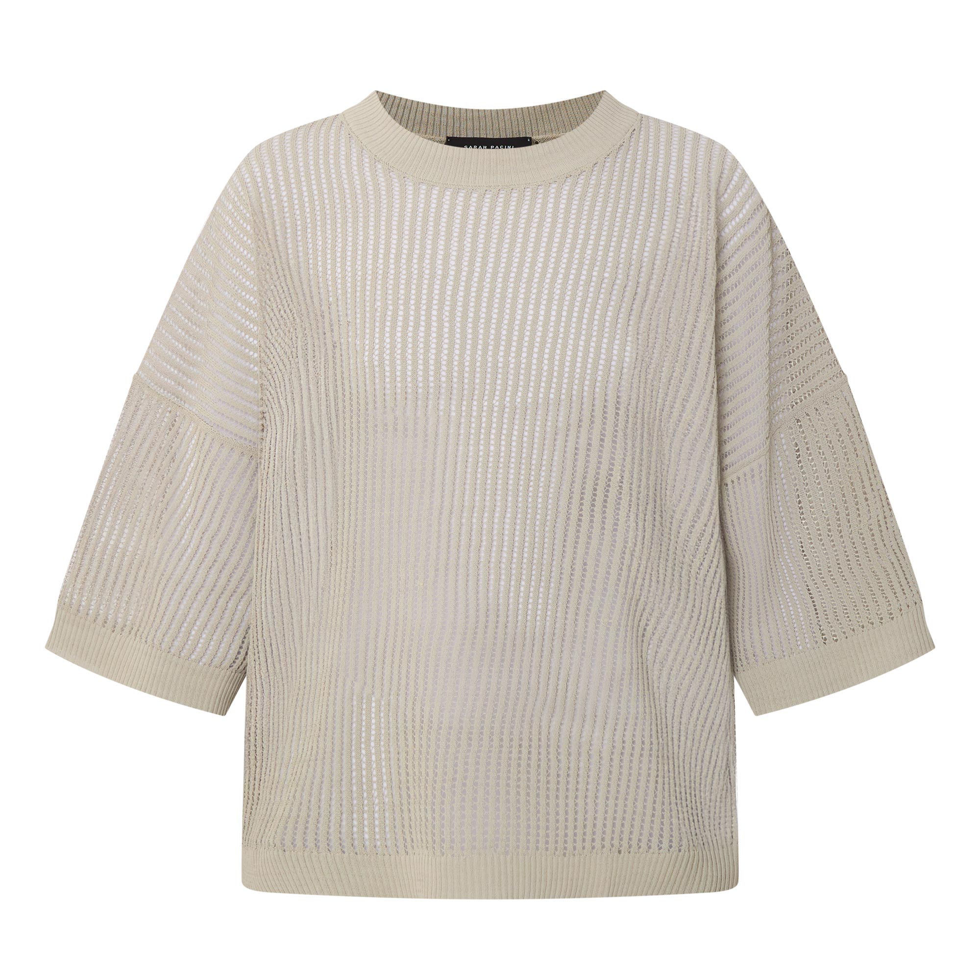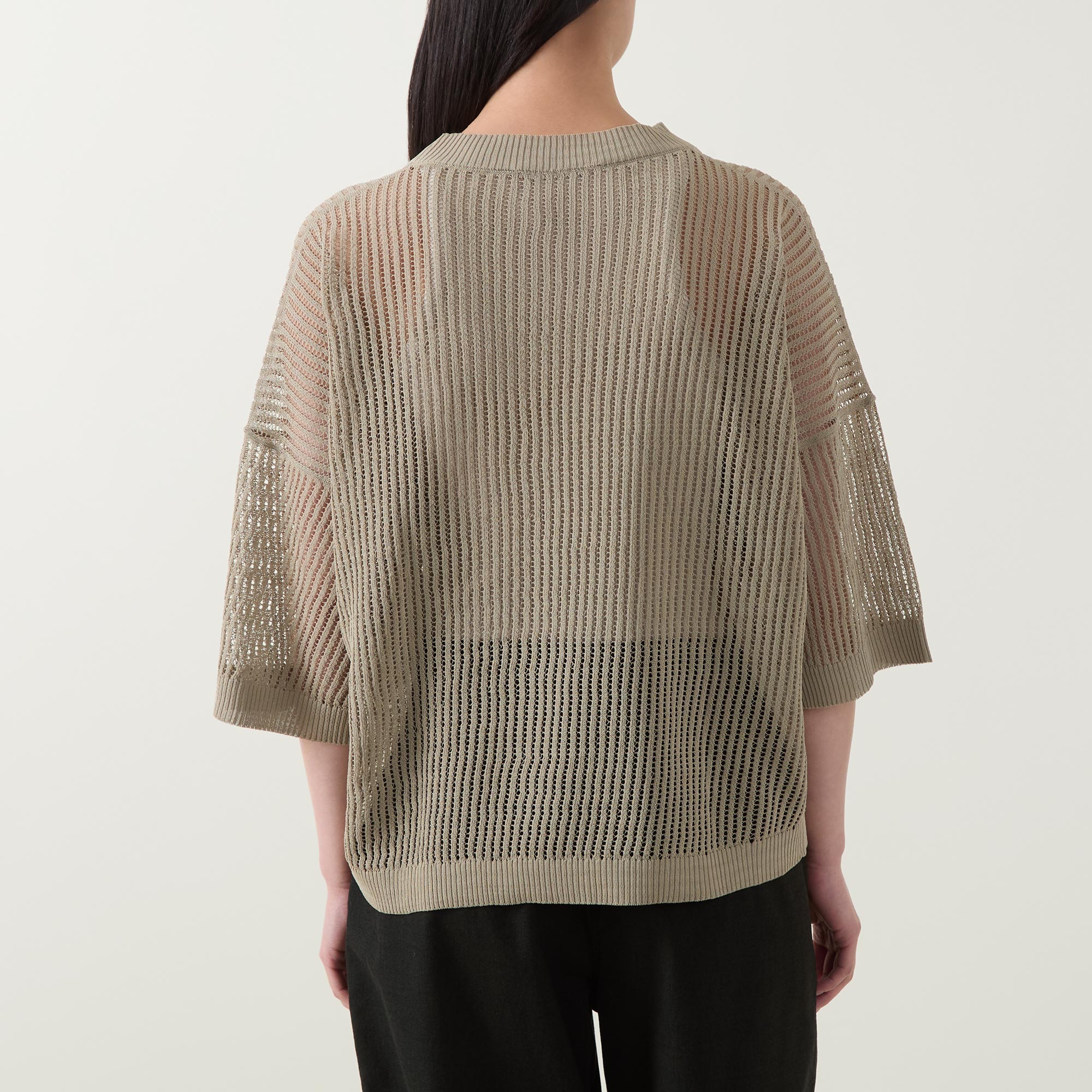 • Crew neckline, three-quarter-length sleeves, ribbed trims, sheer stripe pattern, knit structure