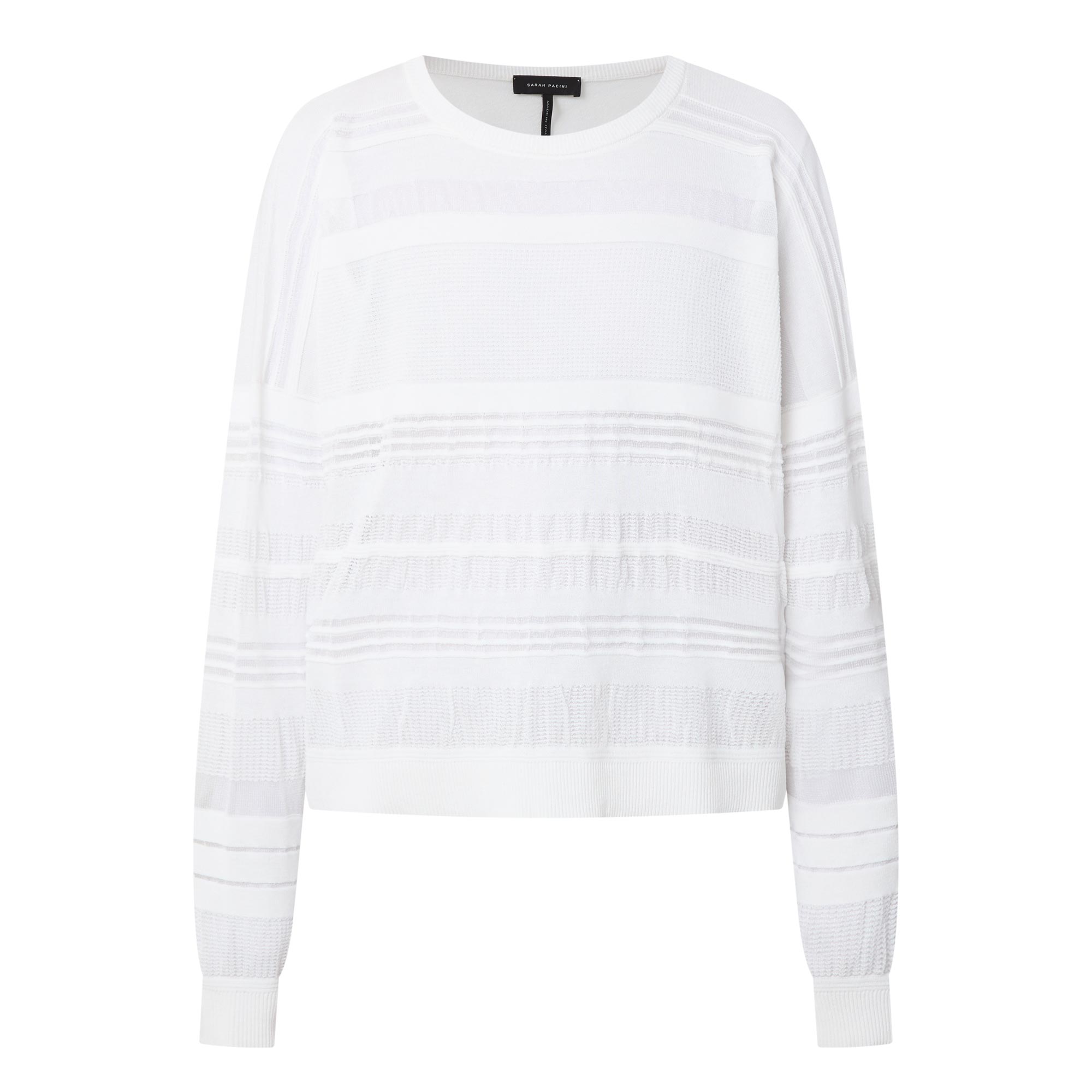 - Round neckline, fine knit back panel, sheer stripe front panel, ribbed trims, dropped shoulders, long sleeves