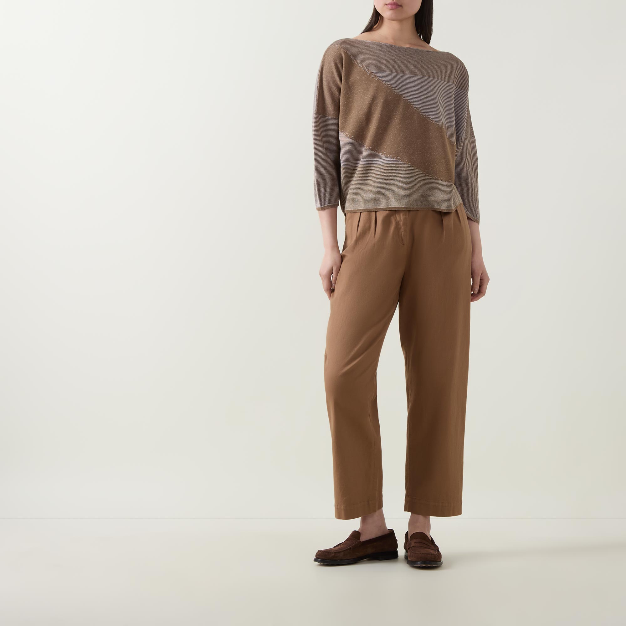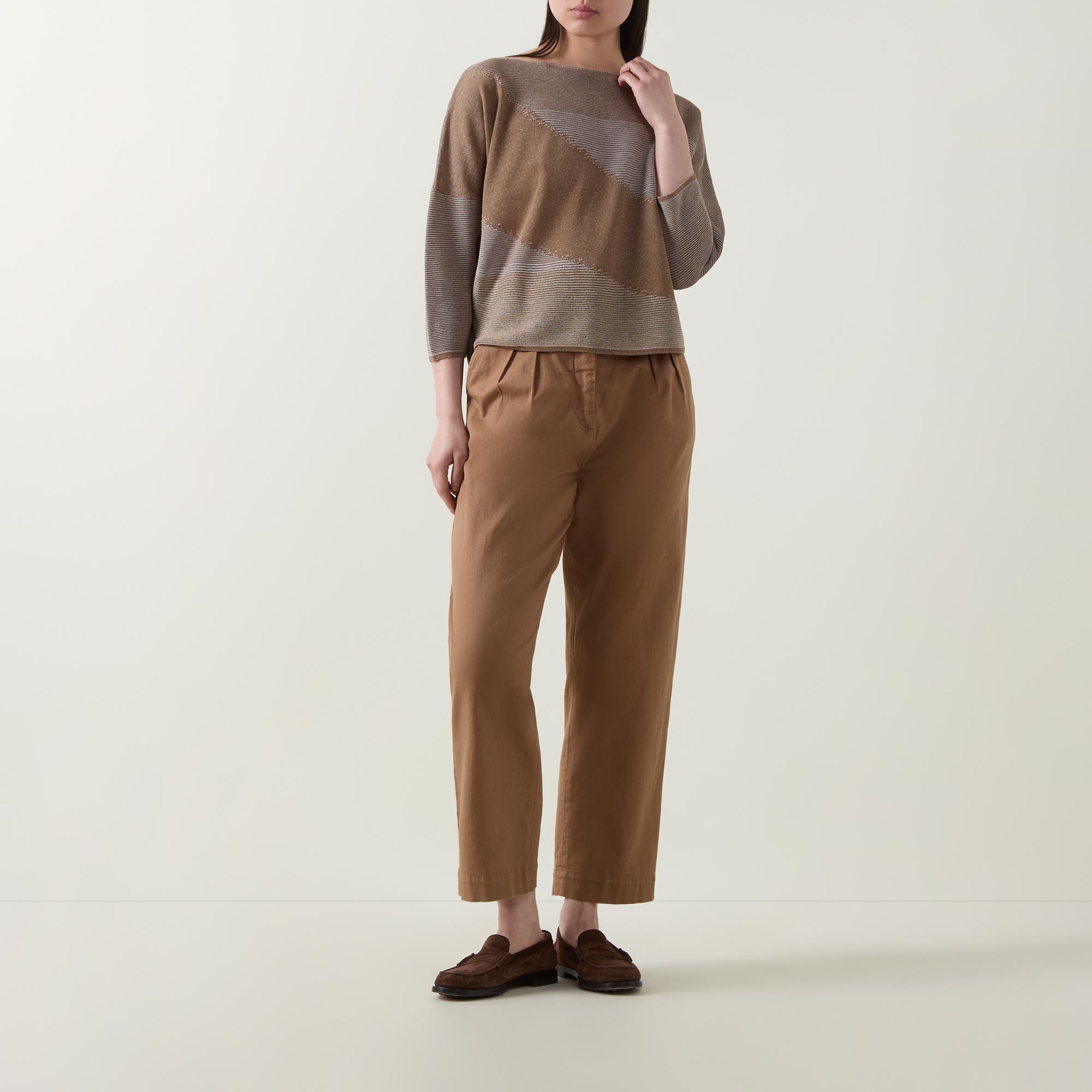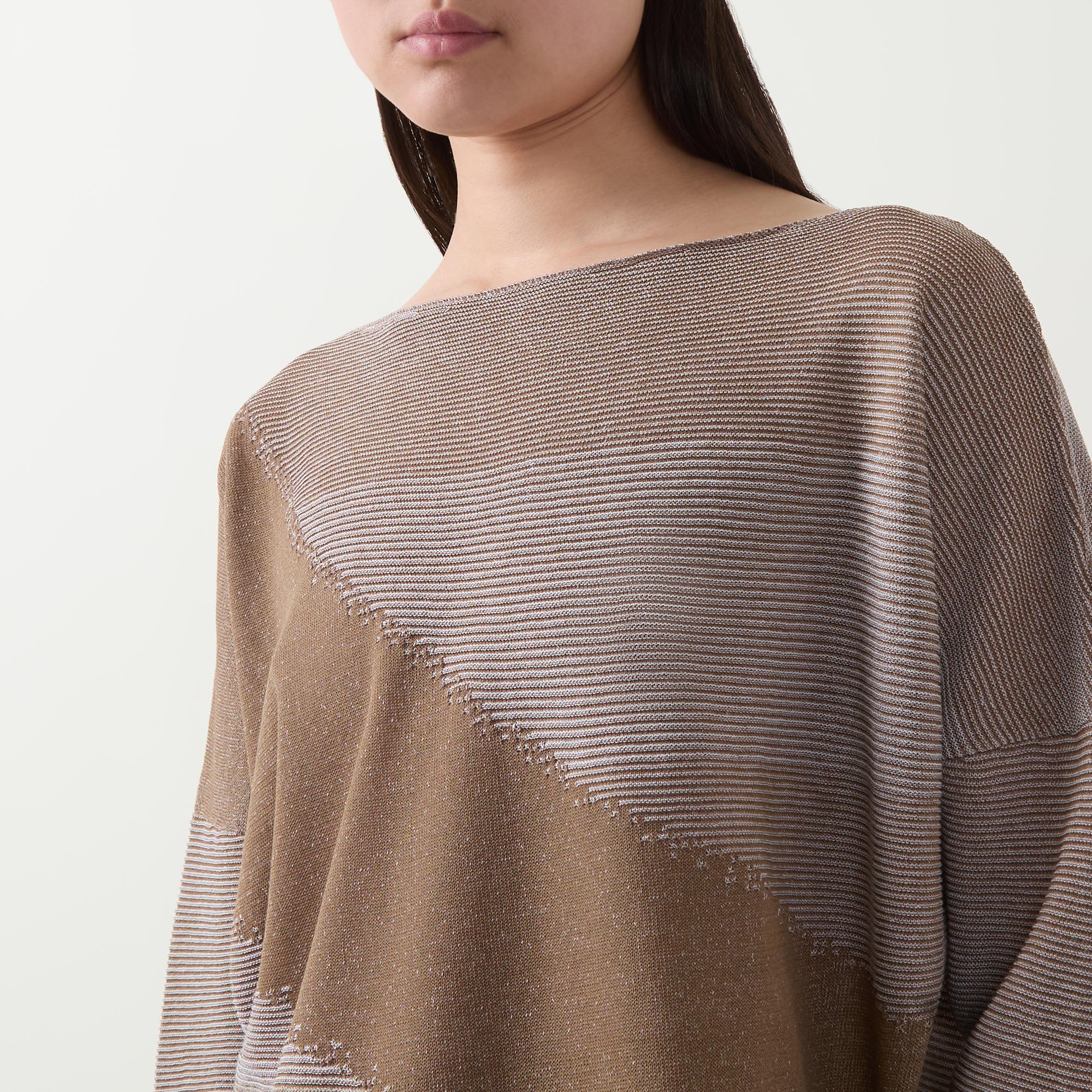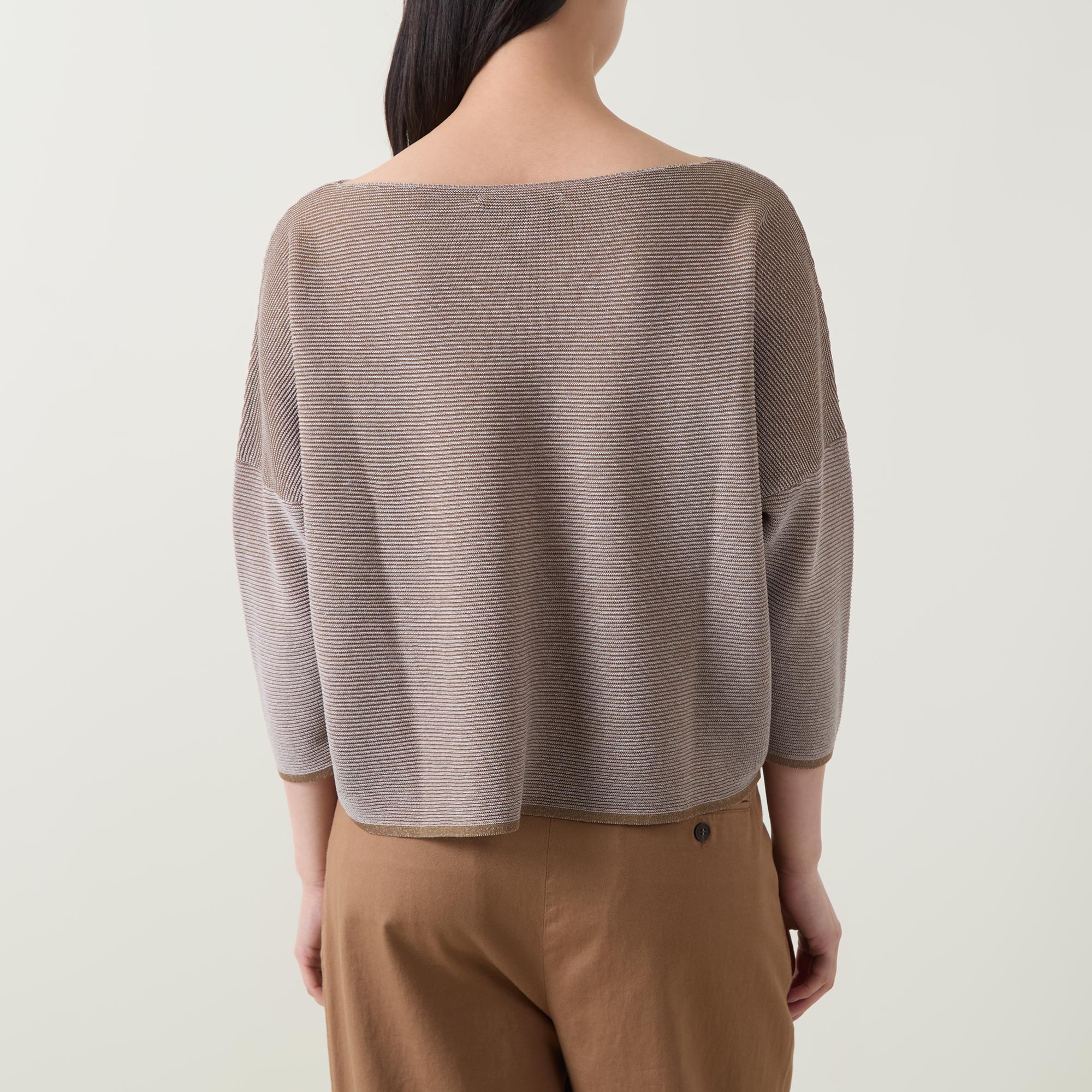 - Boat neckline, three-quarter-length sleeves, straight hemline, ribbed trims, fine knit structure, asymmetric stripe pattern