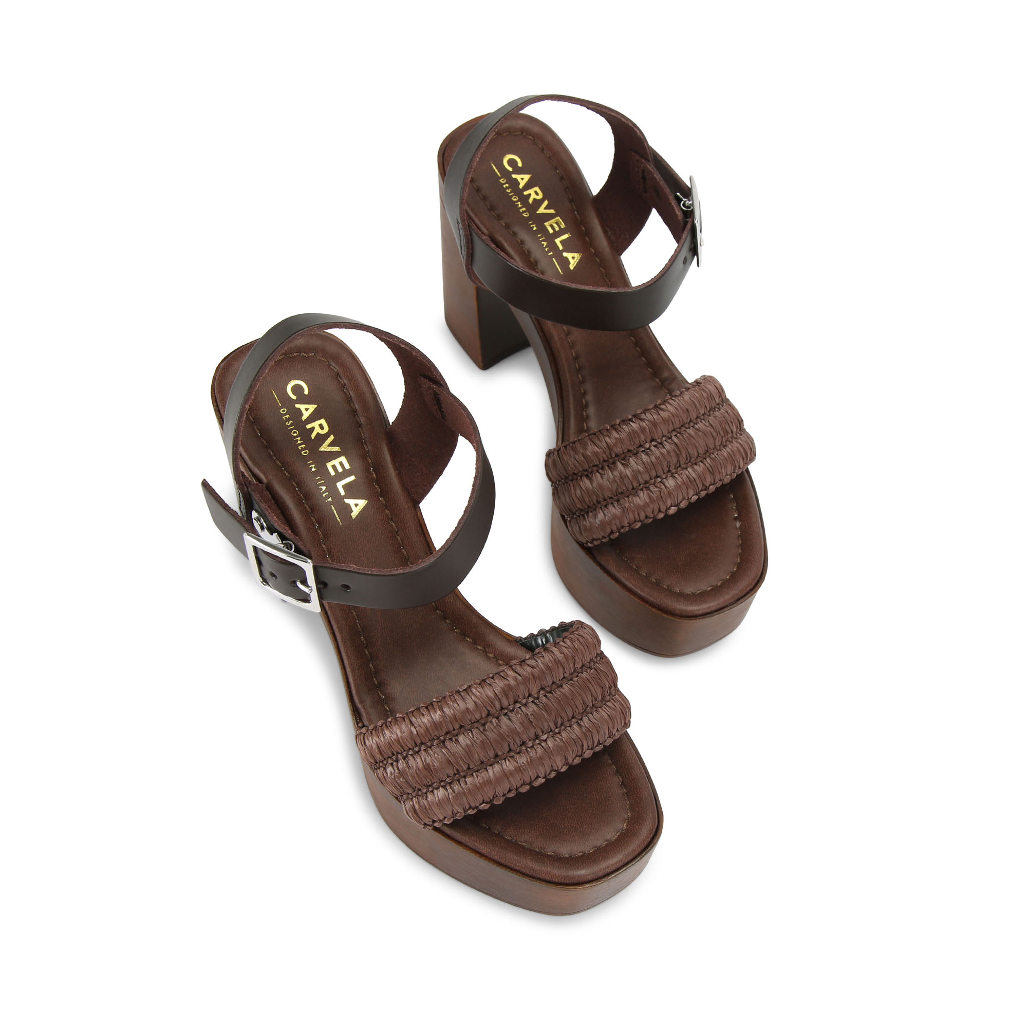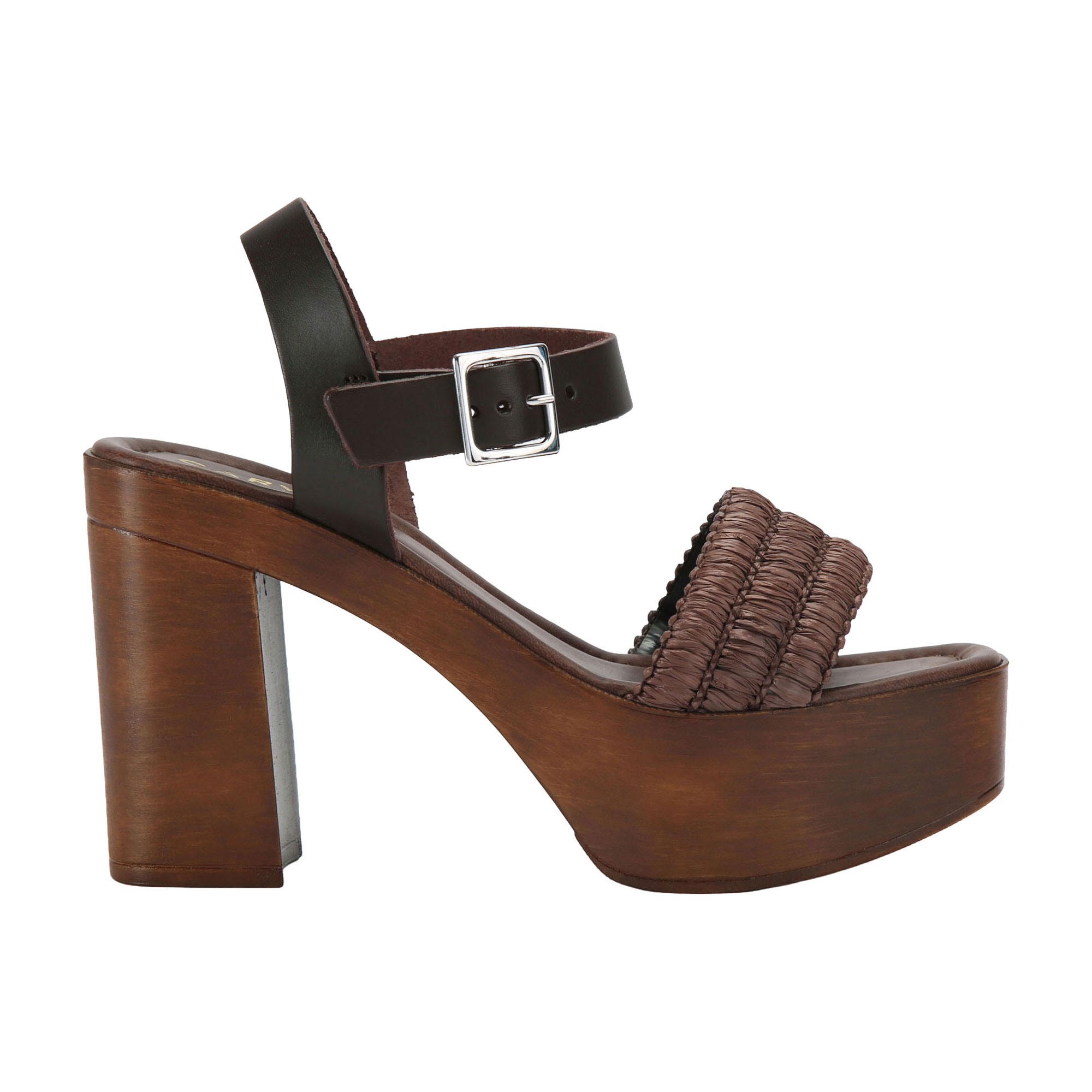 - Block heel, leather upper, ankle strap, raffia-style toe strap