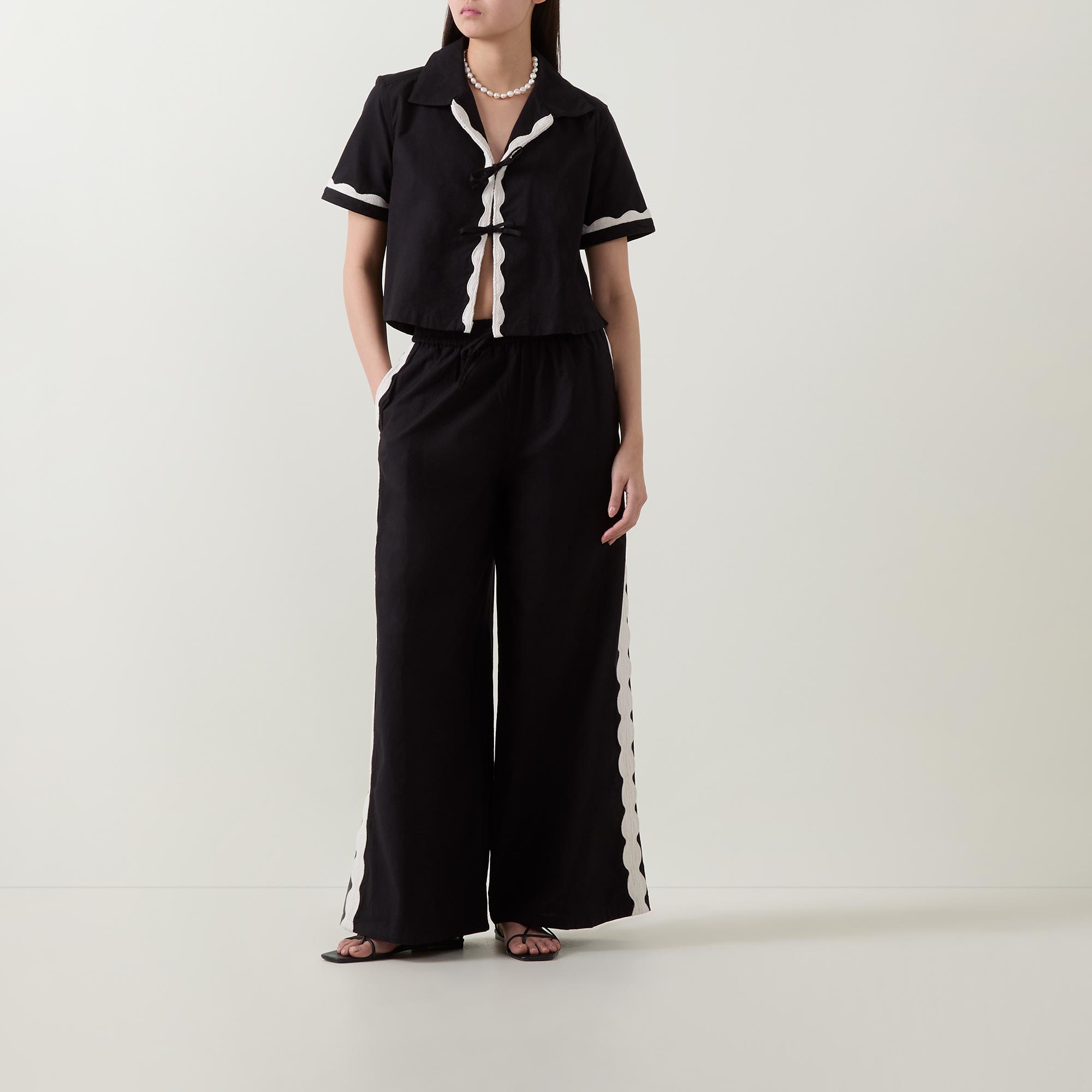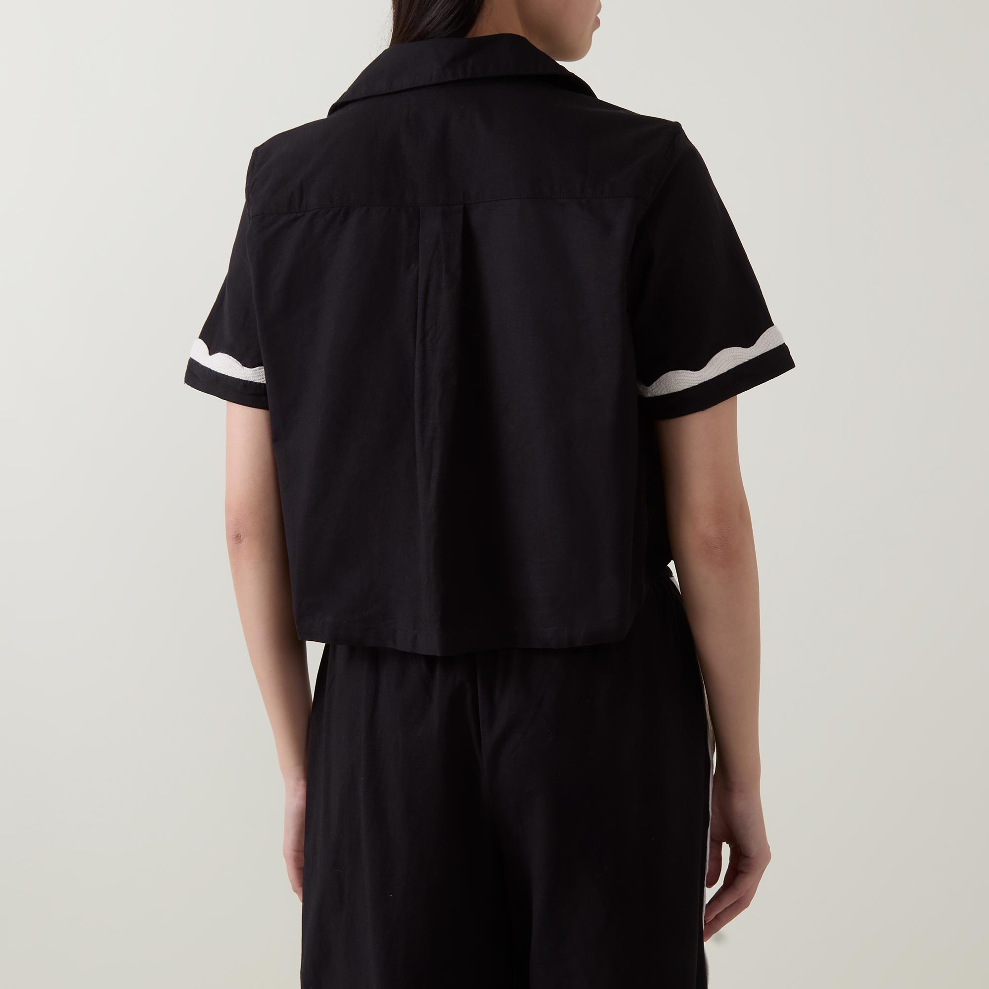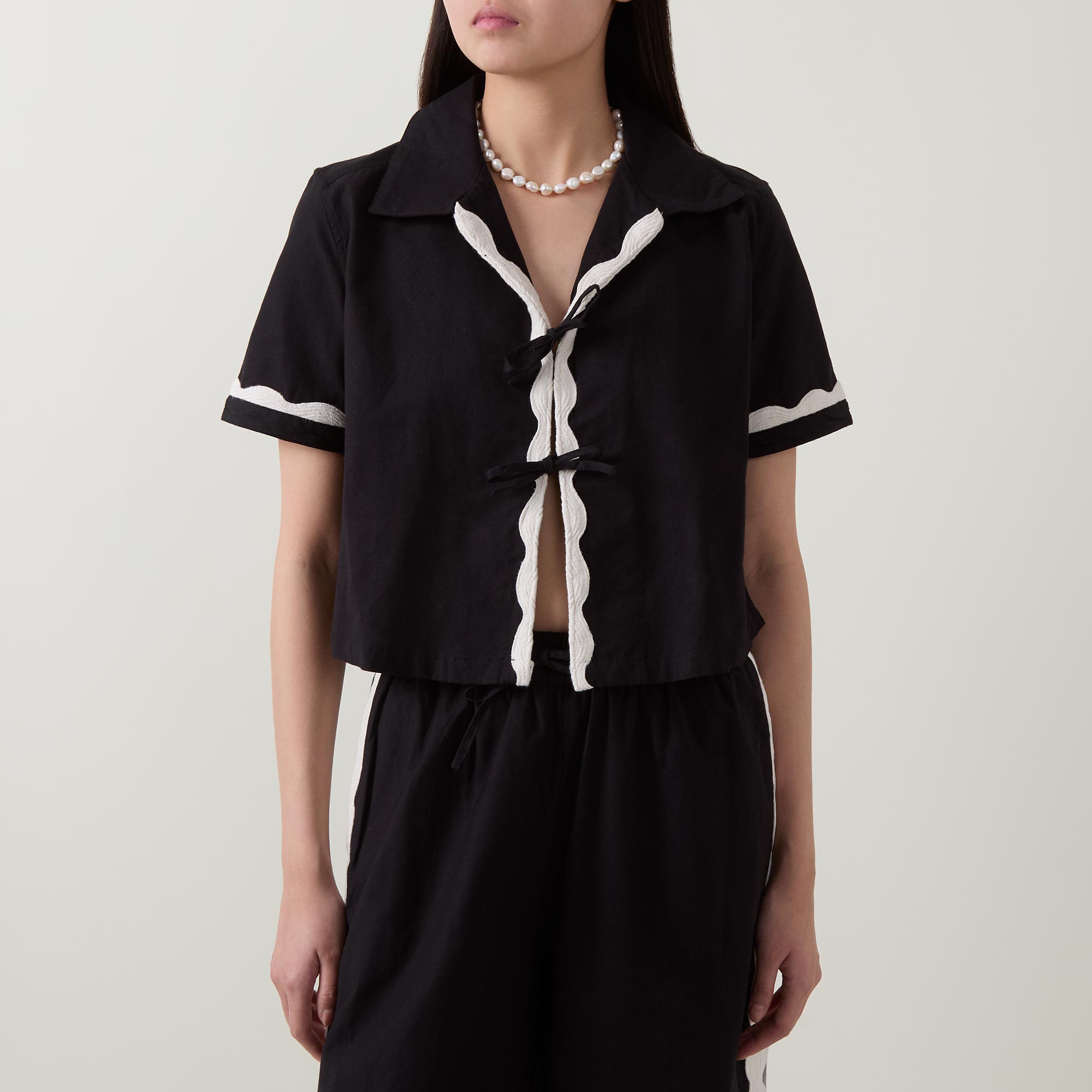 - Spread collar, short sleeves, two tie-fastening bows to the front, contrast trimming, smooth fabric